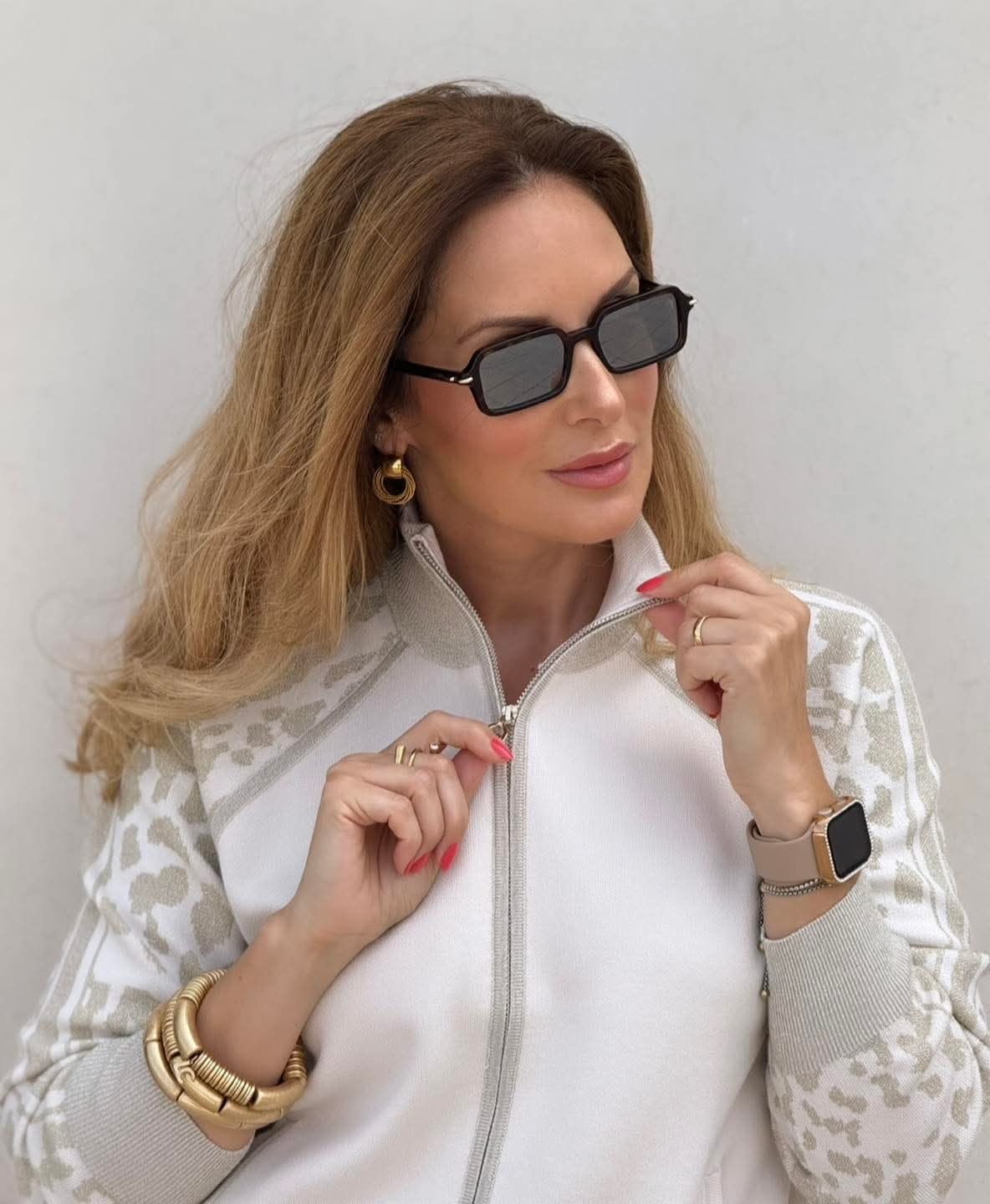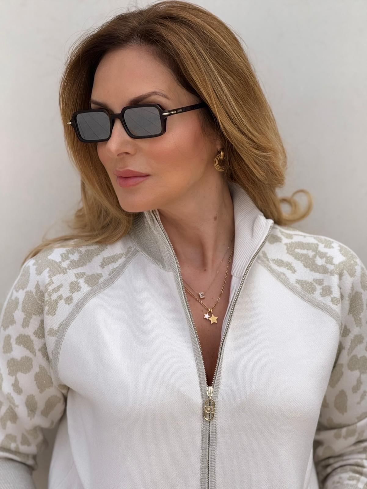 Casaco de fato de treino Liu Jo, confeccionado em malha com mistura de viscose e lurex para um toque macio e brilho subtil. Apresenta estampa jacquard animal print, gola alta, mangas longas raglan e bolsos laterais práticos. Possui logotipo metálico nas costas e puxador de zíper personalizado. Fecho frontal em zíper.