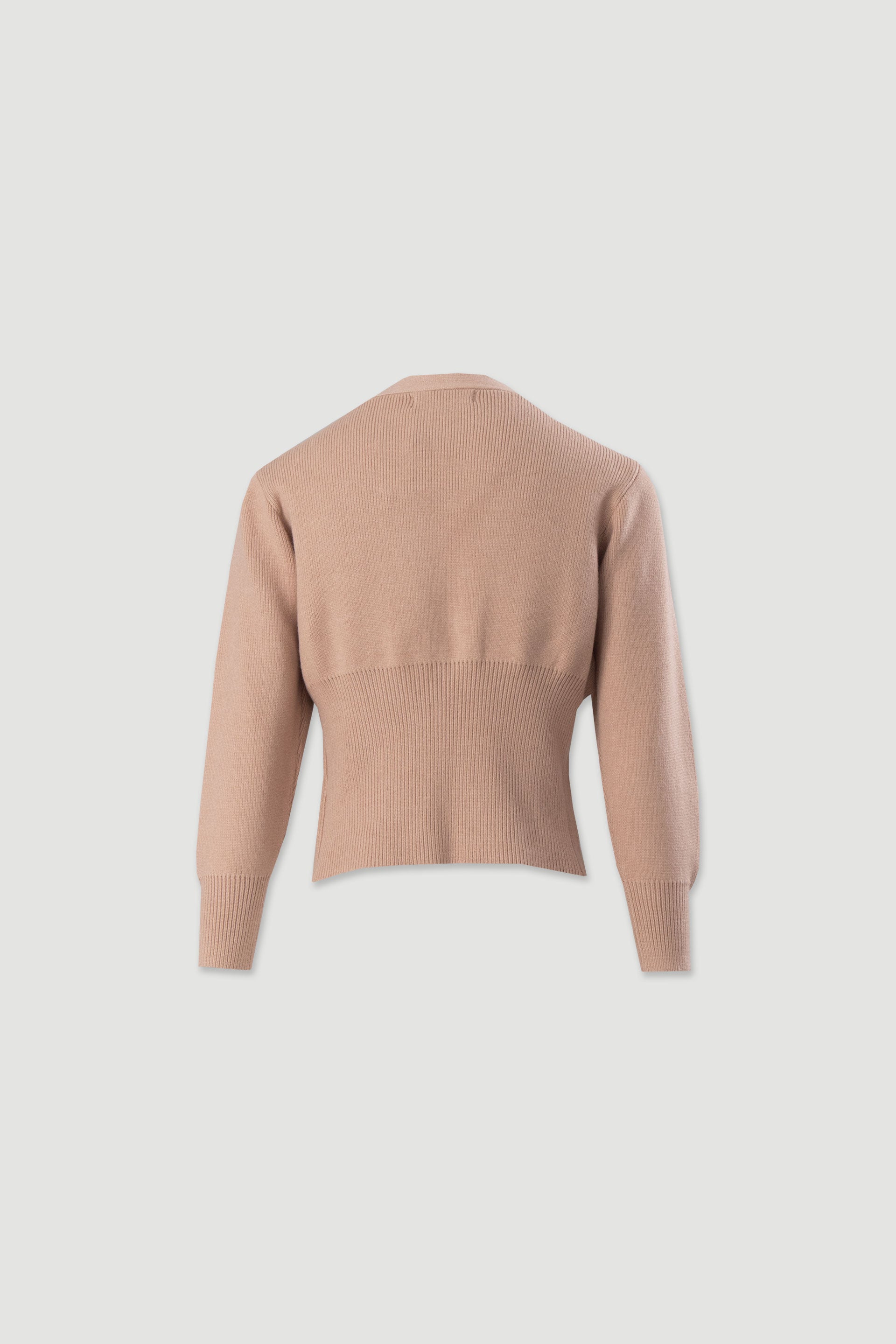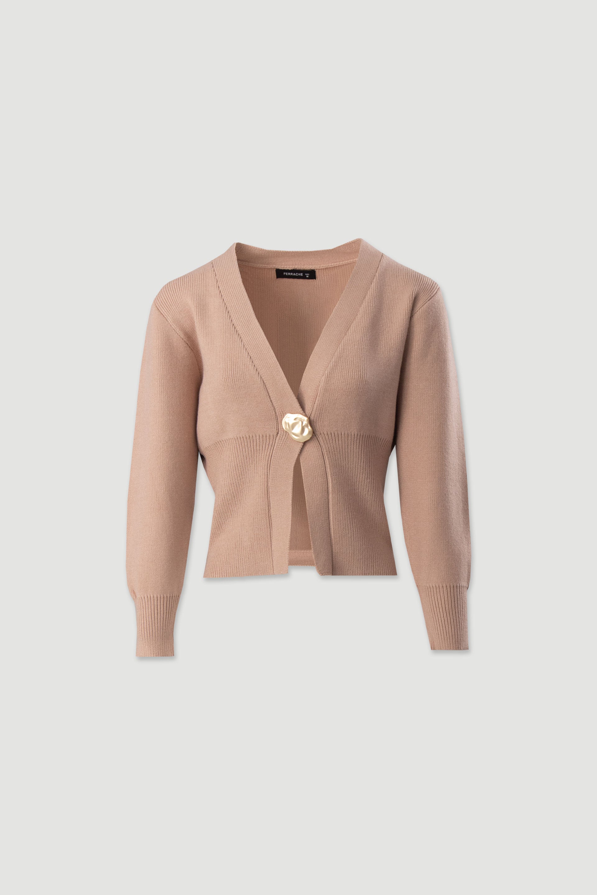 Casaco de malha Ferrache de corte curto e elegante, com decote em V profundo e fecho central com um único botão dourado de destaque. Confeccionado em malha canelada na zona inferior, garante estrutura e conforto. As mangas compridas terminam em punho canelado para um ajuste perfeito.