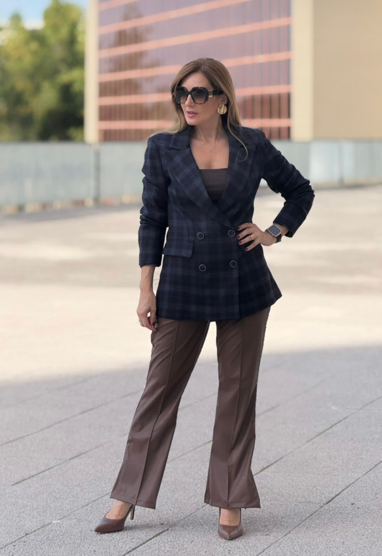 Blazer Mimi Mua com elegante estampado xadrez em tons de azul e preto, ideal para criar looks sofisticados e modernos. Apresenta fecho frontal em trespasse com botões e bolsos laterais com pala, combinando estilo clássico e funcionalidade. Uma peça versátil que valoriza qualquer coordenado de trabalho ou casual-chic.