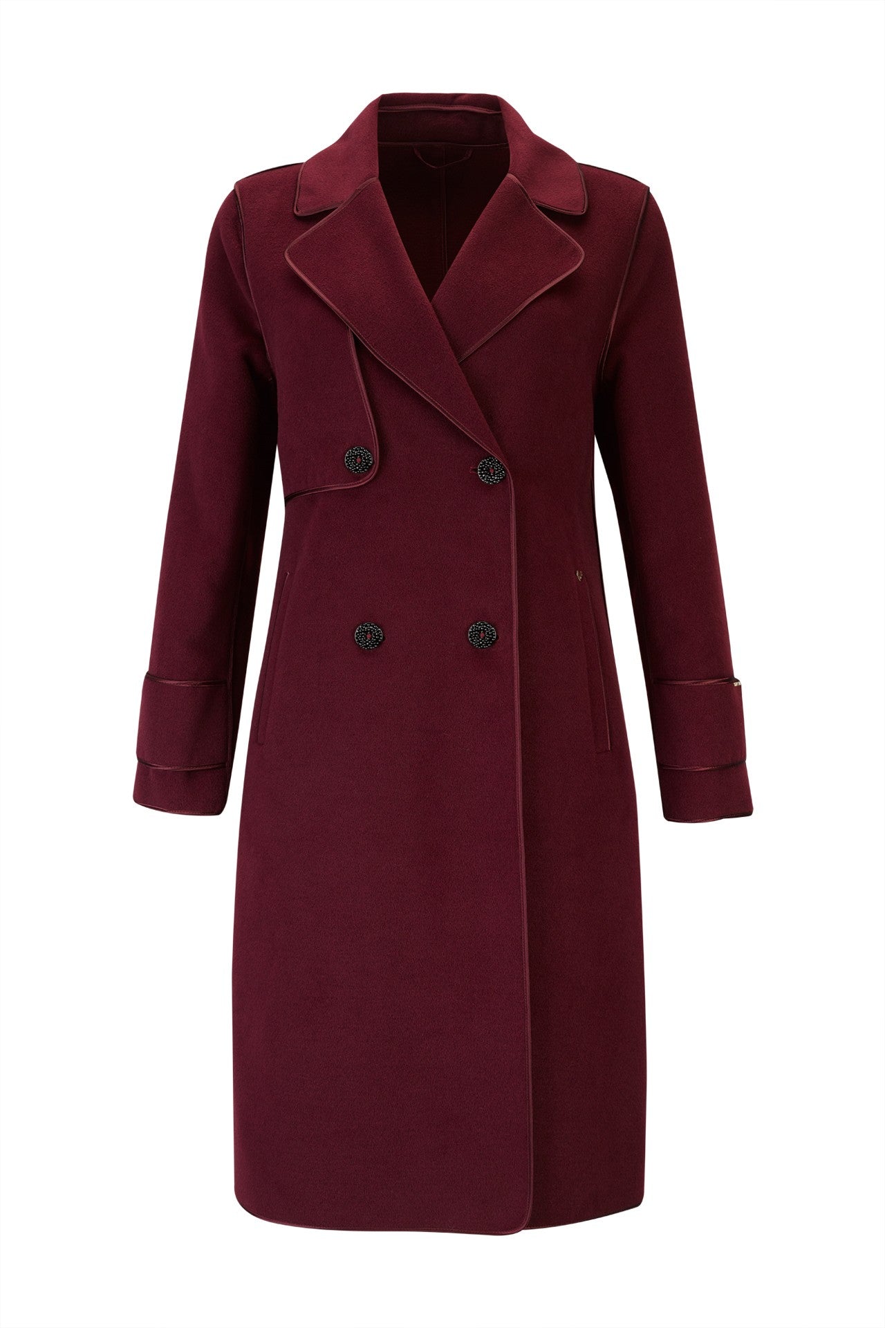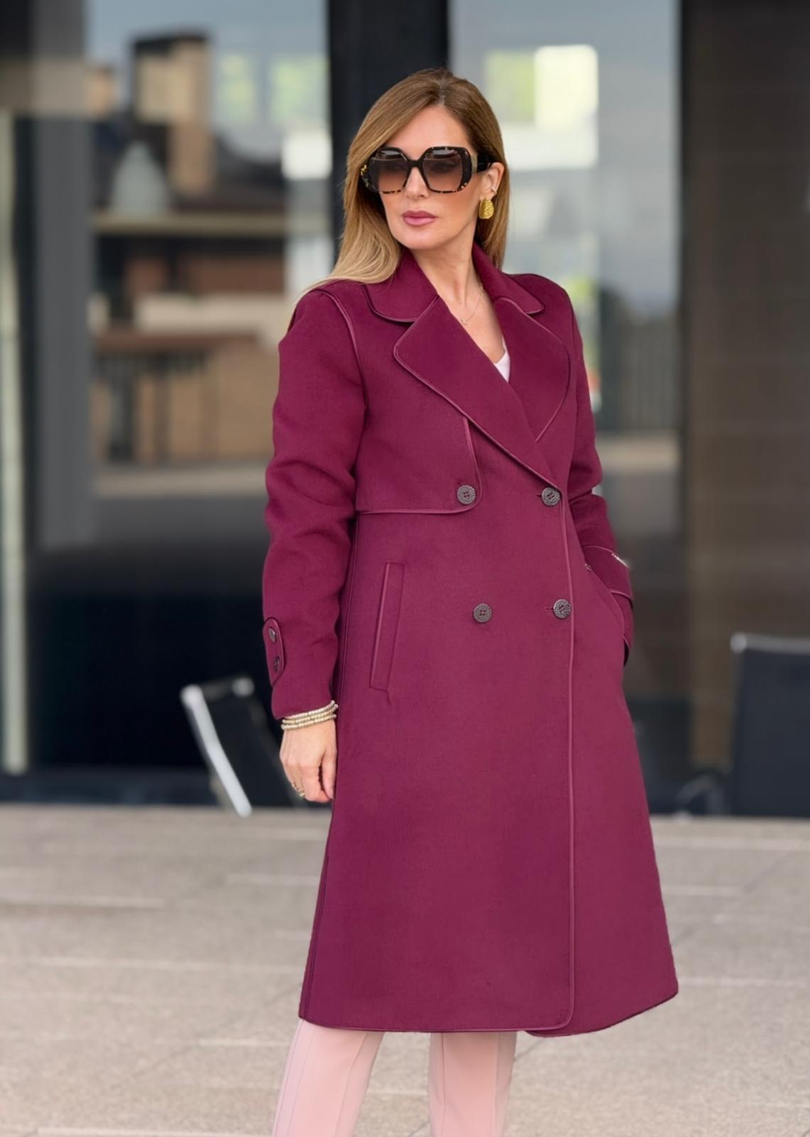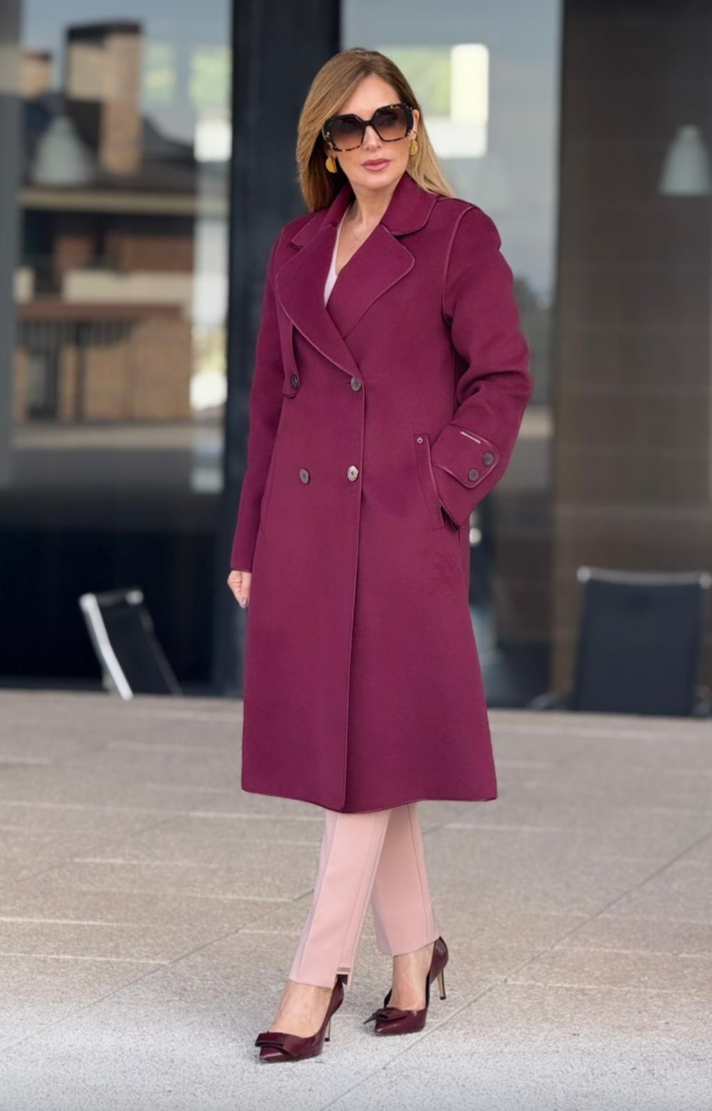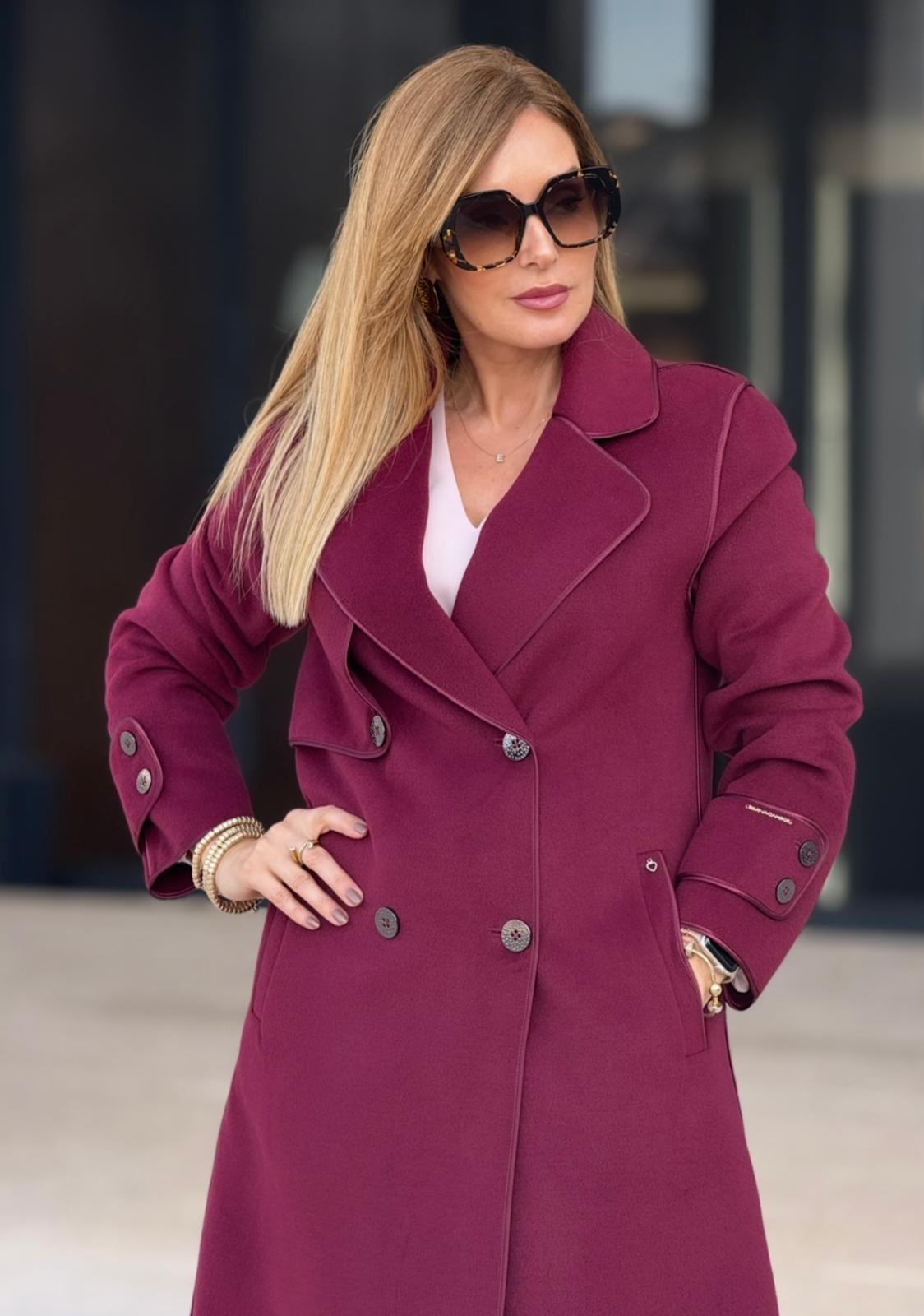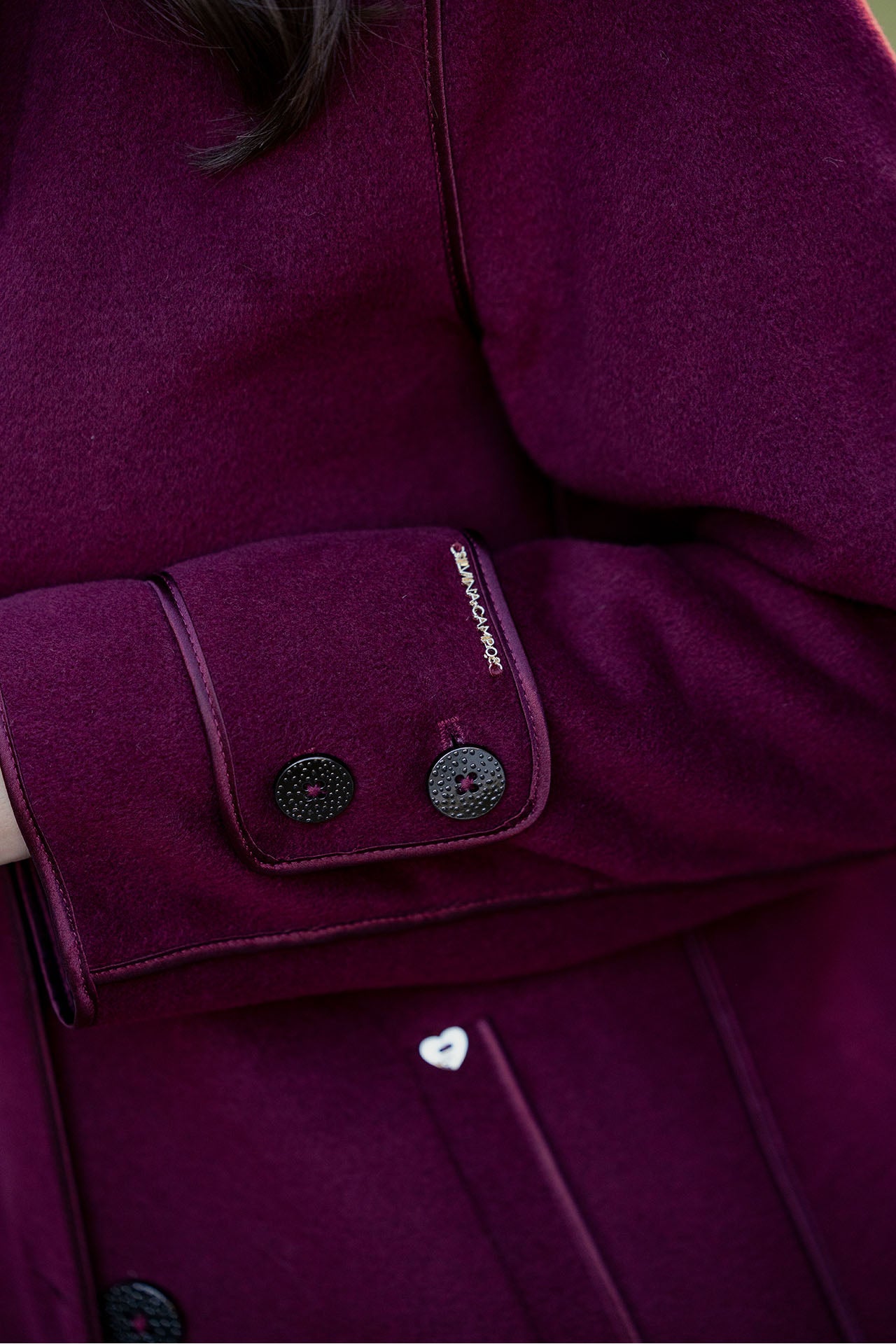 Casaco sobretudo Silvina Campos em fazenda, com corte elegante e detalhes de debruado acetinado que realçam a sofisticação da peça. Possui fecho frontal em trespasse com dois botões e pormenor de botões nos punhos. Um clássico intemporal, perfeito para compor looks elegantes e requintados nos dias frios.
