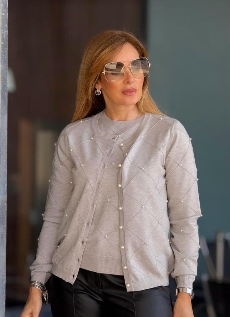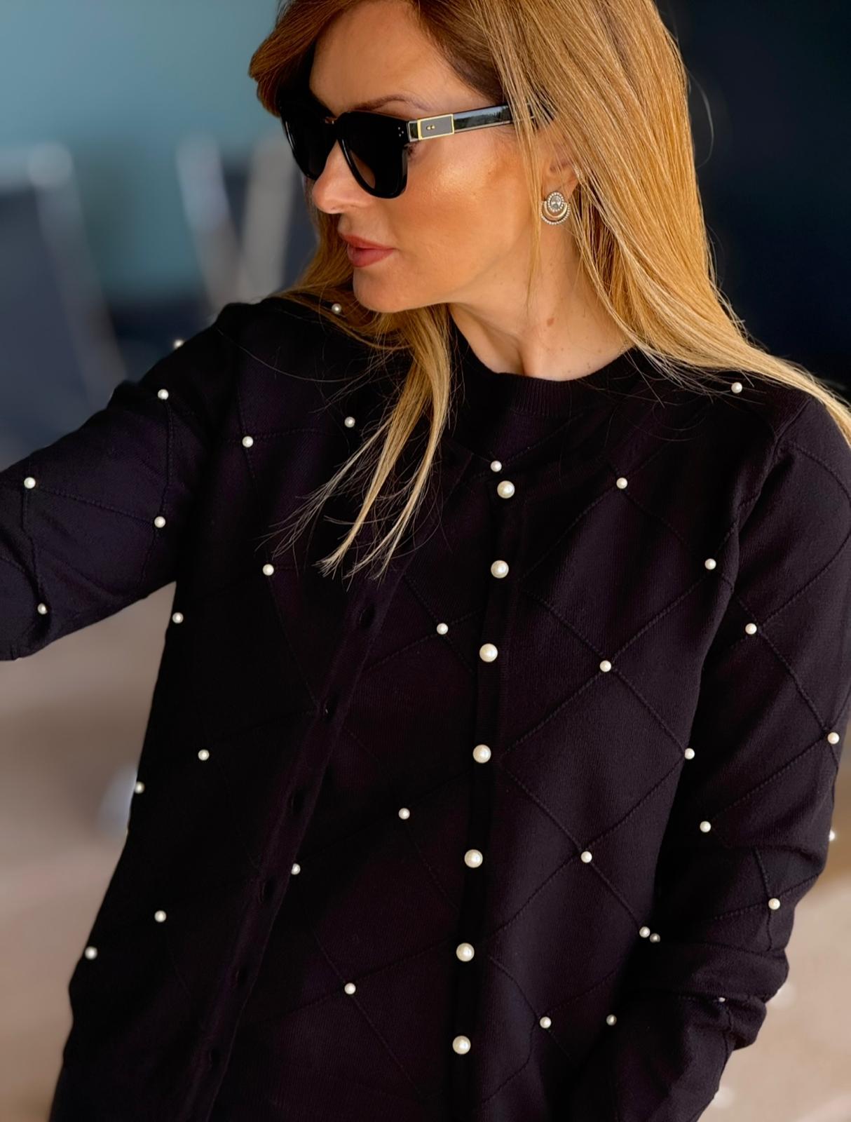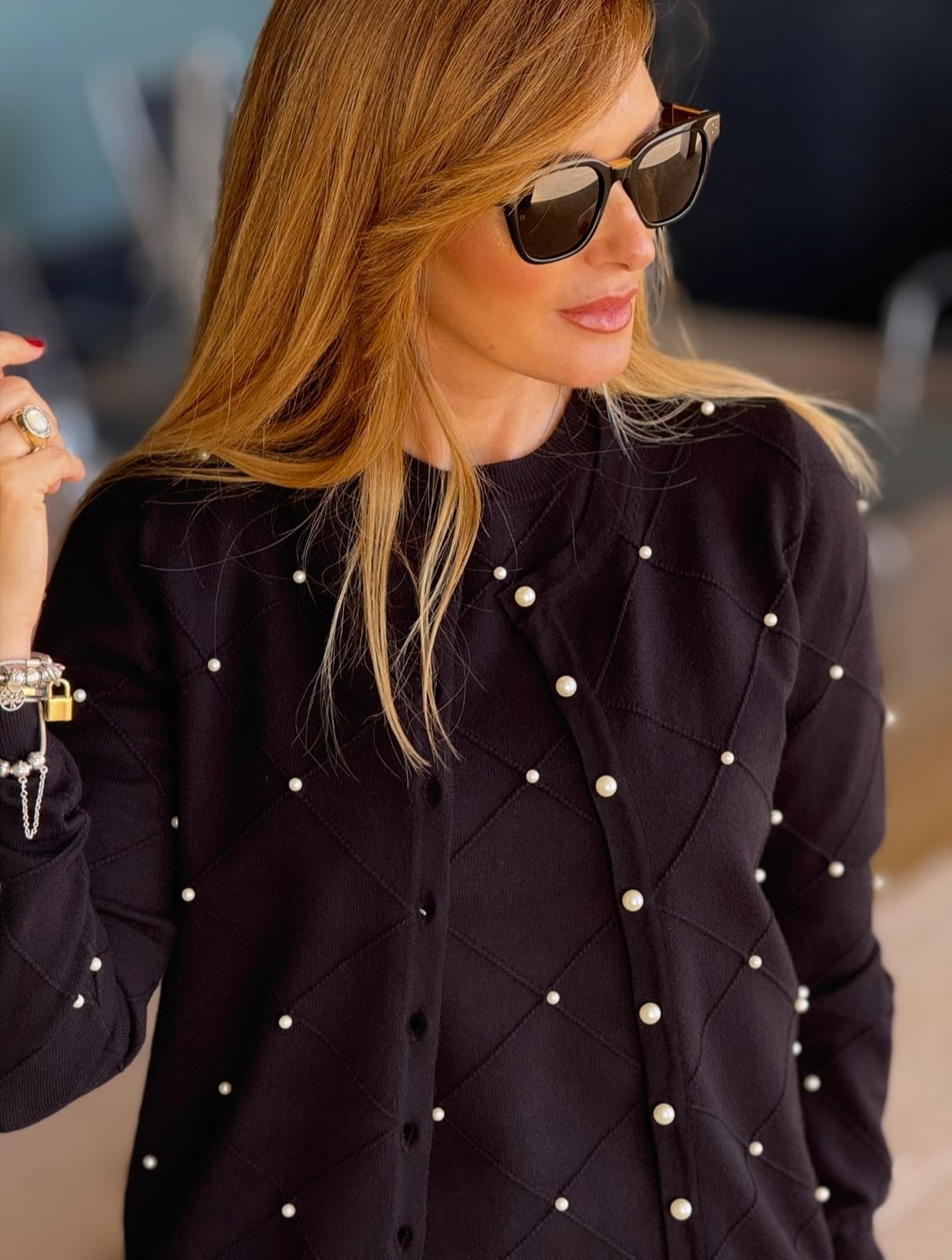 Casaco de malha Silvina Campos da linha Infinito, com detalhes em pérolas delicadas distribuídas por toda a peça com design de losangos, incluindo nos botões, que conferem um toque sofisticado e feminino. Versátil e elegante, pode ser combinado com a camisola da mesma linha para criar um conjunto harmonioso e cheio de charme.