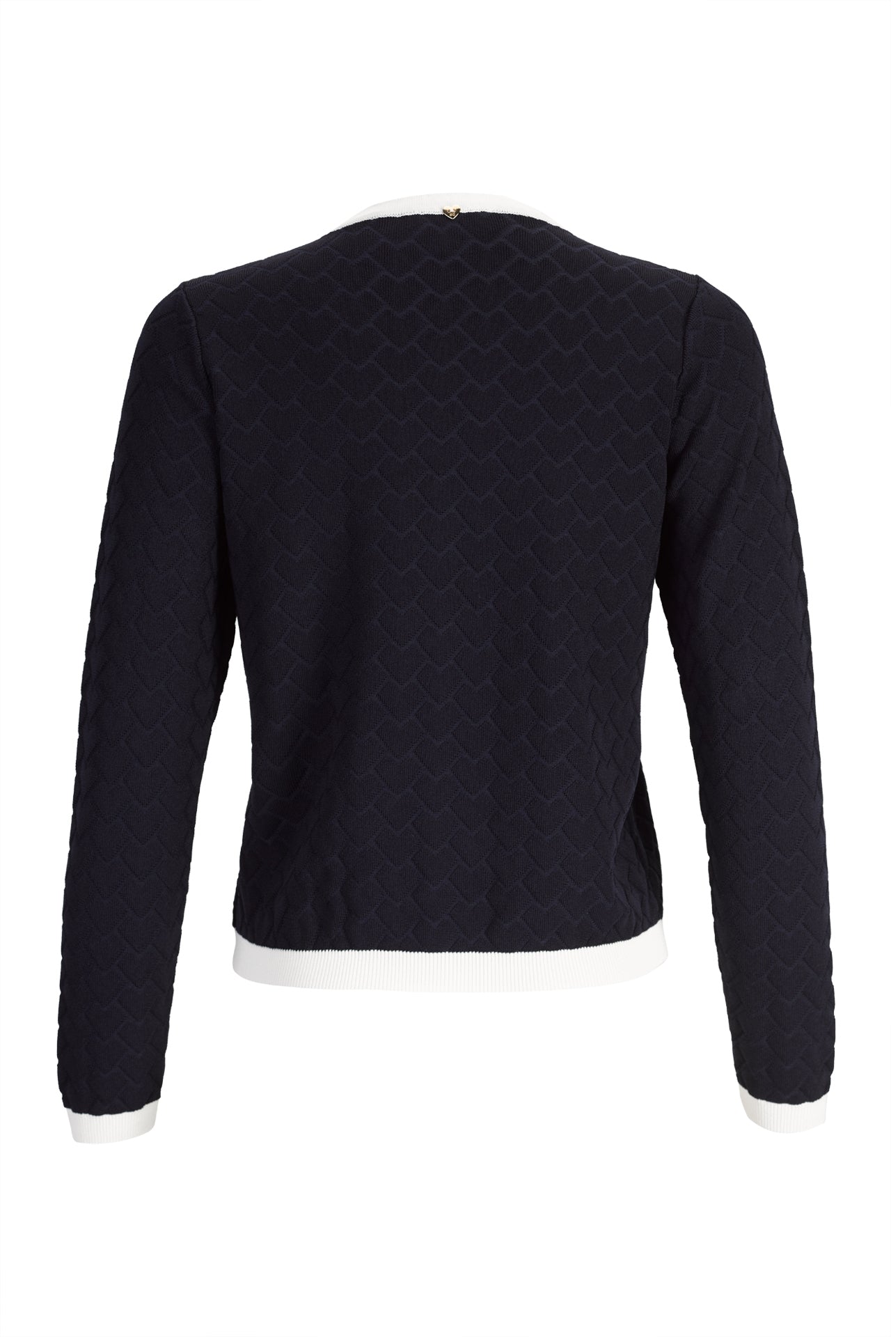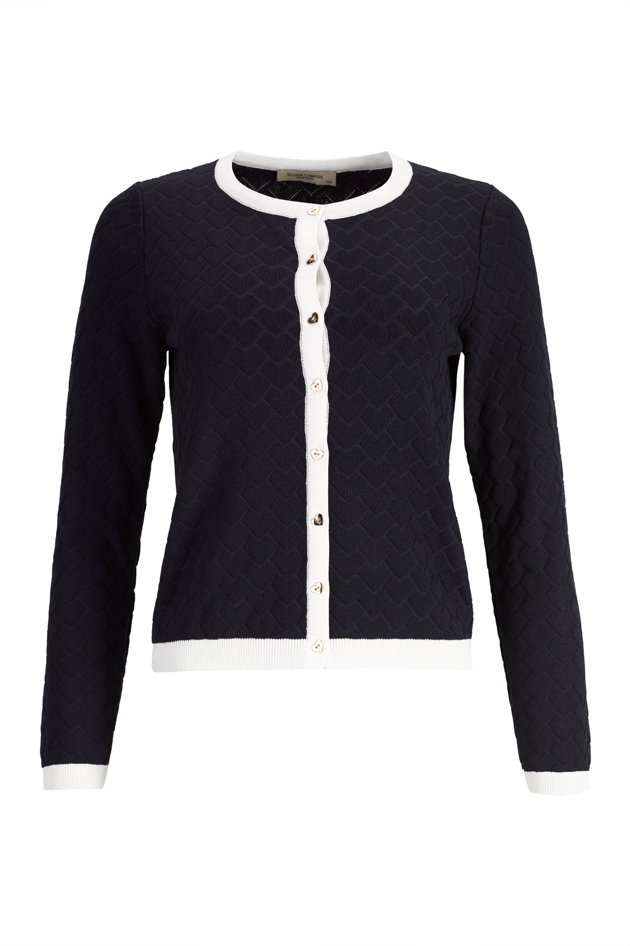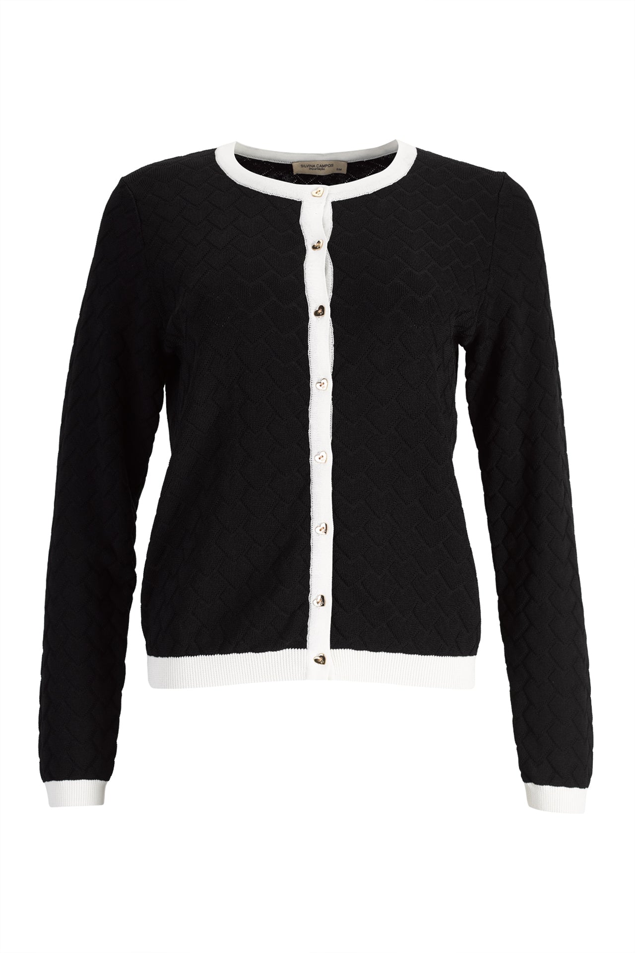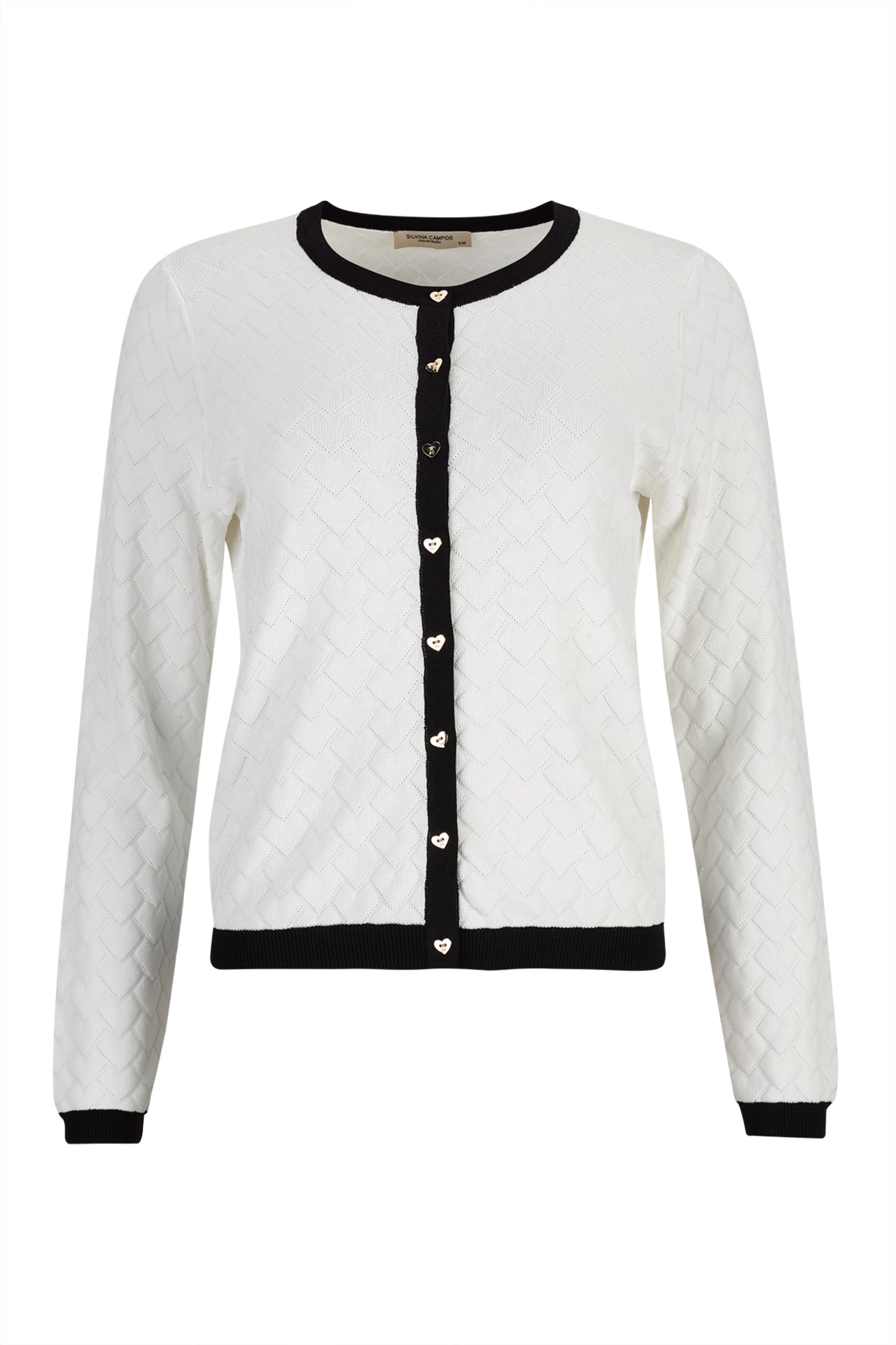 Casaco de malha Silvina Campos da linha Infinito, com decote redondo e mangas compridas para conforto acolhedor. Padrão jacquard texturizado, realçado por acabamentos contrastantes no decote, carcela, punhos e bainha. Fecho com botões em formato de coração adiciona um detalhe delicado e único à peça versátil.