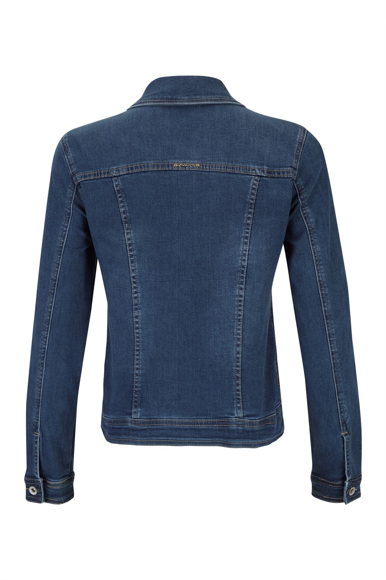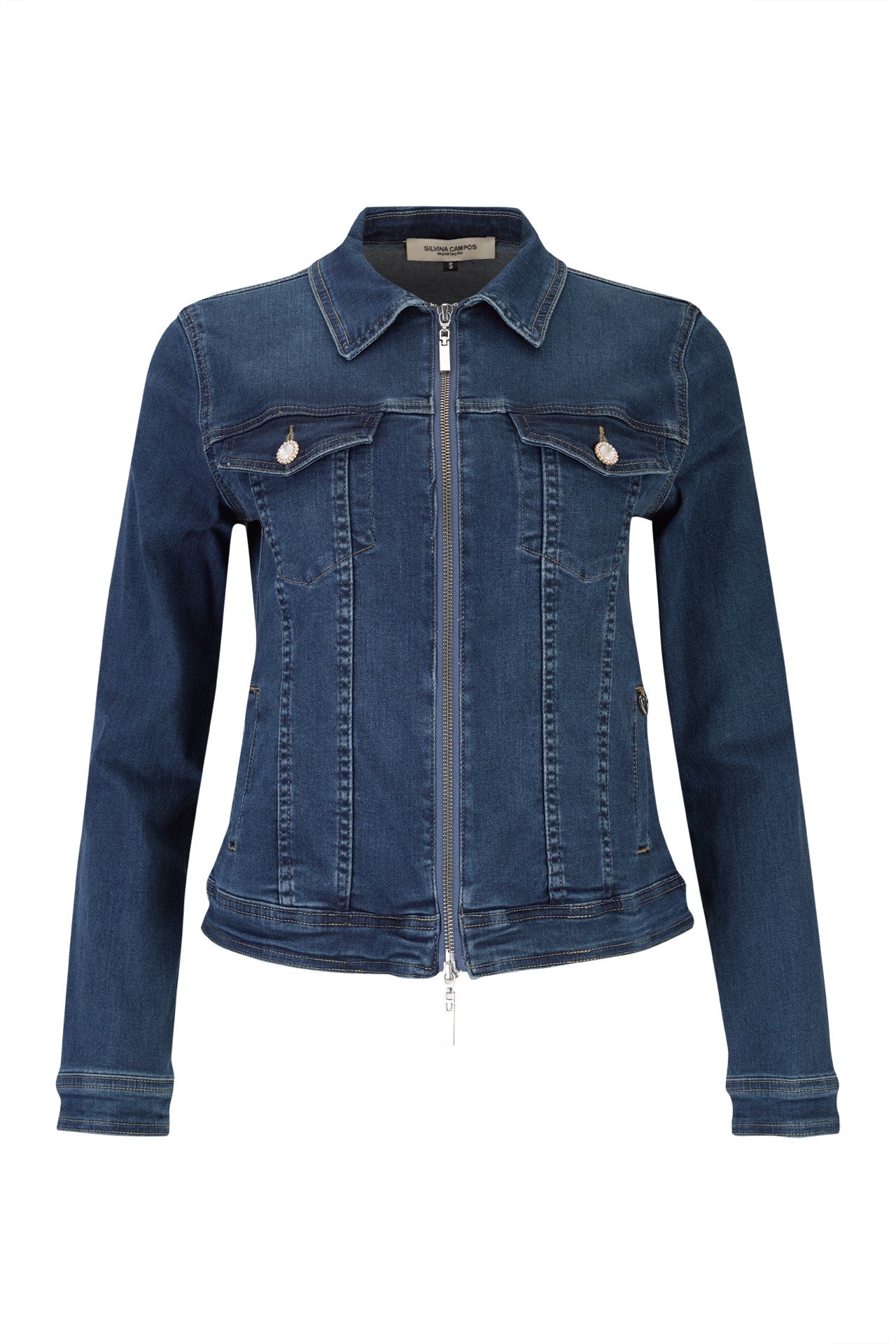 Casaco de ganga Silvina Campos apresenta um corte curto e cintado. Este modelo aperta na frente com fecho metálico, tem 2 bolsos laterais de chapa e dois bolsos de lapela com brilhantes.