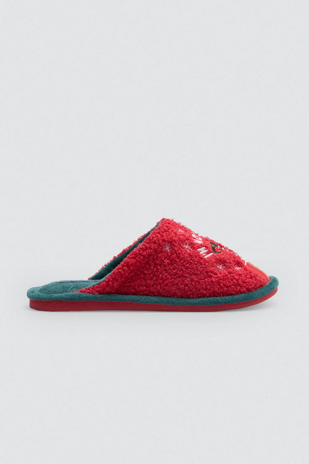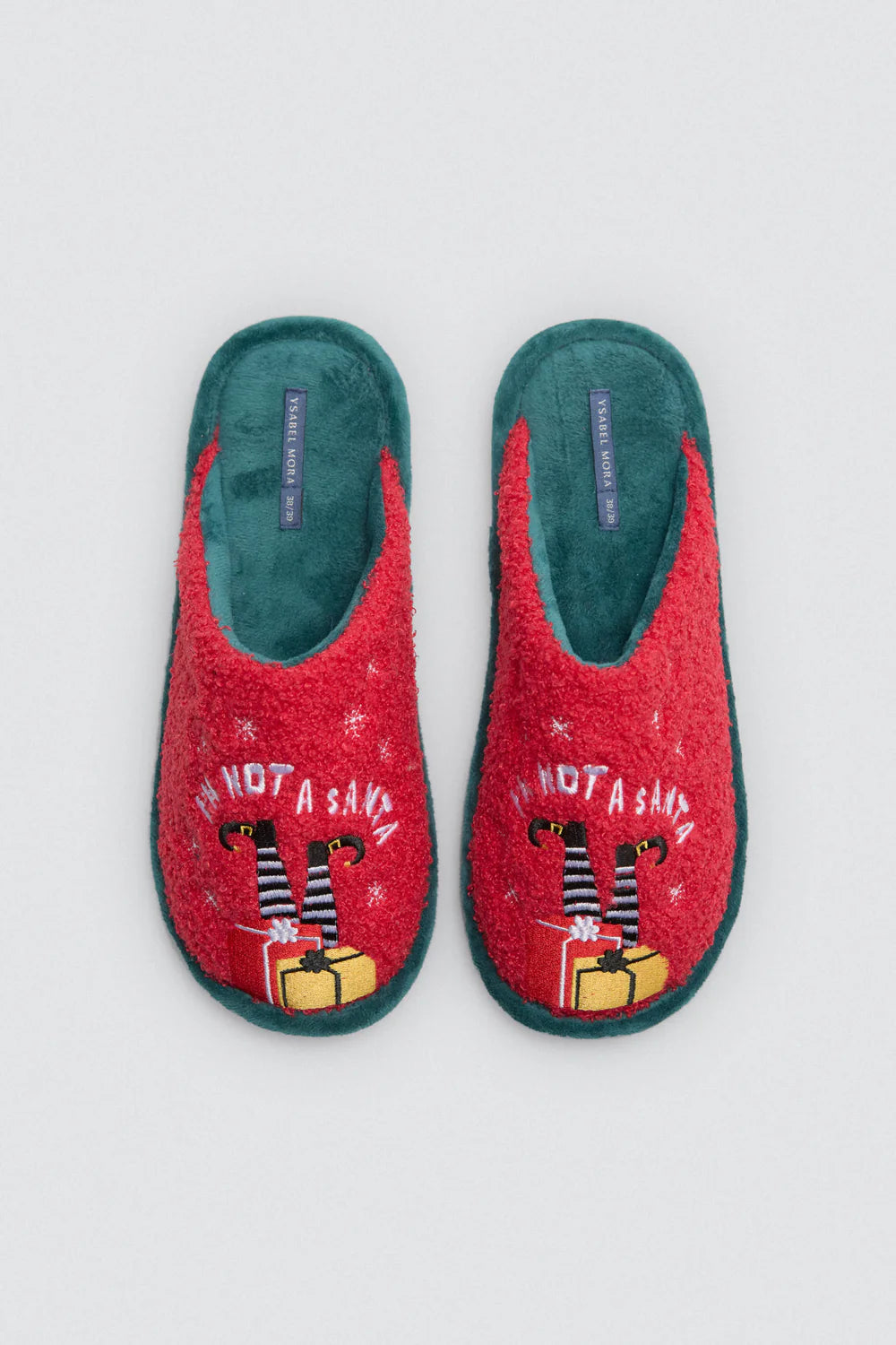 Chinelo Ysabel Mora com exterior em tecido atoalhado macio e interior quente e confortável. Apresenta um estampado divertido de Natal, perfeito para dar um toque festivo e aconchegante aos dias frios.