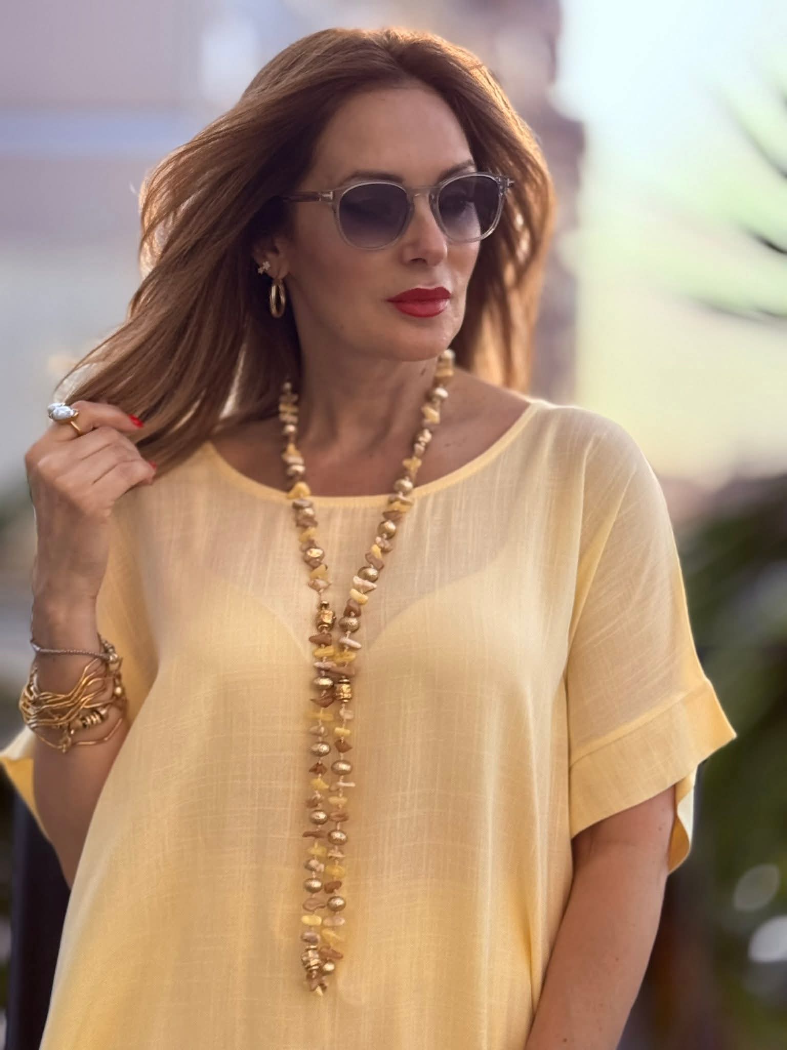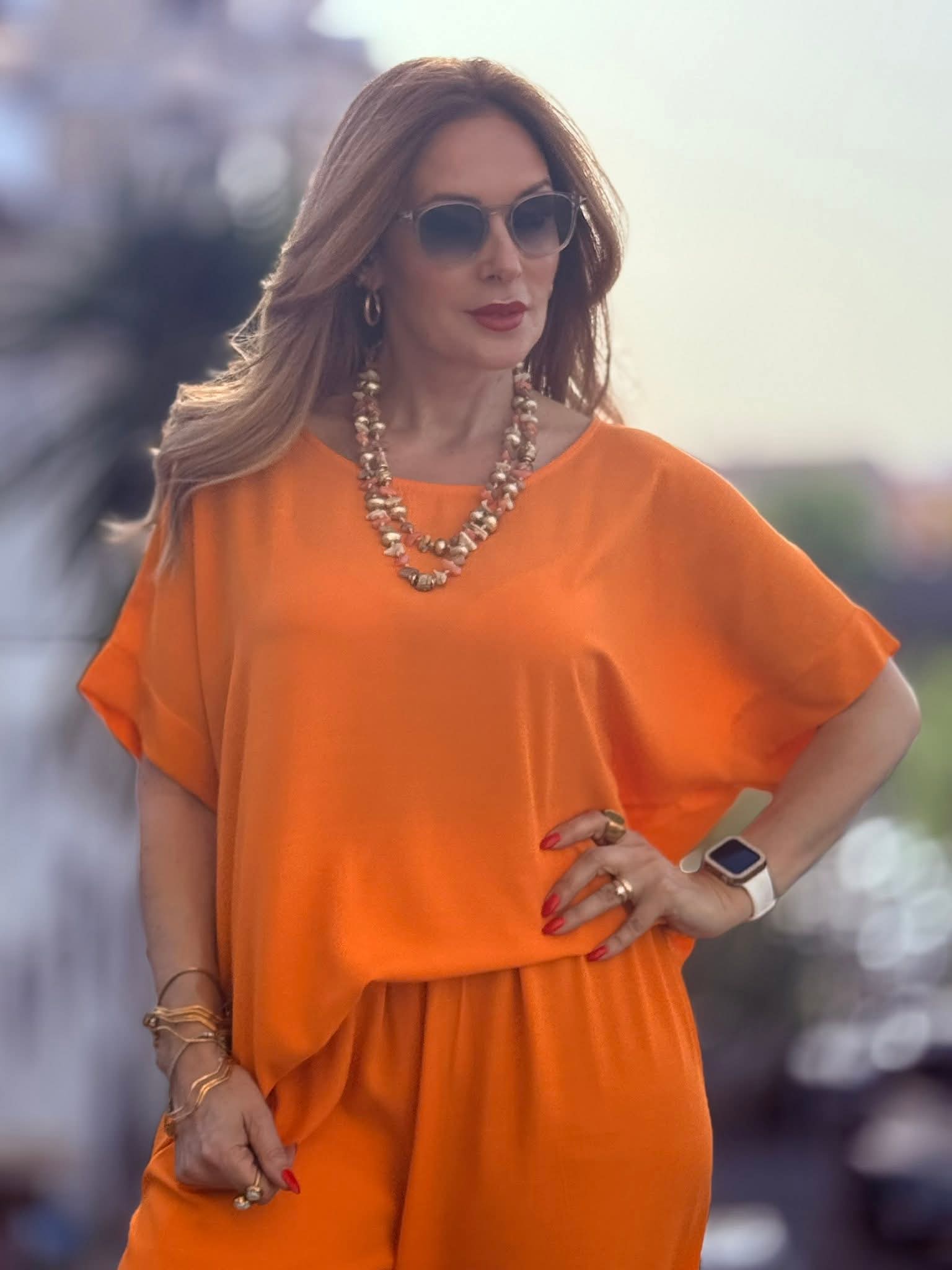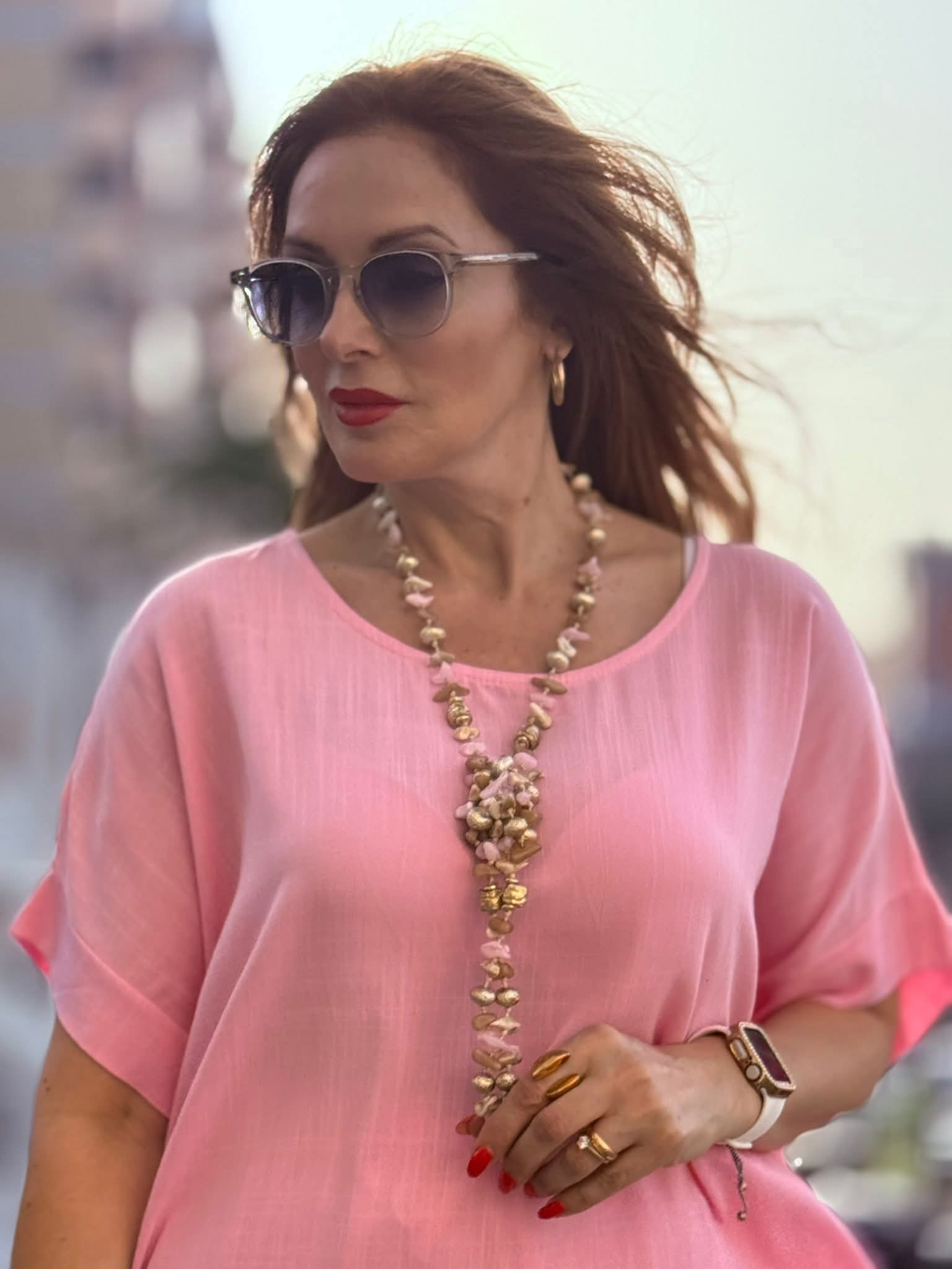 O colar comprido Akky apresenta missangas coloridas distribuídas ao longo de um fio de comprimento generoso, criando uma peça de presença visual imediata e carácter artesanal marcado. A paleta de cores confere vivacidade e expressão ao look, funcionando como ponto focal em composições simples ou como complemento de conjuntos com padrão discreto. O comprimento permite usá-lo solto para um efeito mais descontraído ou dobrado para uma leitura mais composta e versátil. Um acessório que reflete a abordagem criativa e a identidade autêntica da Akky na construção de peças com cor, textura e personalidade própria.