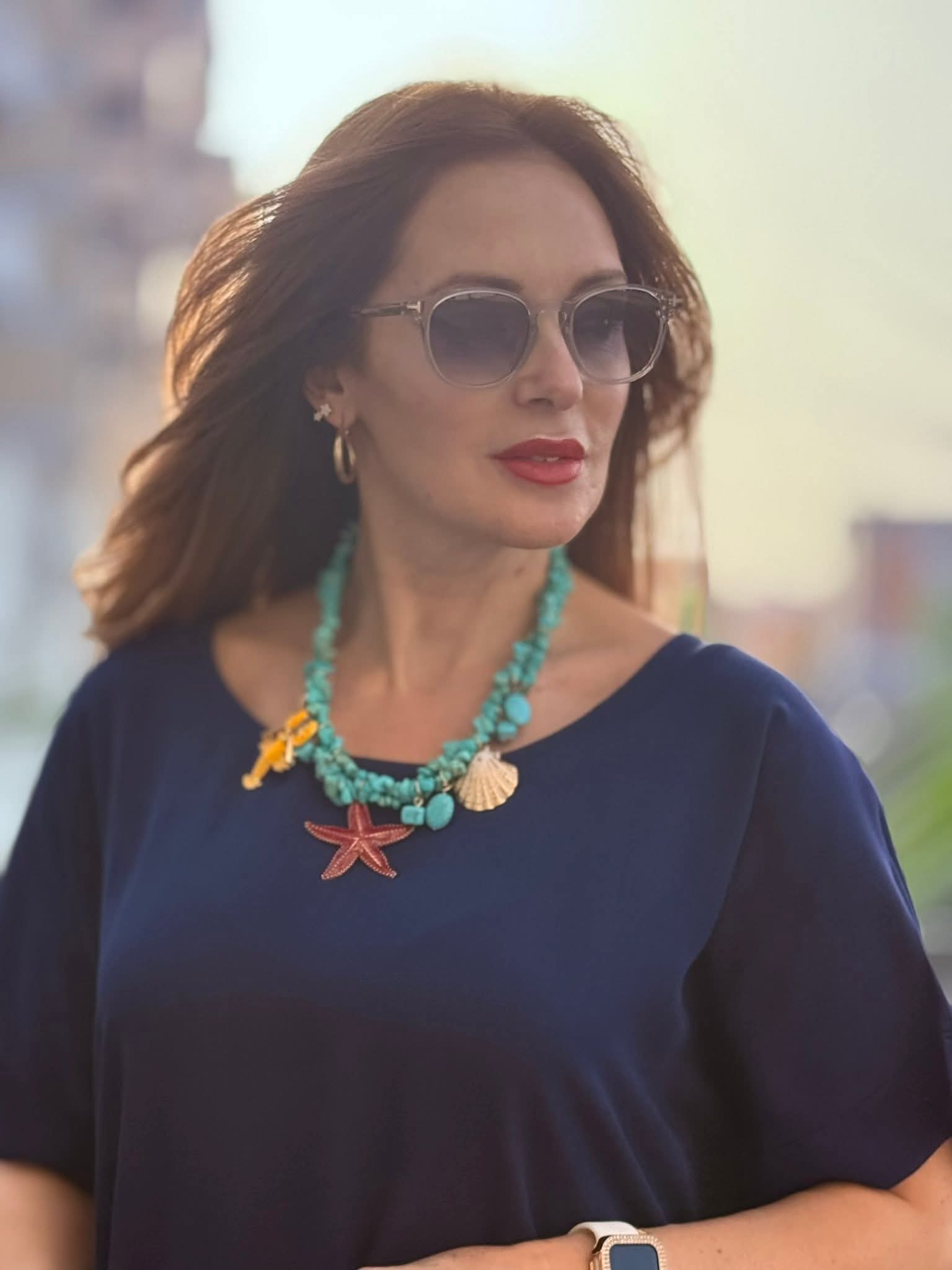 O colar Akky apresenta uma composição dupla de comprimento curto que combina missangas irregulares com pendentes de inspiração marítima, criando uma peça com carácter artesanal e identidade própria. A irregularidade das missangas confere textura e movimento natural, enquanto os pendentes alusivos ao mar introduzem um simbolismo subtil e uma estética que evoca o litoral com elegância. Versátil o suficiente para acompanhar looks de verão ou composições mais casuais com presença, este colar funciona como peça de destaque ou em sobreposição com outras joias. Um acessório que reflete a sensibilidade criativa da Akky na construção de peças com alma e detalhe.