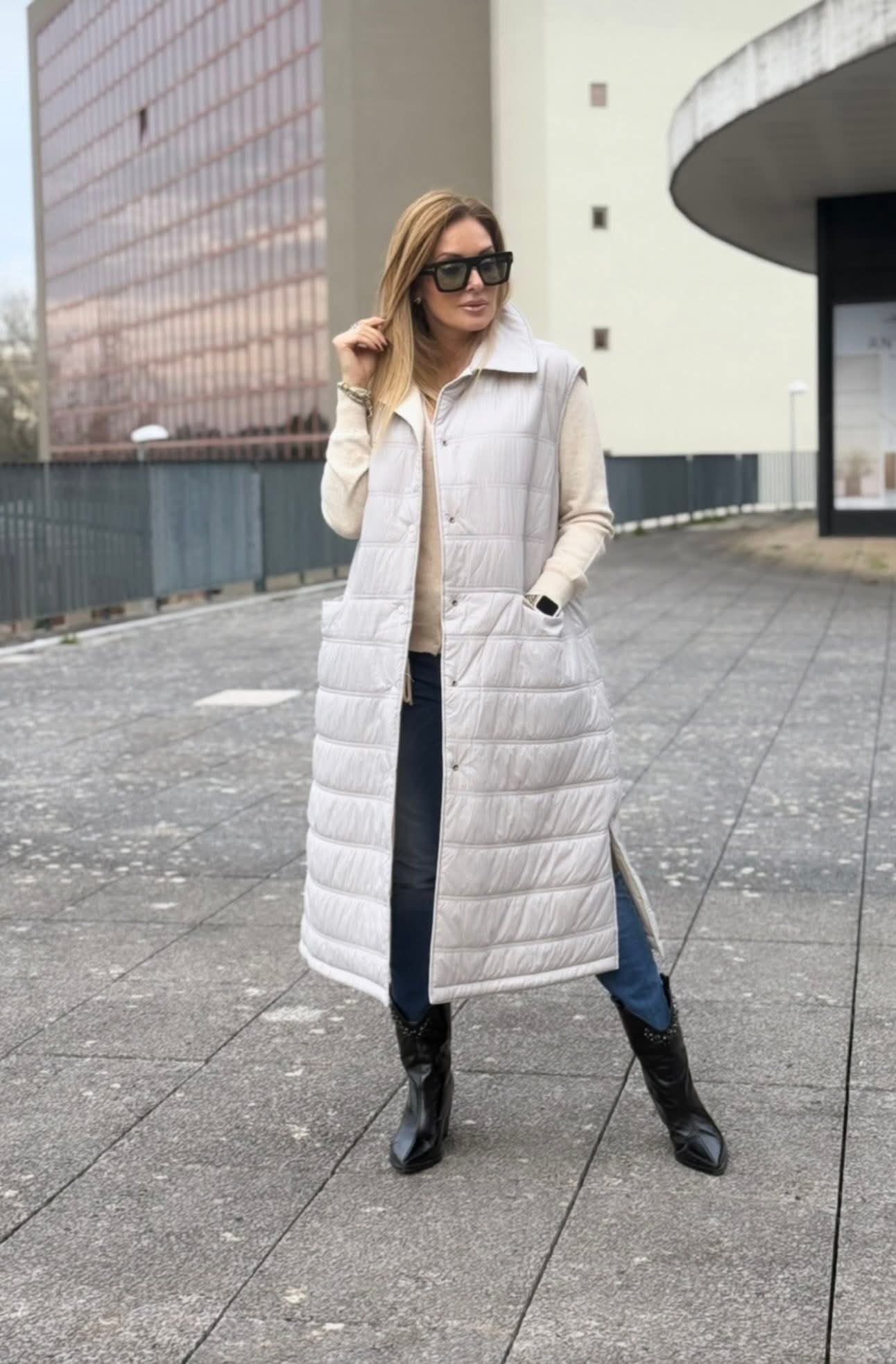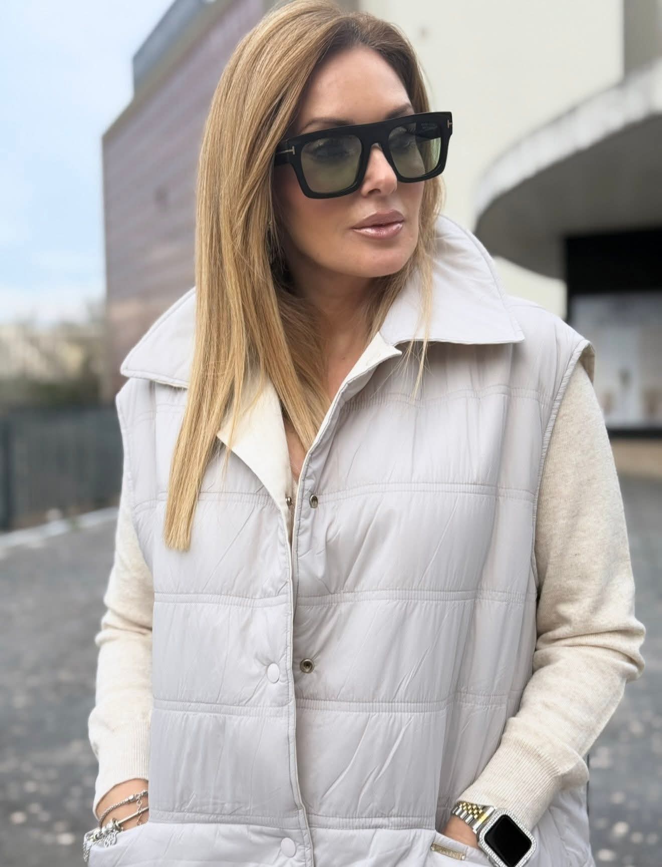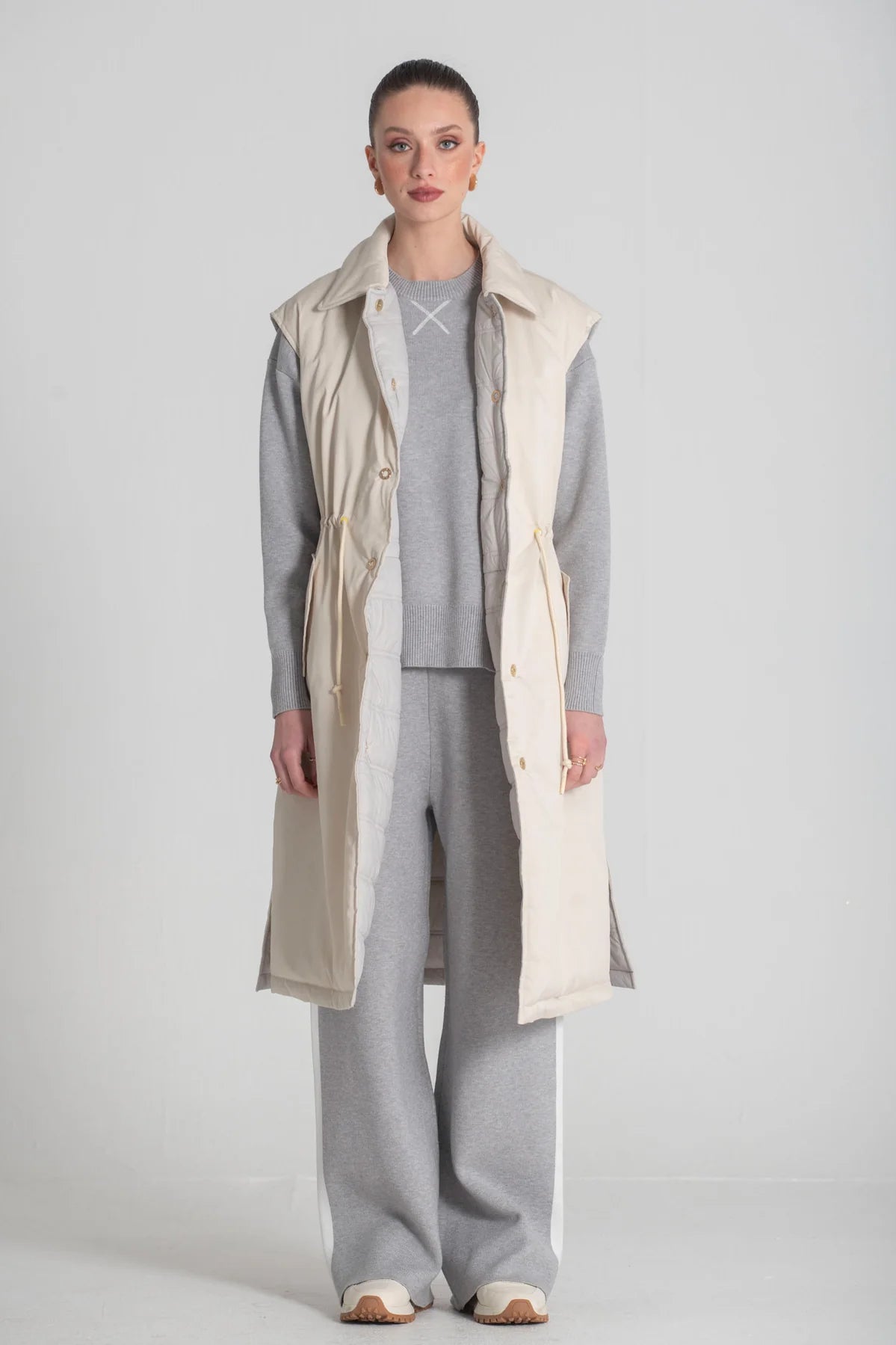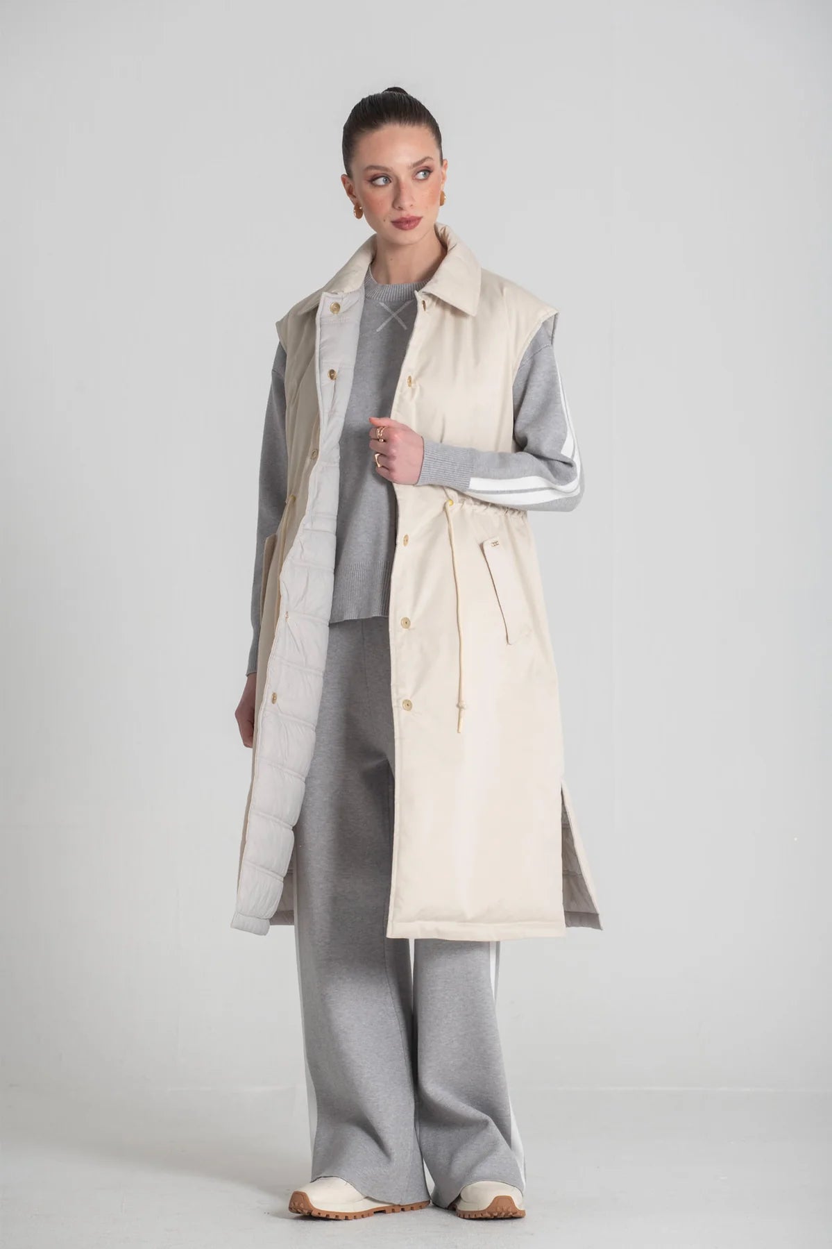 Colete comprido Foursoul reversível, com um lado liso equipado com atilhos ajustáveis na cintura e bolsos laterais, e o outro acolchoado para maior conforto. Fecho de molas de pressão que garante praticidade. Versátil e ideal para completar looks modernos.