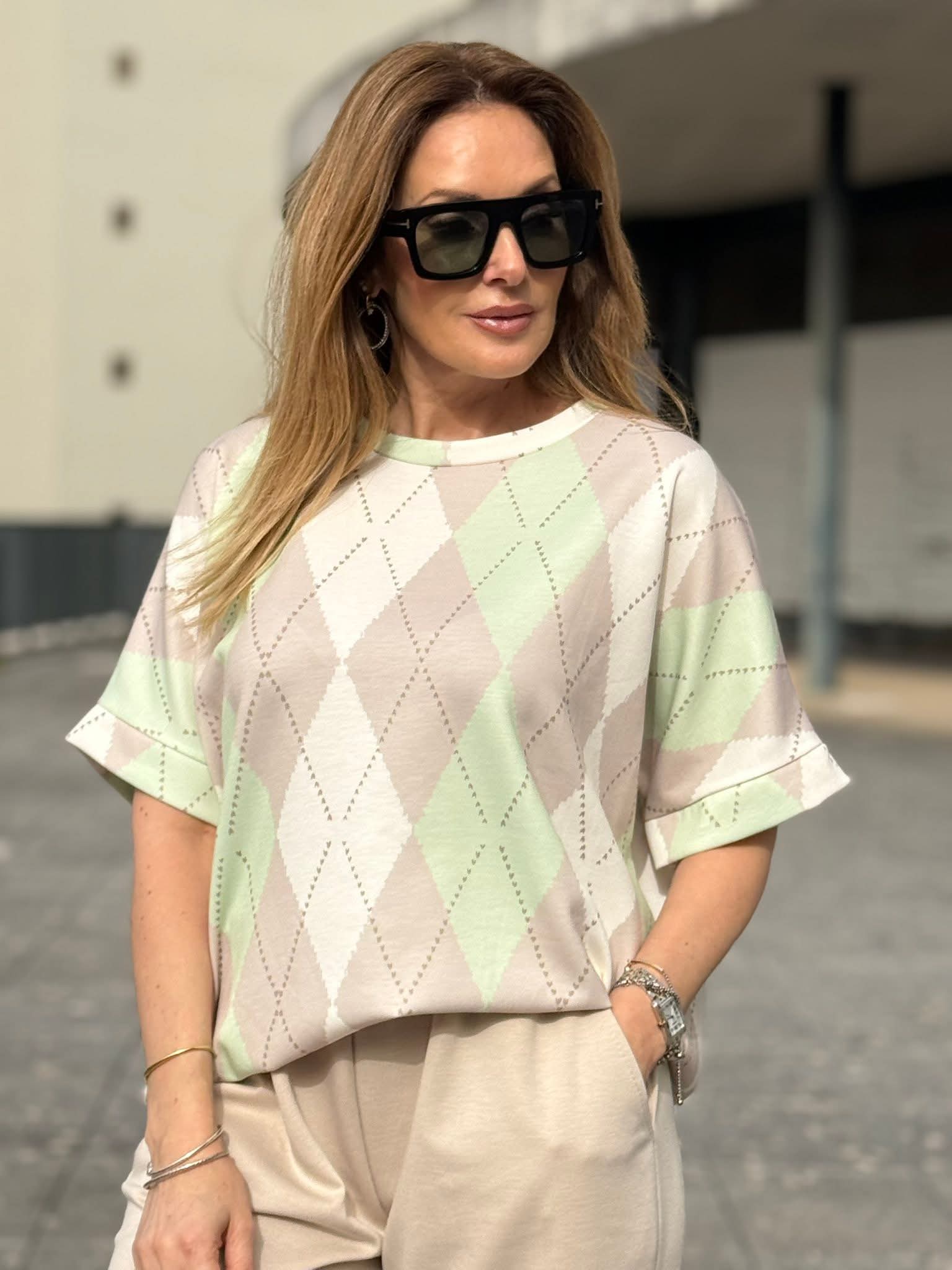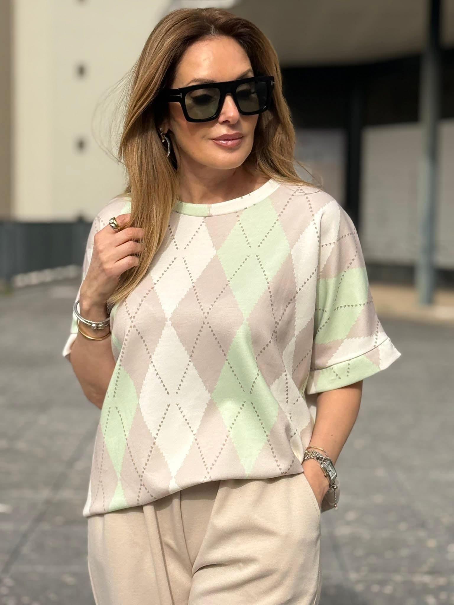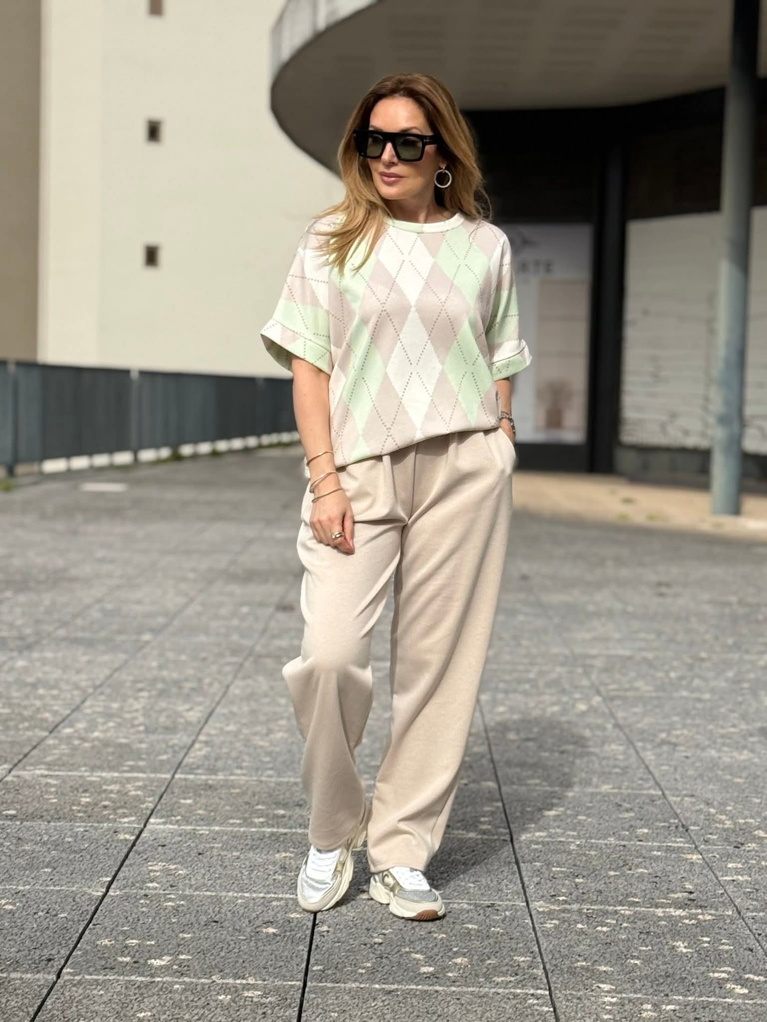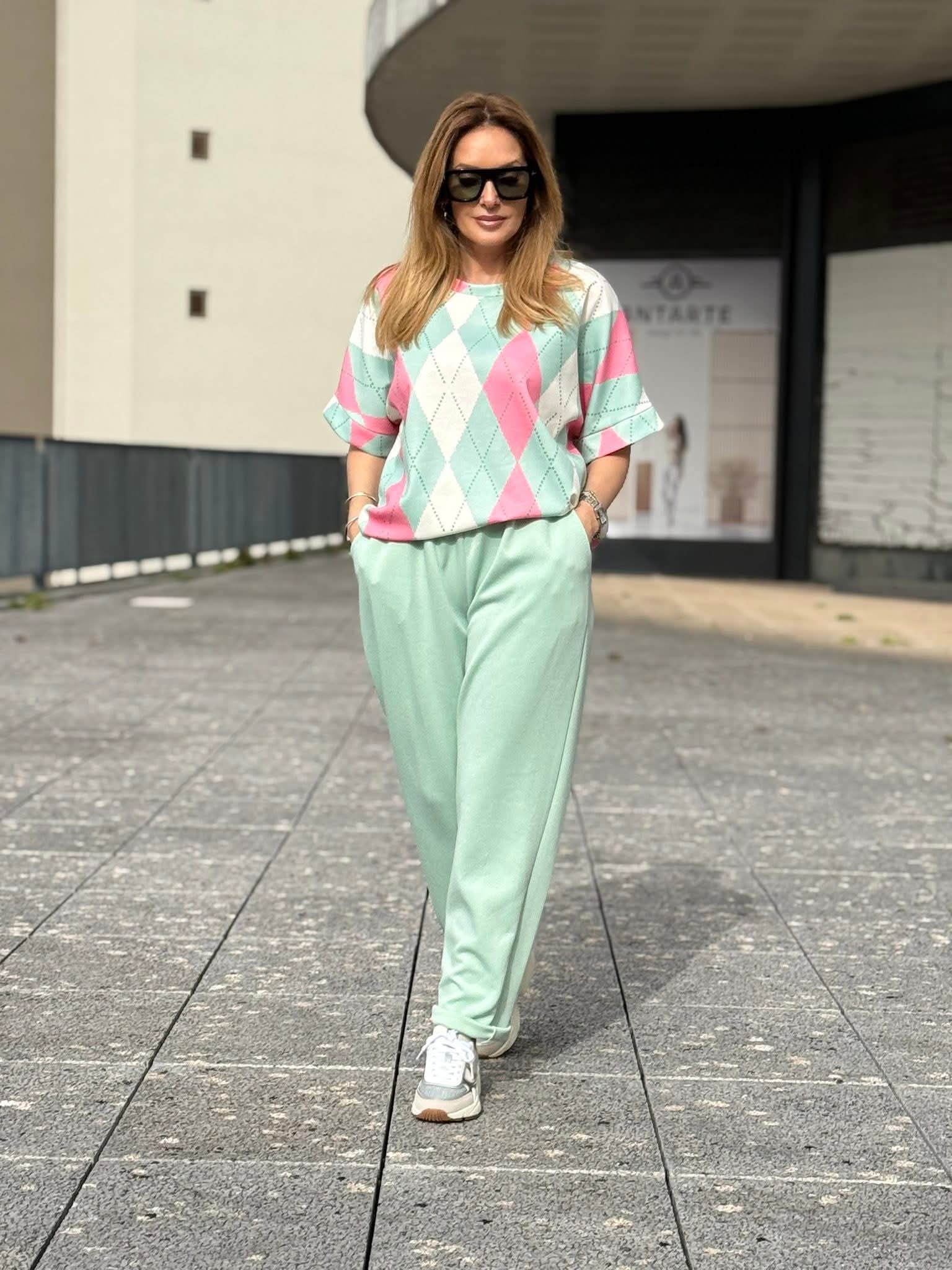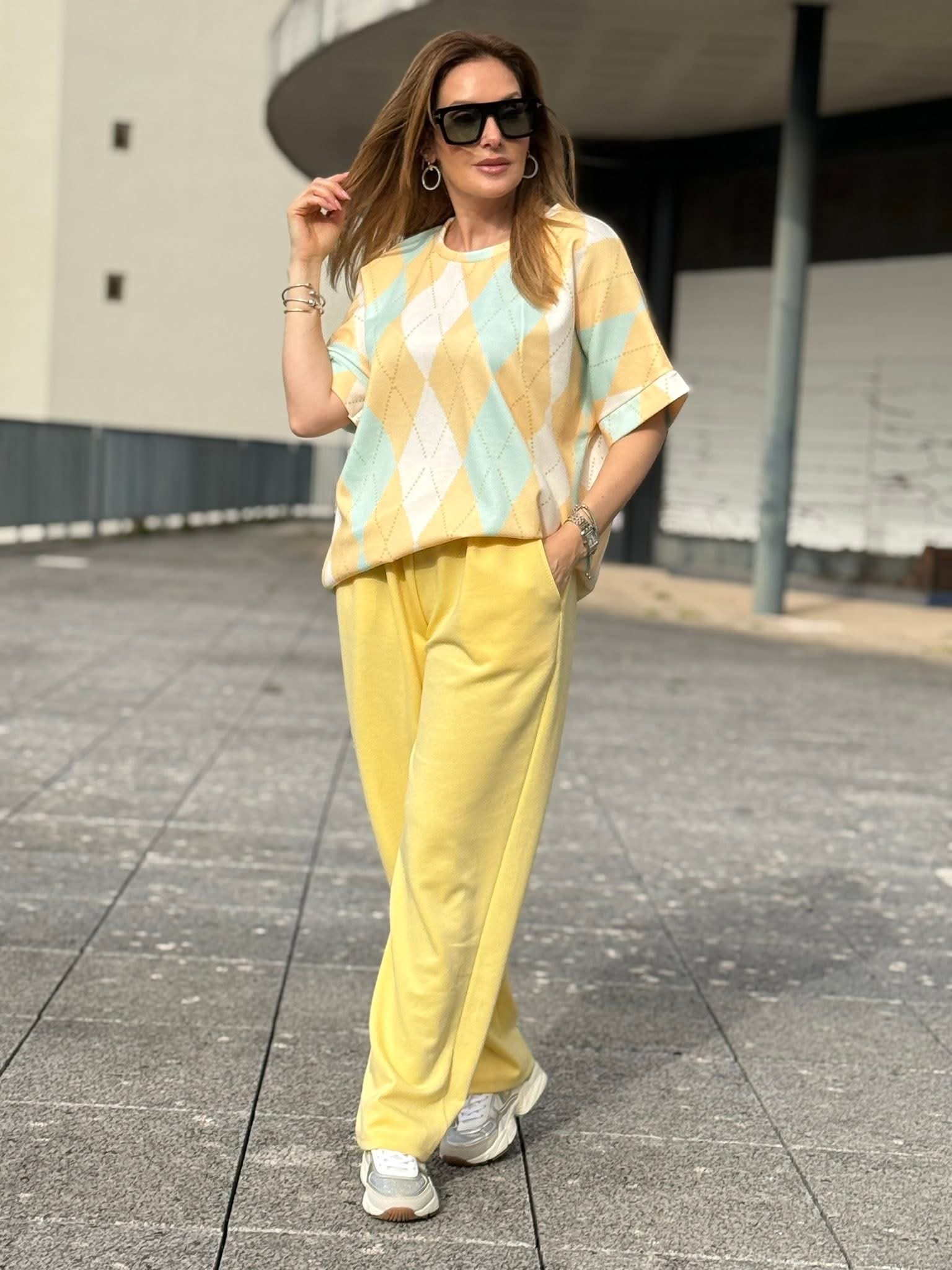 Conjunto em malha de inspiração desportiva, composto por camisola de manga curta com decote redondo e calças de corte reto com elástico na cintura e bolsos laterais funcionais. O estampado de losangulos grandes e coloridos percorre as duas peças em harmonia, criando uma composição visual coesa e de presença imediata. A elasticidade da cintura e o corte reto das calças asseguram conforto e liberdade de movimento sem comprometer a linha. Um conjunto versátil, pensado para o dia a dia com estilo, que equilibra o espírito casual com uma estética atual e diferenciada.