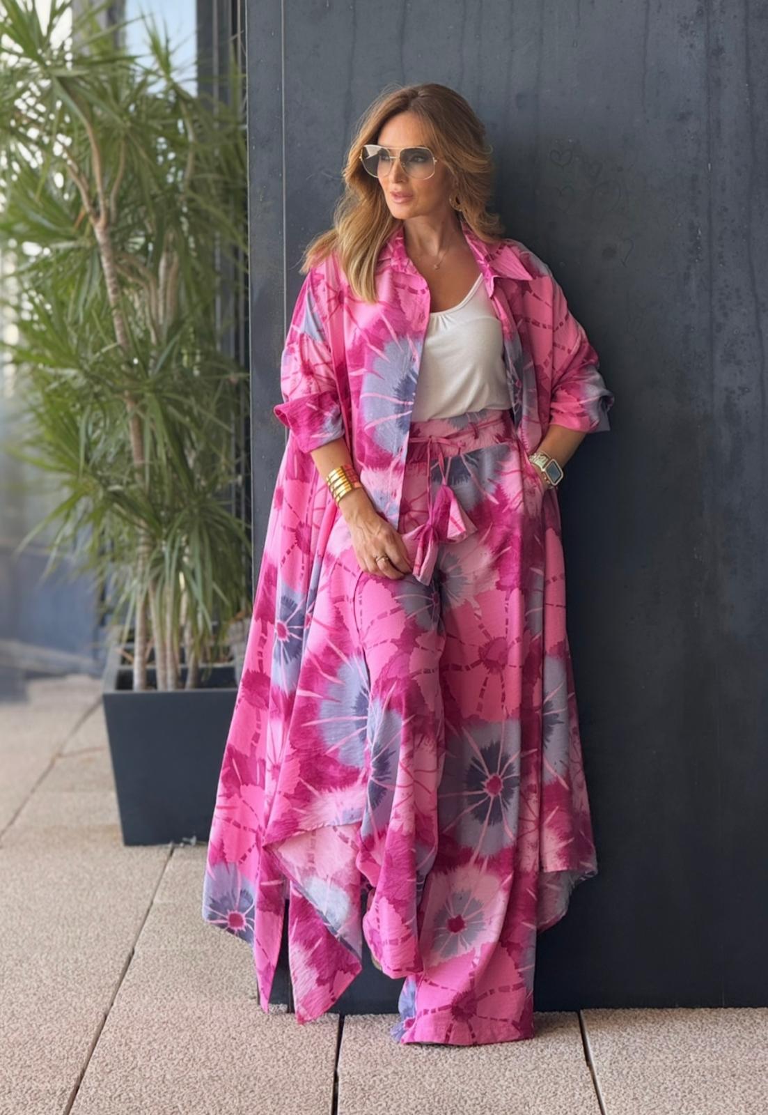 O conjunto Velvet é a definição de versatilidade e elegância. Composto por um camiseiro comprido de manga 3/4 com lapela, que pode ser usado aberto ou fechado como vestido, e umas calças pantalonas fluidas com cinto no mesmo tecido. O estampado floral em ambas as peças cria um coordenado harmonioso, moderno e sofisticado, perfeito para diferentes ocasiões.