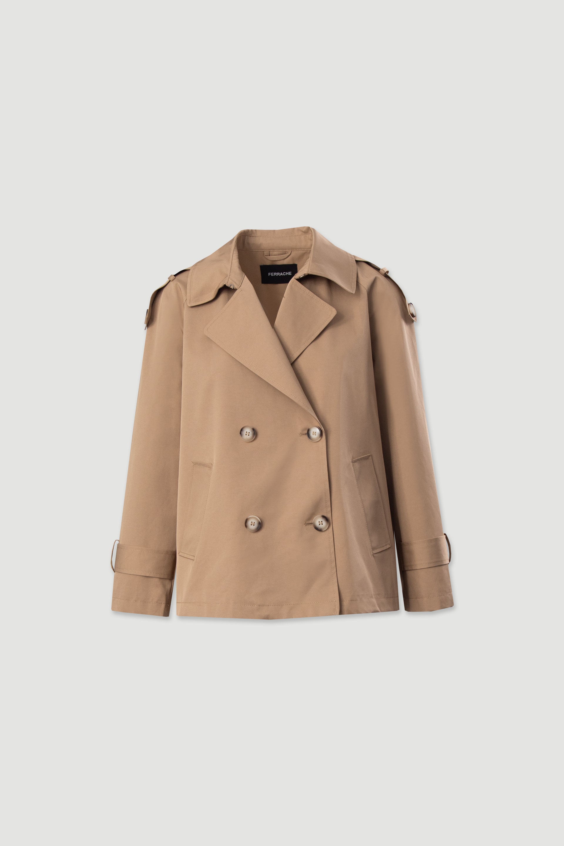 Gabardine curta Ferrache de corte reto, com abotoamento duplo à frente e gola clássica, perfeita para um look elegante e minimalista. Os detalhes estruturados nos ombros e punhos acrescentam sofisticação, enquanto os bolsos laterais discretos completam o design funcional.