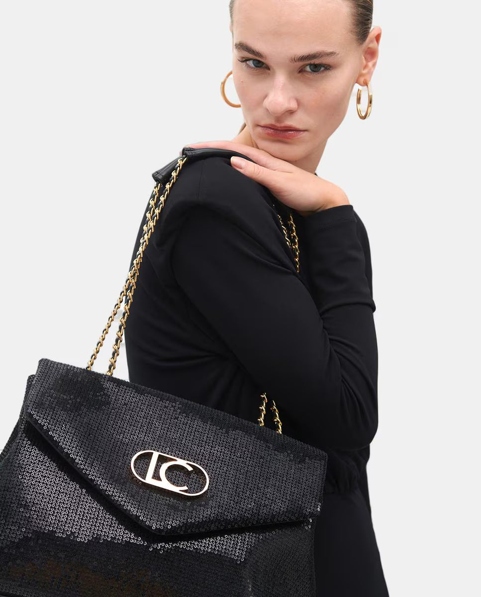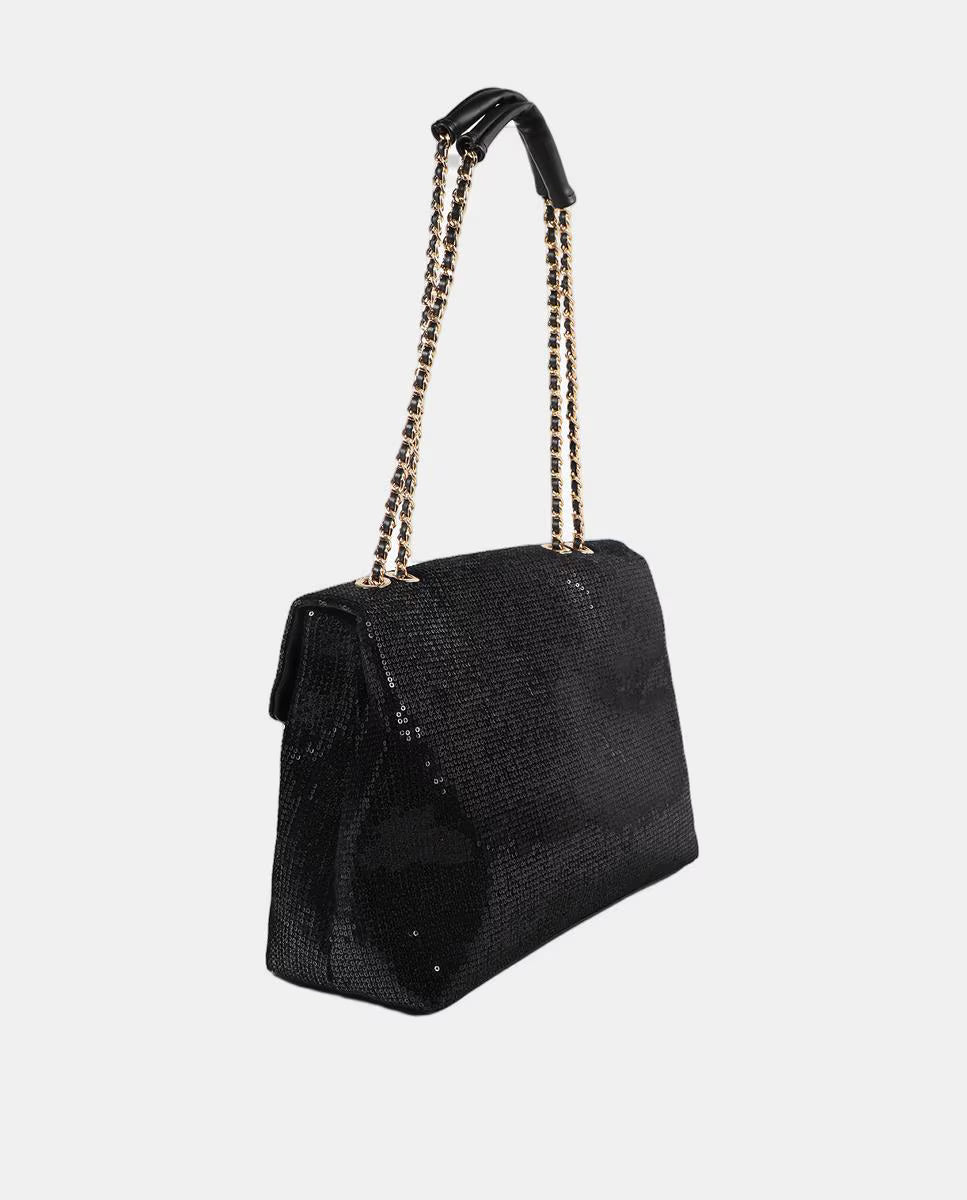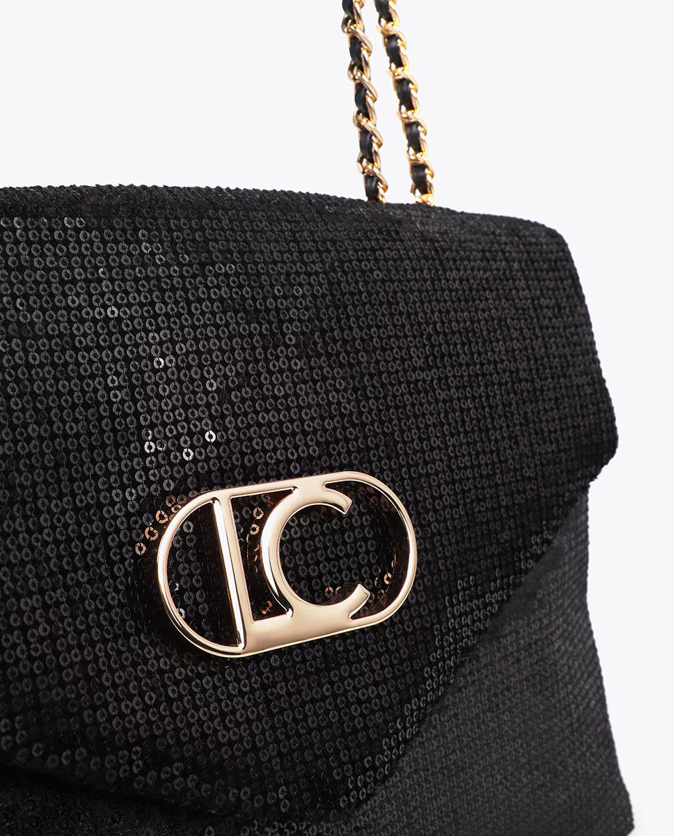 Mala Lola Casademunt revestida a lantejoulas, com aba e fecho de íman. Possui alças combinando corrente dourada e ecopele, unindo estilo moderno e funcionalidade.