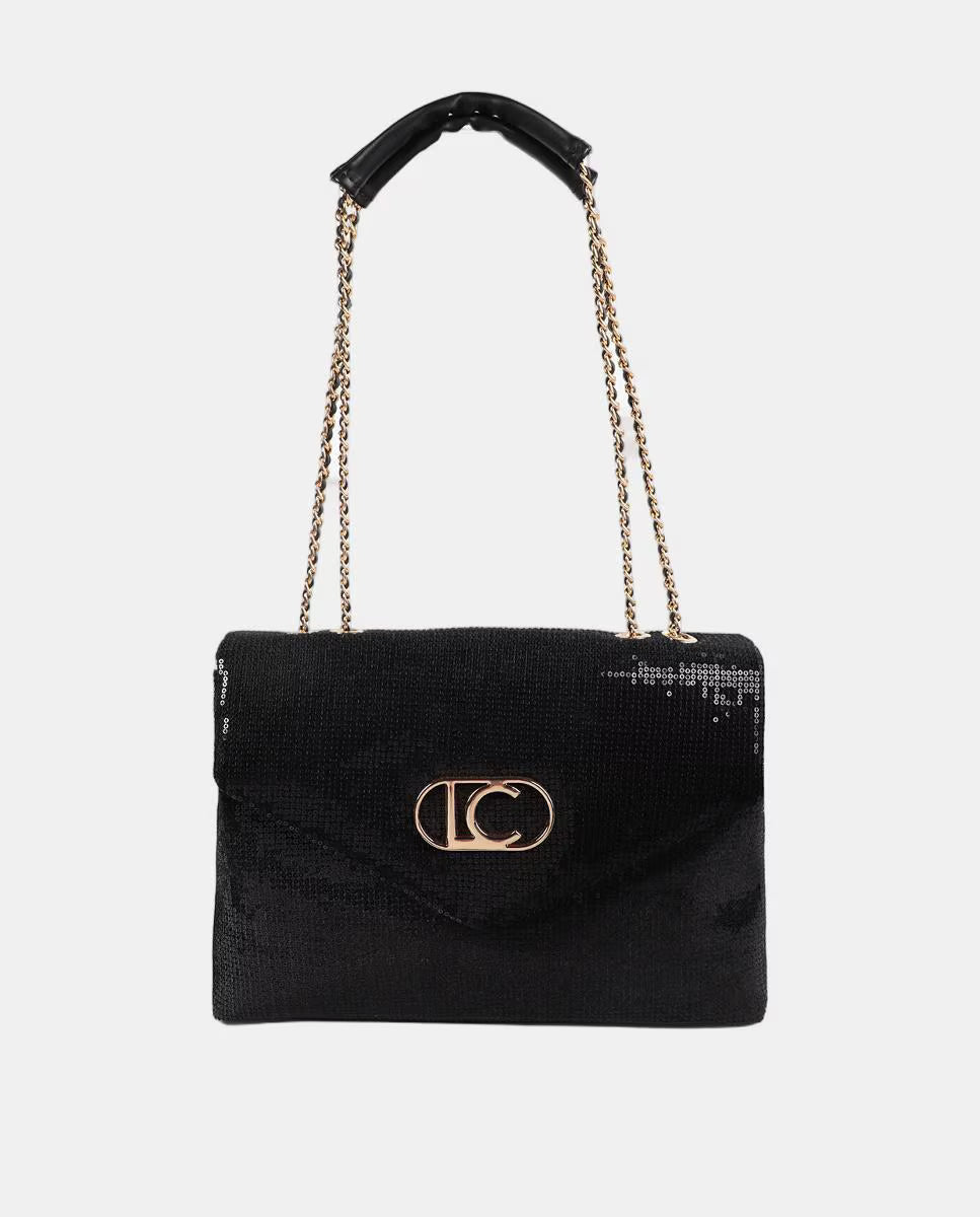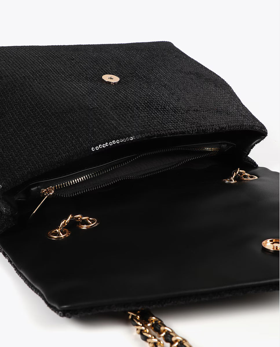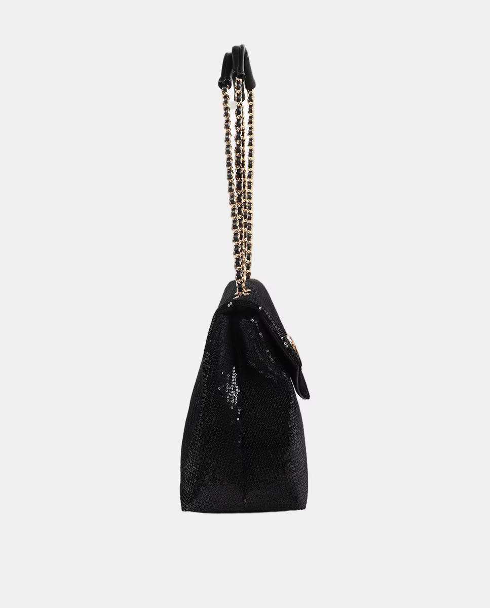 Mala Lola Casademunt revestida a lantejoulas, com aba e fecho de íman. Possui alças combinando corrente dourada e ecopele, unindo estilo moderno e funcionalidade.