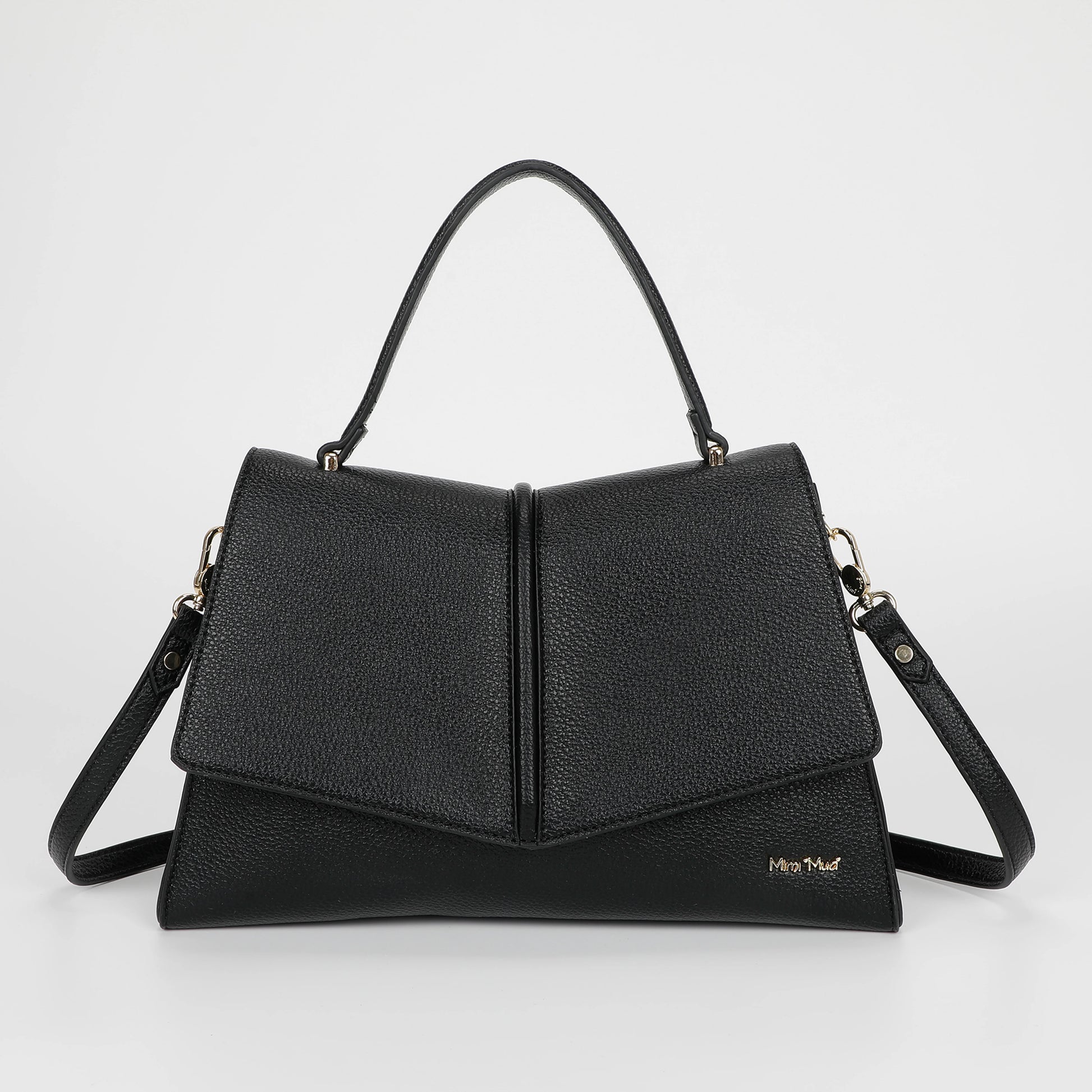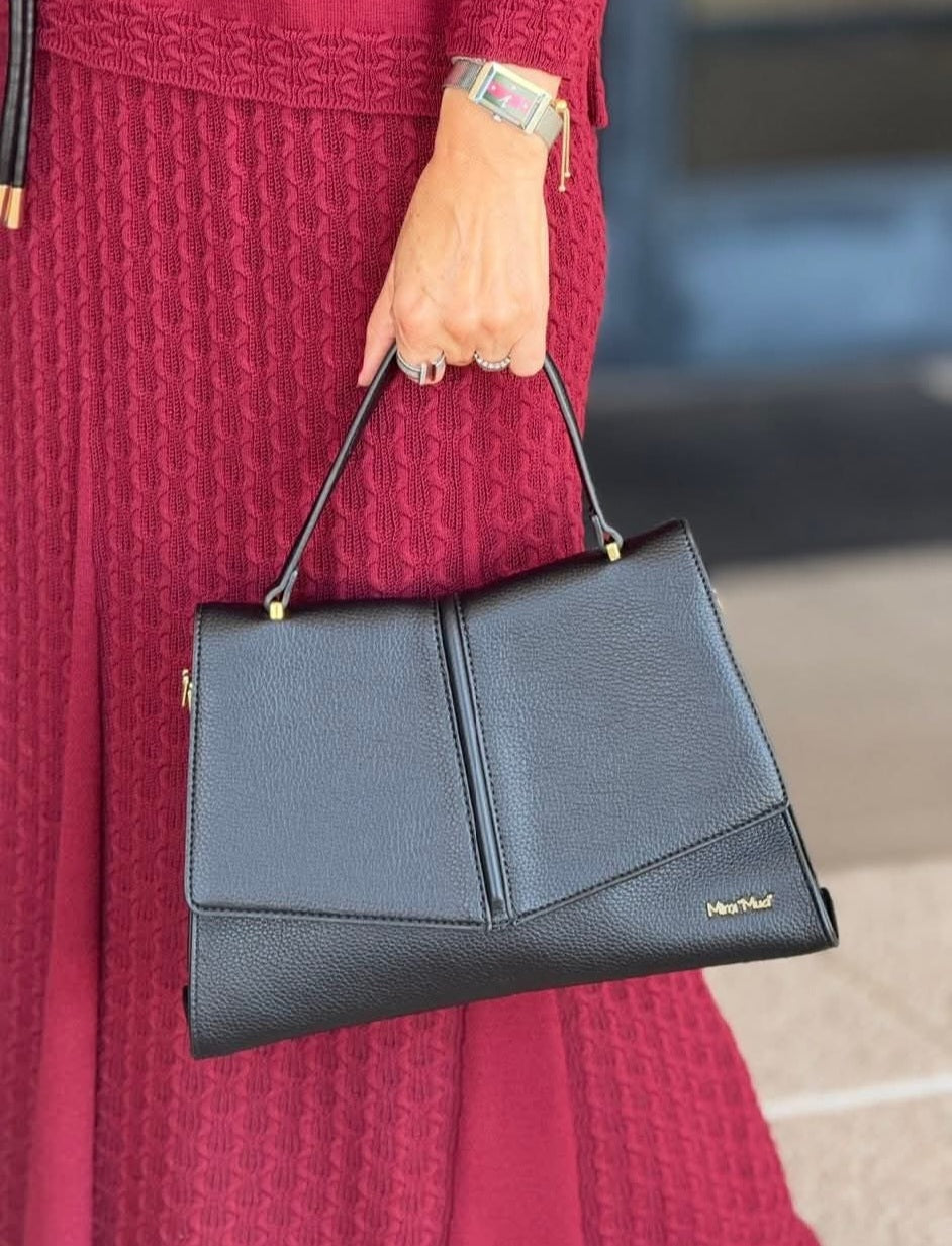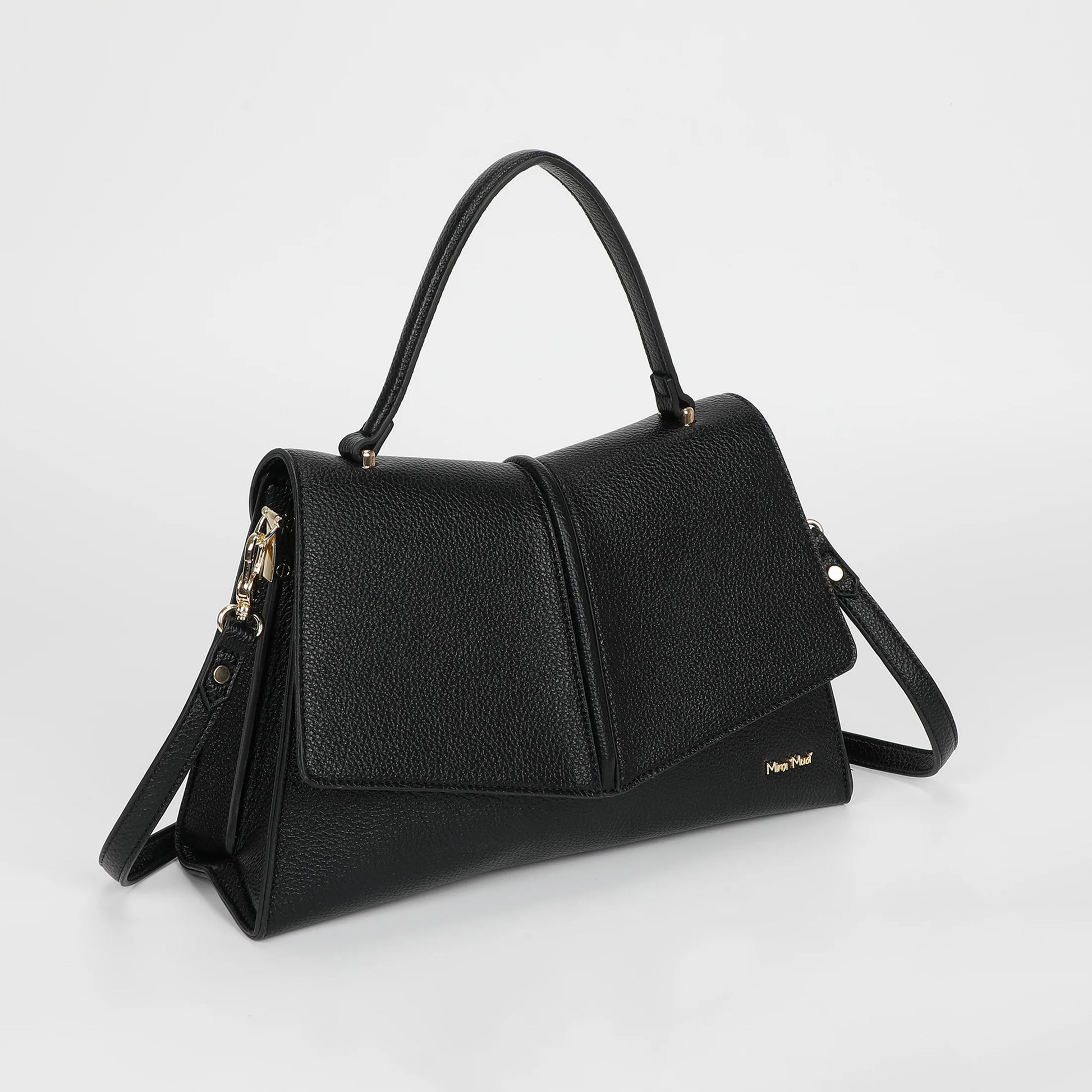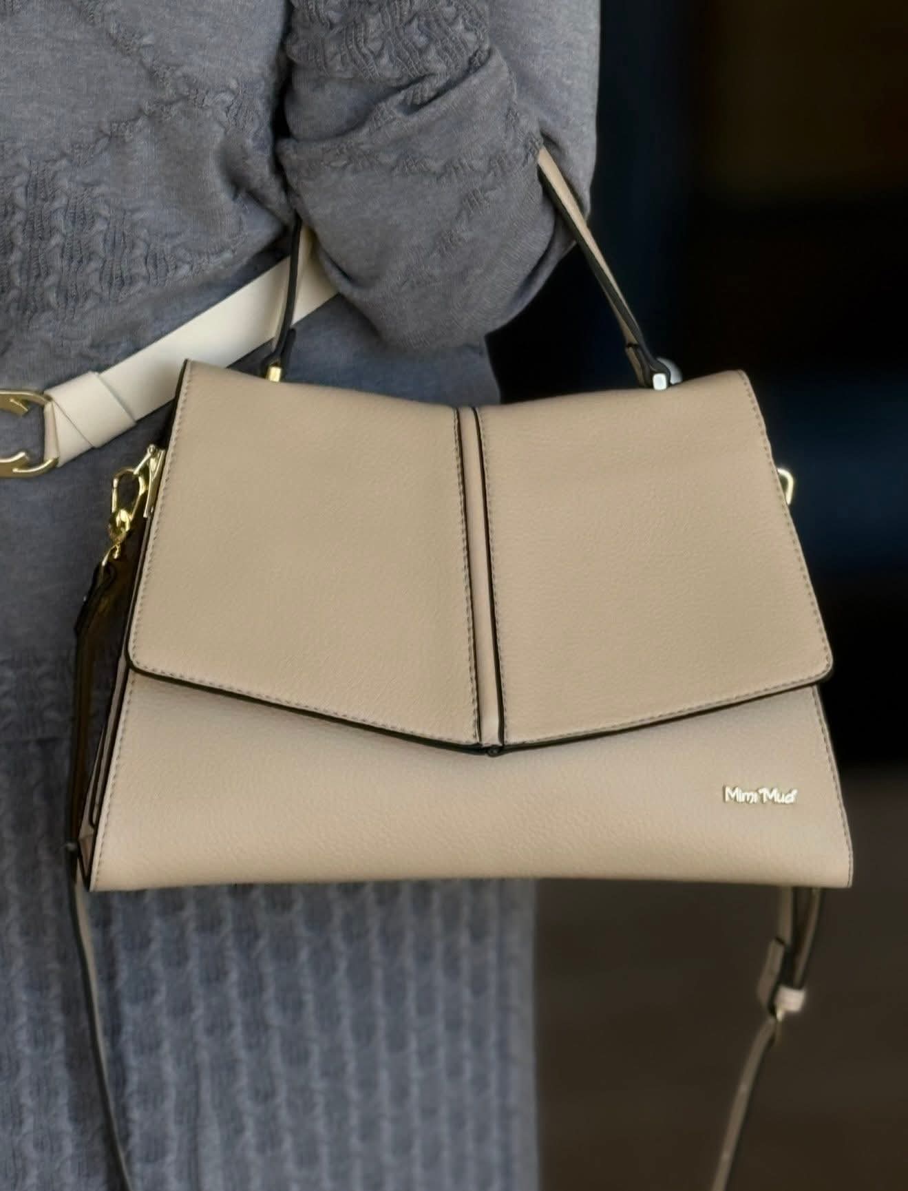 Mala estruturada Mimi Mua, versátil e prática, com alça de mão e alça de ombro removível. Apresenta aba ampla com fecho de íman e três divisórias internas, incluindo uma com fecho de zíper, garantindo organização e funcionalidade sem perder a elegância. Um acessório ideal para looks do dia a dia ou ocasiões especiais.