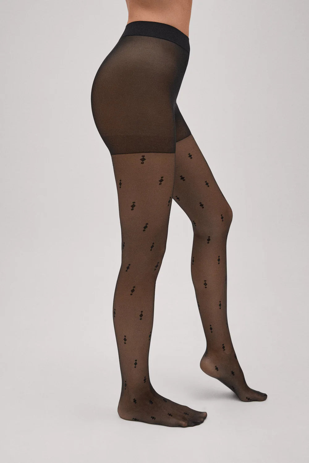 Meia-calça Ysabel Mora preta de 20 deniers, com estampa geométrica que combina elegância e modernidade. Confortável e com toque suave, é perfeita para dar um toque sofisticado e distinto aos seus looks, ideal para usar com saias, vestidos ou calções.