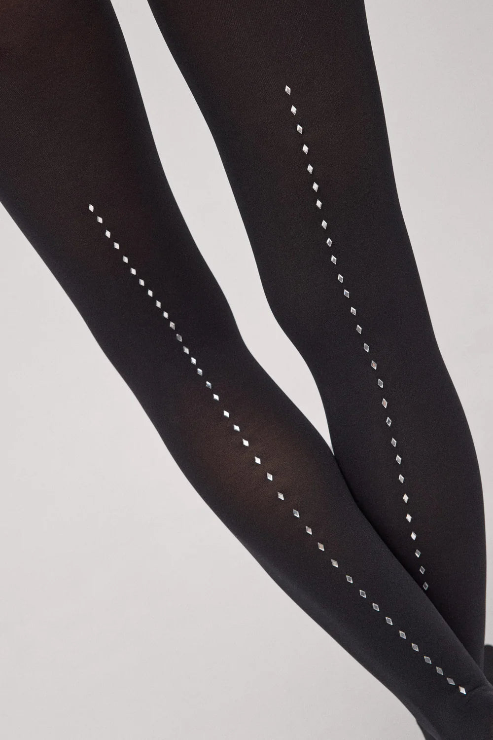 Meia-calça Ysabel Mora preta de 20 deniers, com elegante detalhe de glitter vertical em formato de losango na parte de trás. Confortável e sofisticada, é perfeita para adicionar um toque de brilho discreto a looks de festa ou ocasiões especiais, mantendo a transparência e leveza clássica das meias finas.