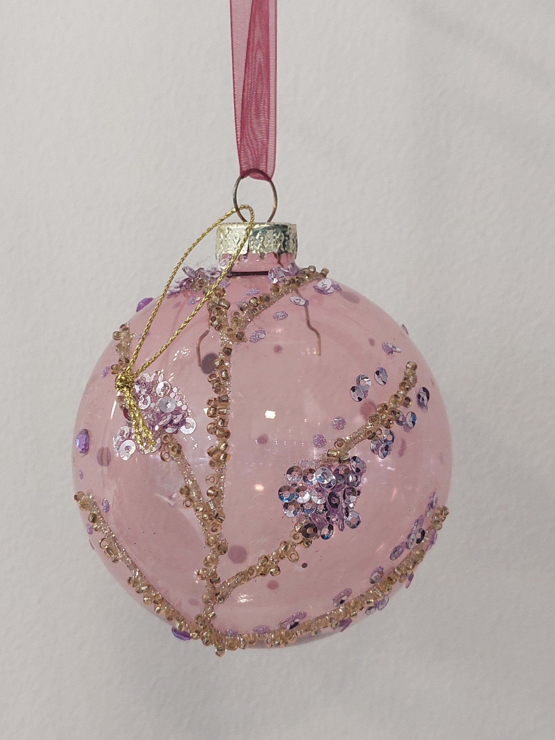 Efeito de árvore de natal. Bola de vidro rosa transparente, com missangas.