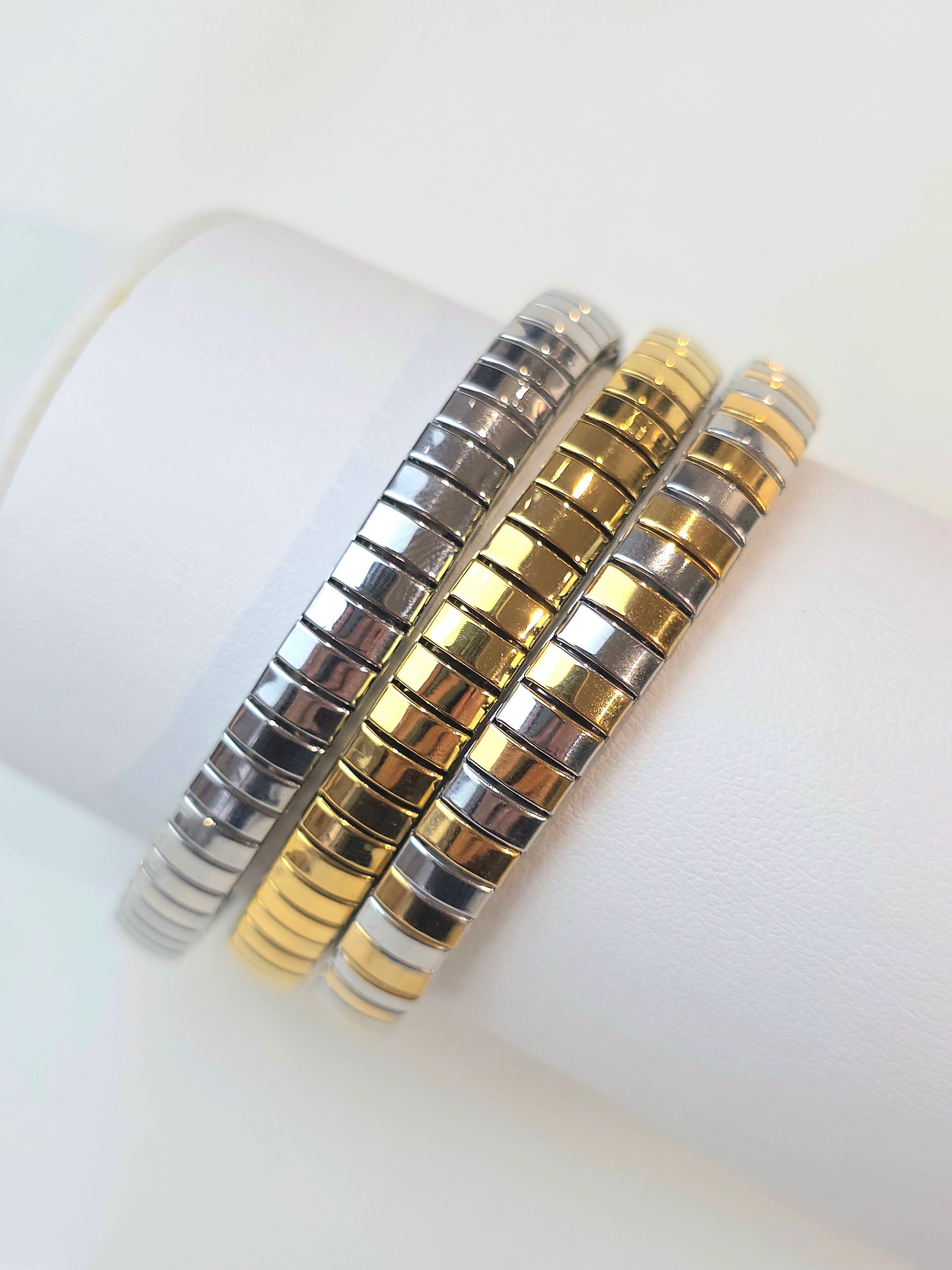 Pulseira Bastta em aço inoxidável, com estrutura elástica e peças metálicas, pensada para um uso confortável e fácil no dia a dia. O formato adapta-se ao pulso sem fechos, mantendo um look limpo e contemporâneo, ideal para usar sozinho ou em conjunto com outras pulseiras em aço. Funciona especialmente bem com coordenados minimalistas, onde o brilho do metal se destaca de forma discreta.
