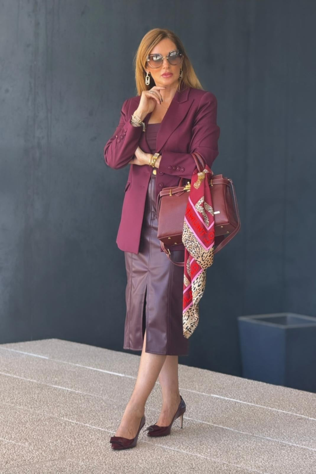Saia midi Bigzone em ecopele, com abertura central, fecho de zíper e botão, e bolsos laterais