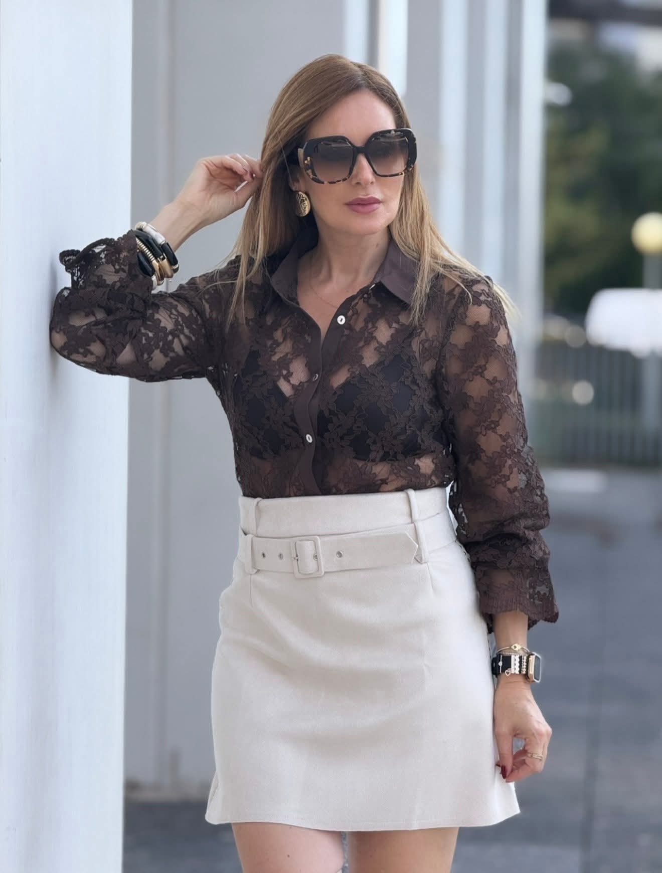 Saia curta Foursoul em camurça macia, com cinto do mesmo material para ajuste personalizado. Apresenta tachas laterais que adicionam um toque moderno e ousado ao design. Uma peça versátil que combina com blusas ou camisolas para criar looks casuais ou sofisticados.