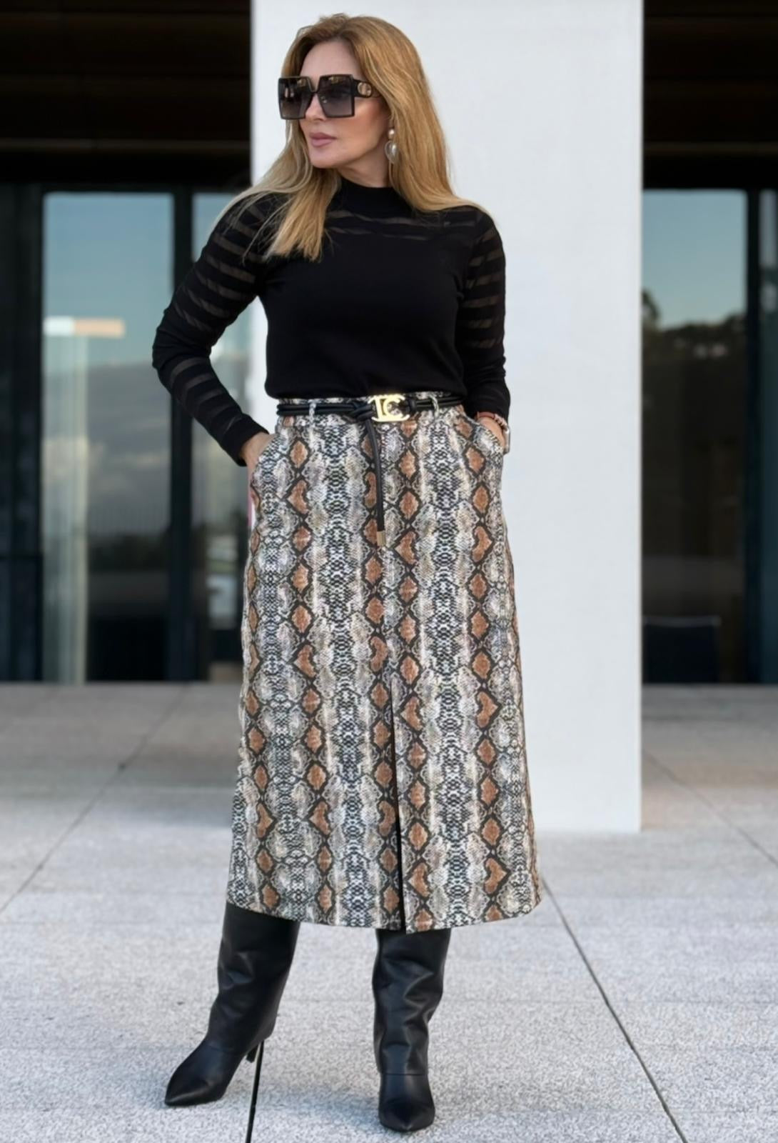 Saia midi Foursoul em animal print inspirado em cobra, com abertura frontal central que adiciona movimento e sofisticação ao look. Inclui cinto no mesmo tecido para marcar a cintura e valorizar a silhueta, perfeita para combinações modernas e elegantes.