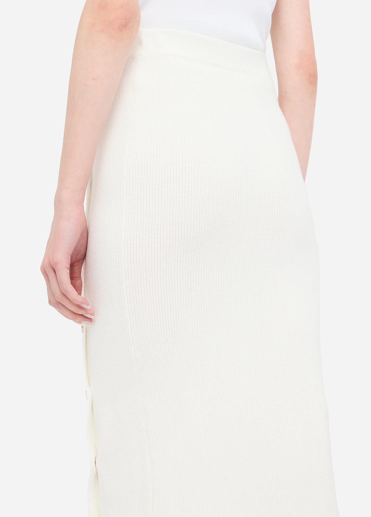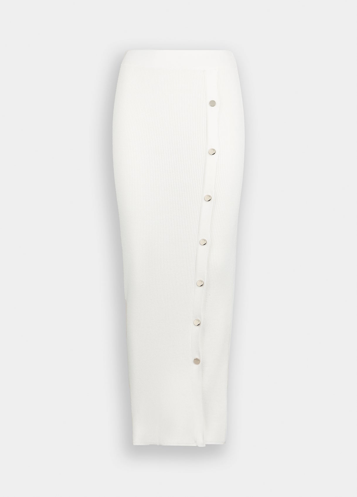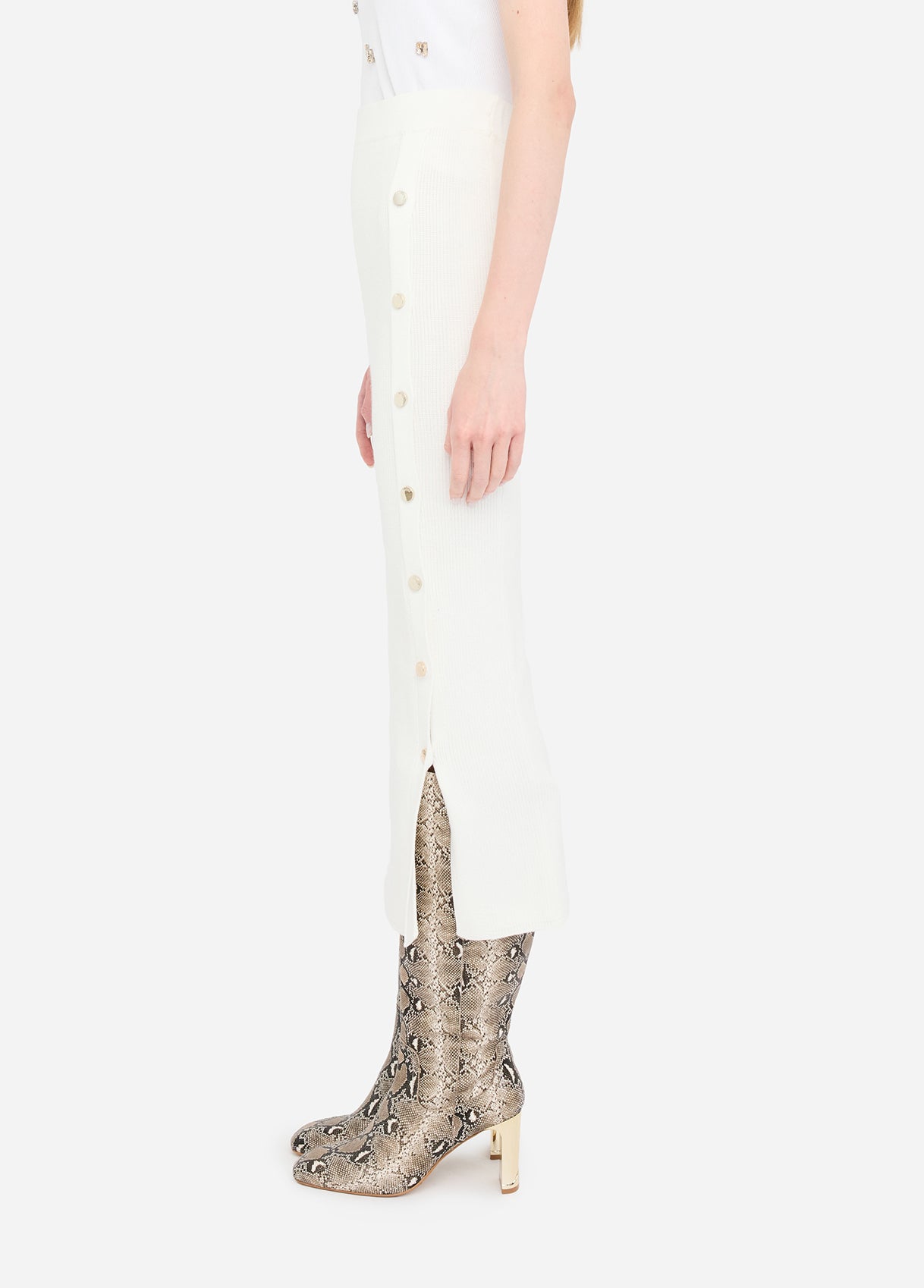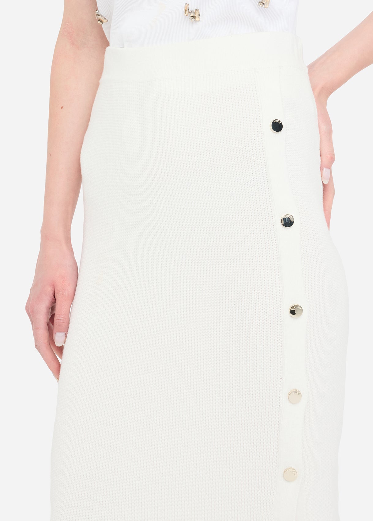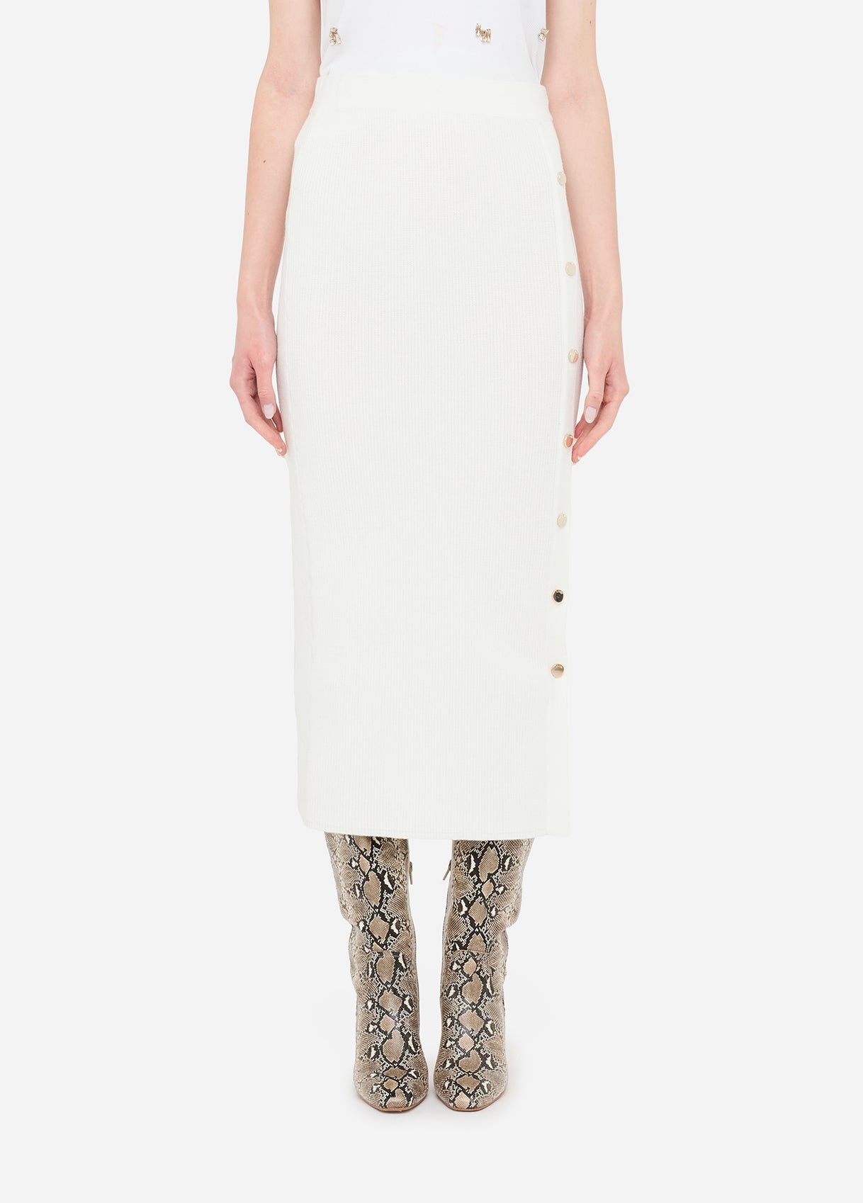 Saia comprida Liu Jo em malha canelada, confeccionada em fios de viscose que proporcionam um caimento fluido e confortável. Detalhada com botões dourados nas laterais e cintura elástica que garante um ajuste perfeito. Uma peça sofisticada e versátil, ideal para composições elegantes do dia a dia.