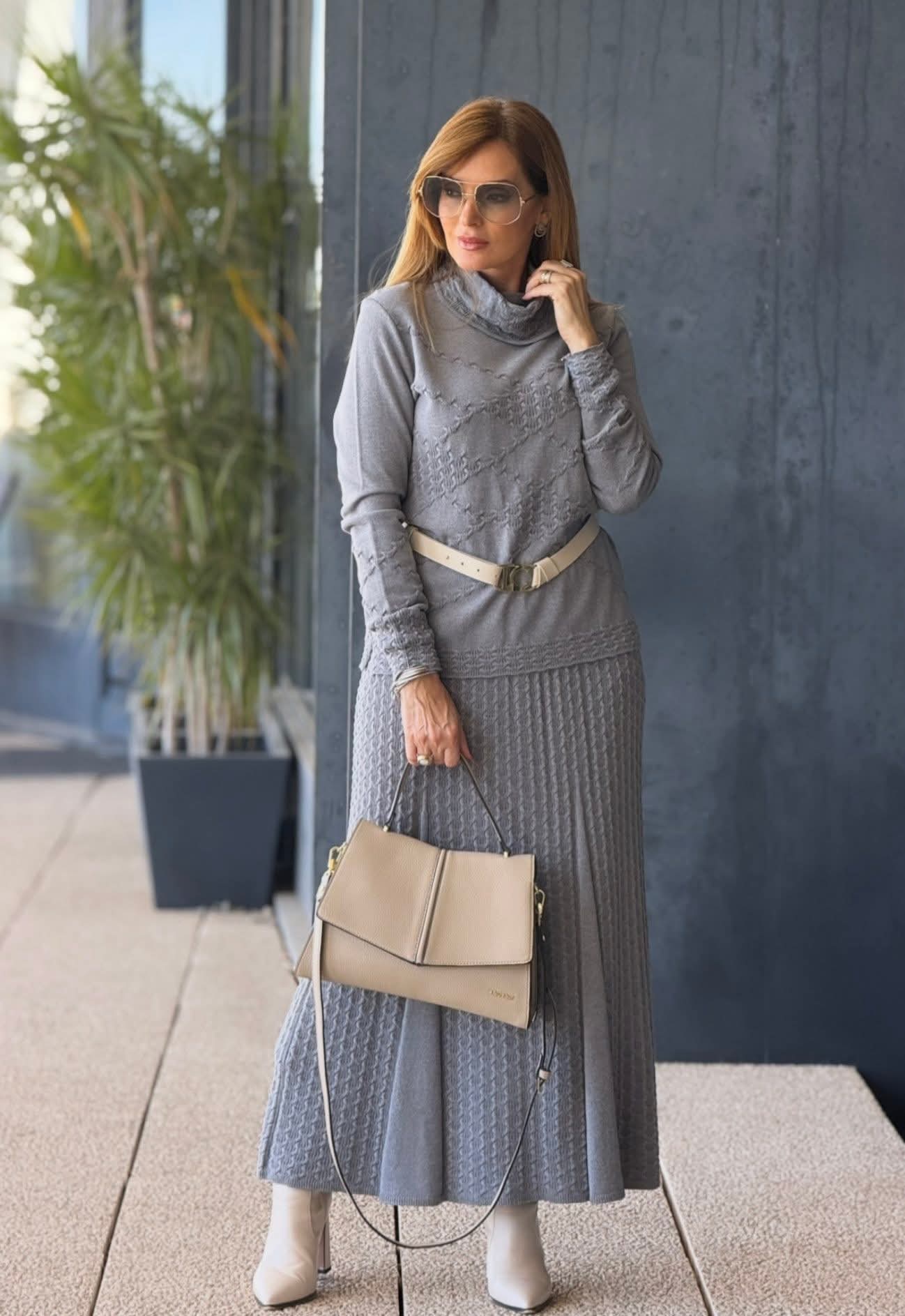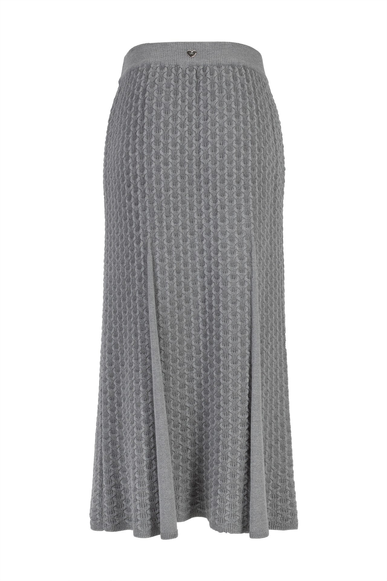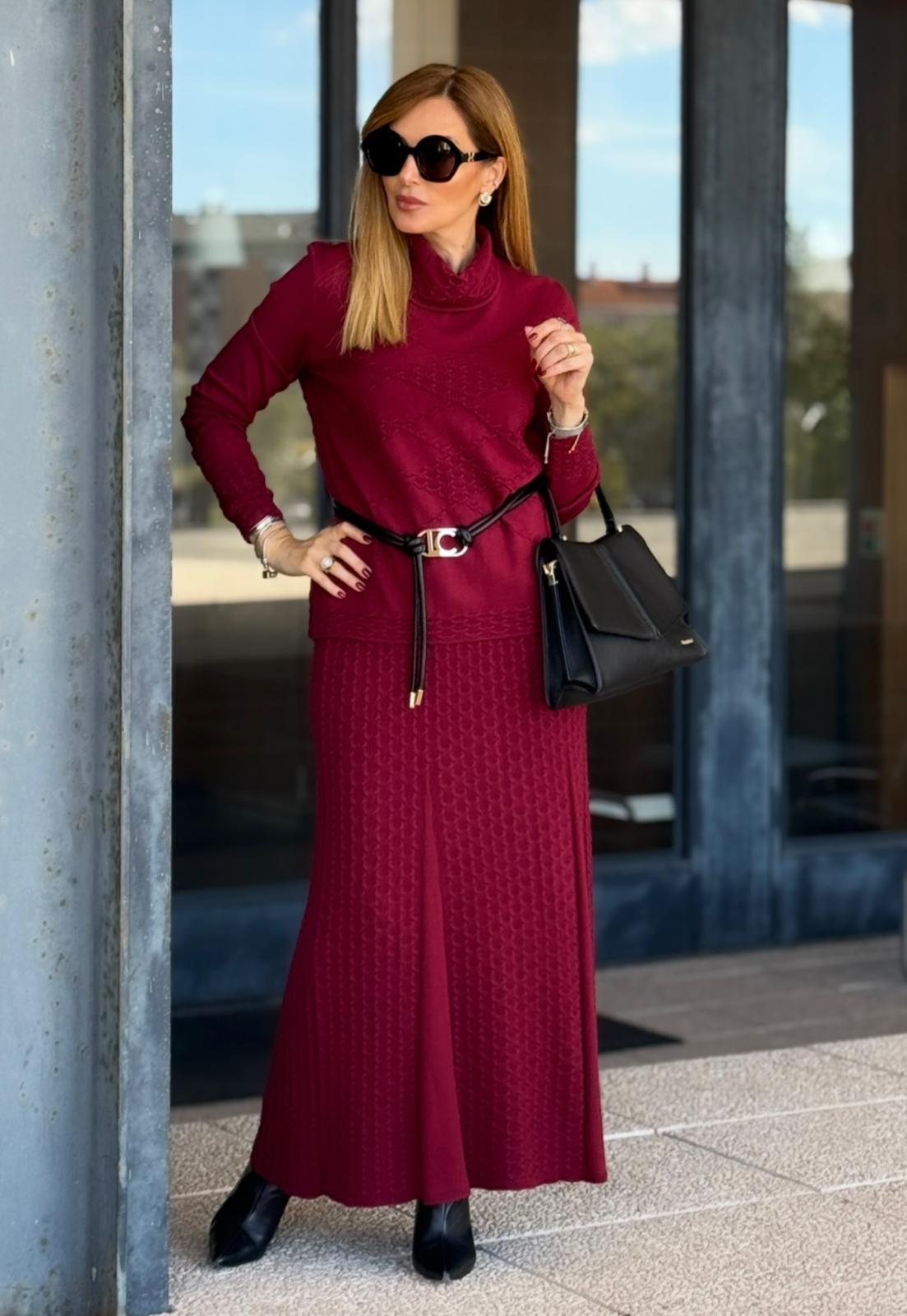 Saia em malha Silvina Campos com padrão discreto em relevo, que adiciona textura e sofisticação ao visual. Modelo versátil, ideal para coordenar com a camisola ou casaco da mesma cor, criando um conjunto harmonioso e elegante.