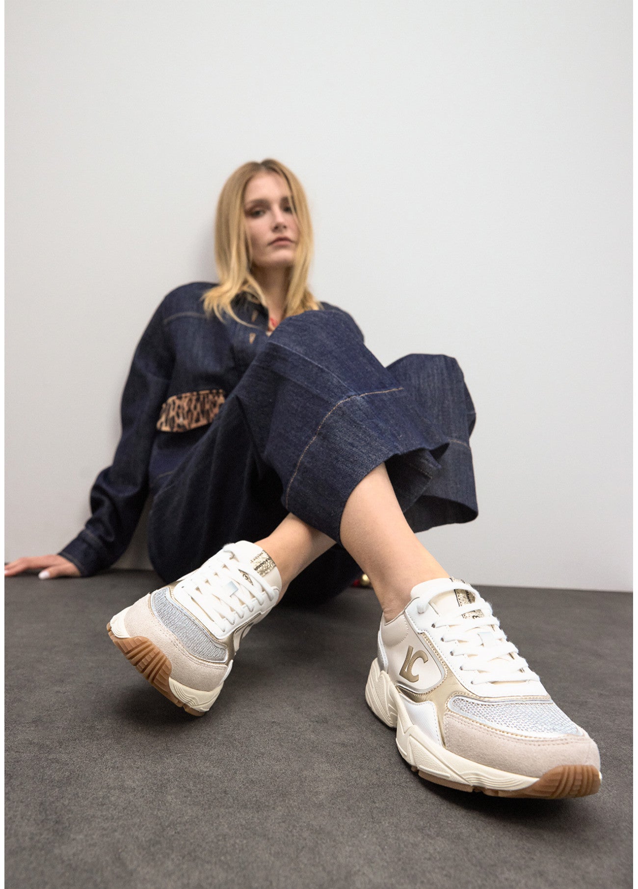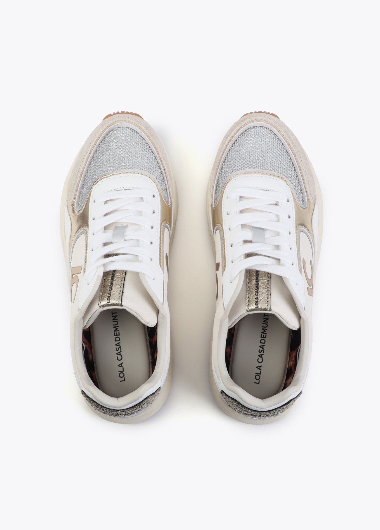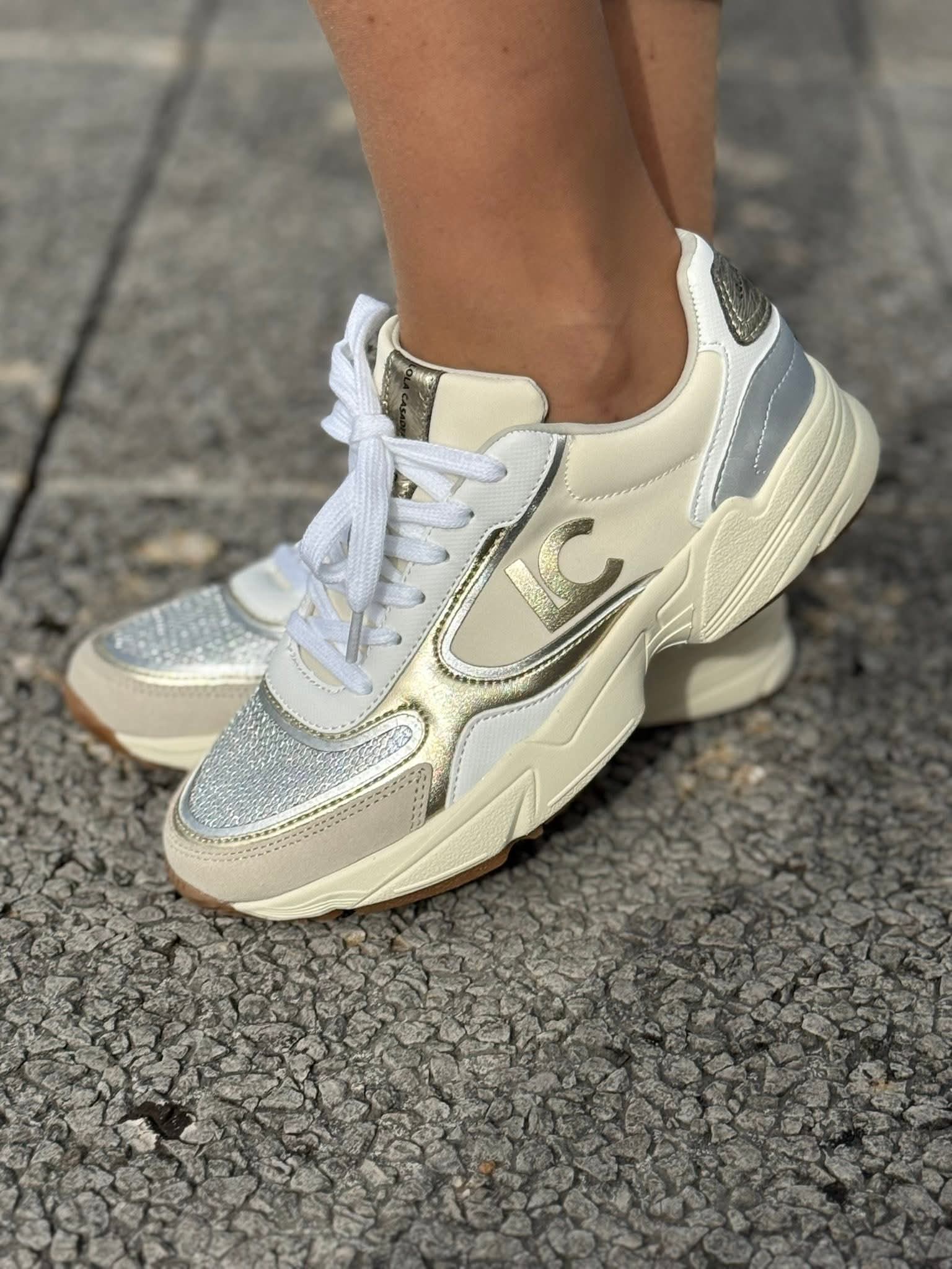 Ténis Lola Casademunt com sola tipo running, concebidos para um registo urbano, funcional e actual. Confecionados em tecidos combinados com detalhes em couro, equilibram textura e resistência com um acabamento cuidado. A palmilha ergonómica favorece o conforto ao longo do dia, enquanto o fecho por atacadores permite um ajuste preciso. O logótipo em relevo acrescenta um apontamento discreto, mas distintivo, perfeito para conjugar com jeans direitos, conjuntos de malha ou coordenados mais utilitários, mantendo sempre uma imagem polida e dinâmica.