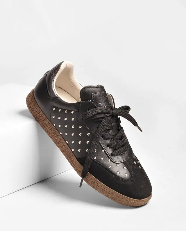 Sapatilha baixa Ruika em pele, com detalhes em camurça e tachas prateadas