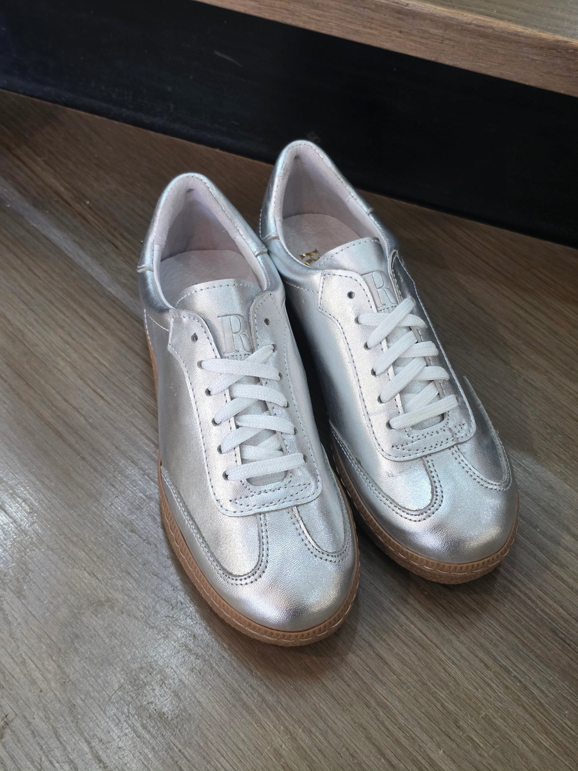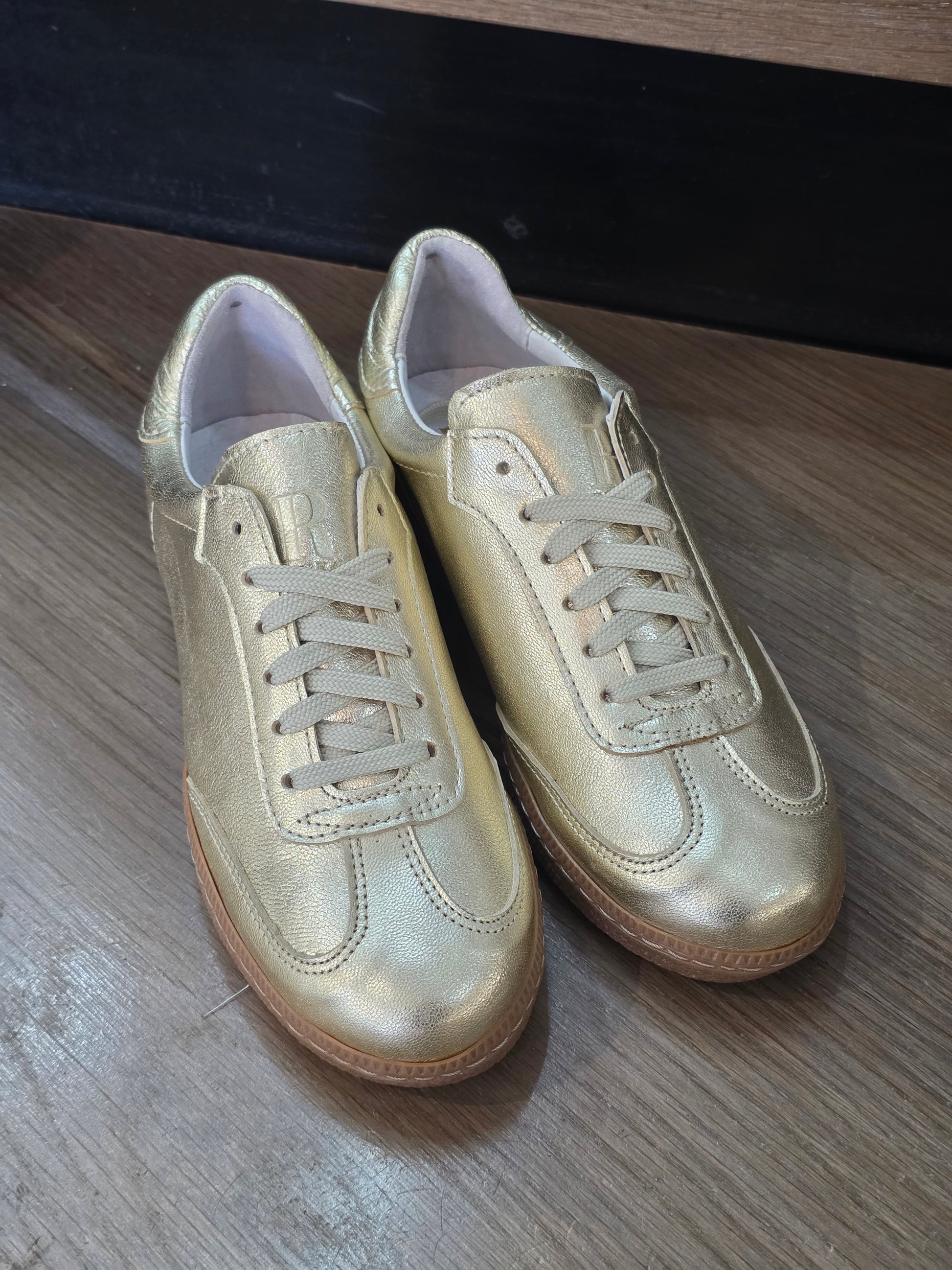Sapatilha Ruika metalizada, com acabamento moderno e luminoso que eleva qualquer look casual. Possui atacadores frontais e sola de borracha camel, garantindo conforto e estilo no dia a dia. Uma opção versátil para combinar com múltiplos outfits.