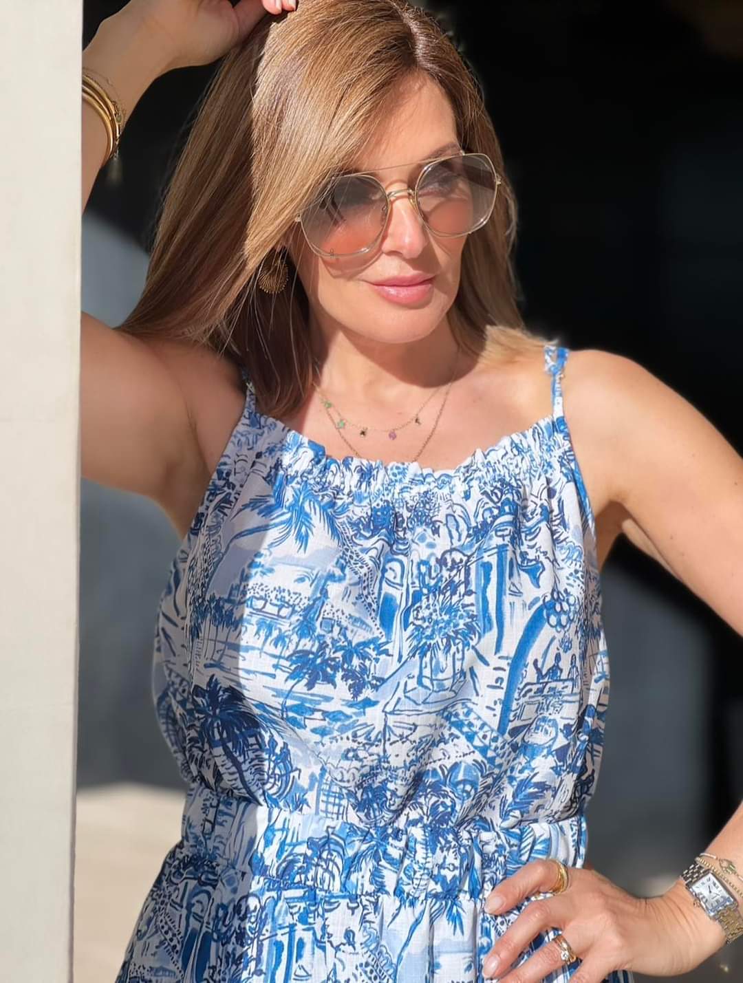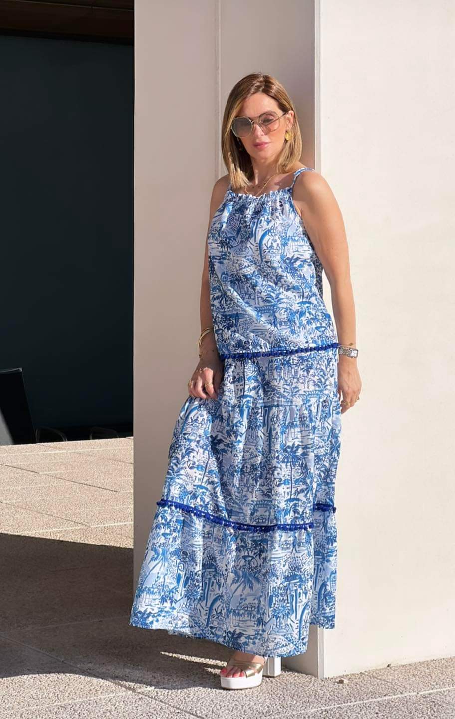Top de alças finas, com estampado em azul