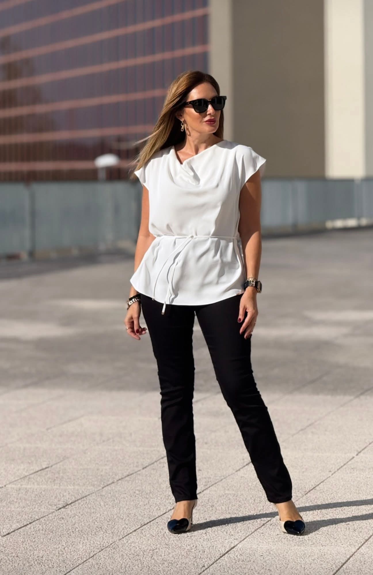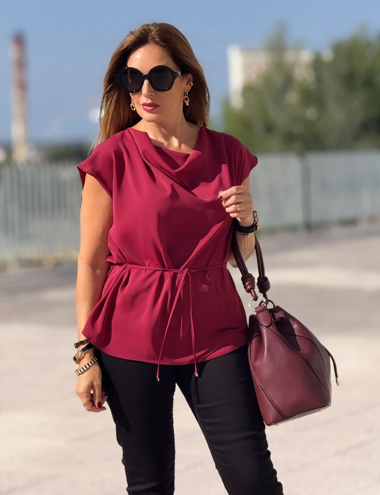O top fluido Ferrache destaca-se pelo seu decote descaído suave e pela manga curta que transmite leveza e feminilidade. O cinto no mesmo tecido acrescenta versatilidade, permitindo marcar a cintura e ajustar a silhueta de forma personalizada. Uma peça elegante e prática, ideal para coordenar com calças ou saias em diferentes ocasiões.