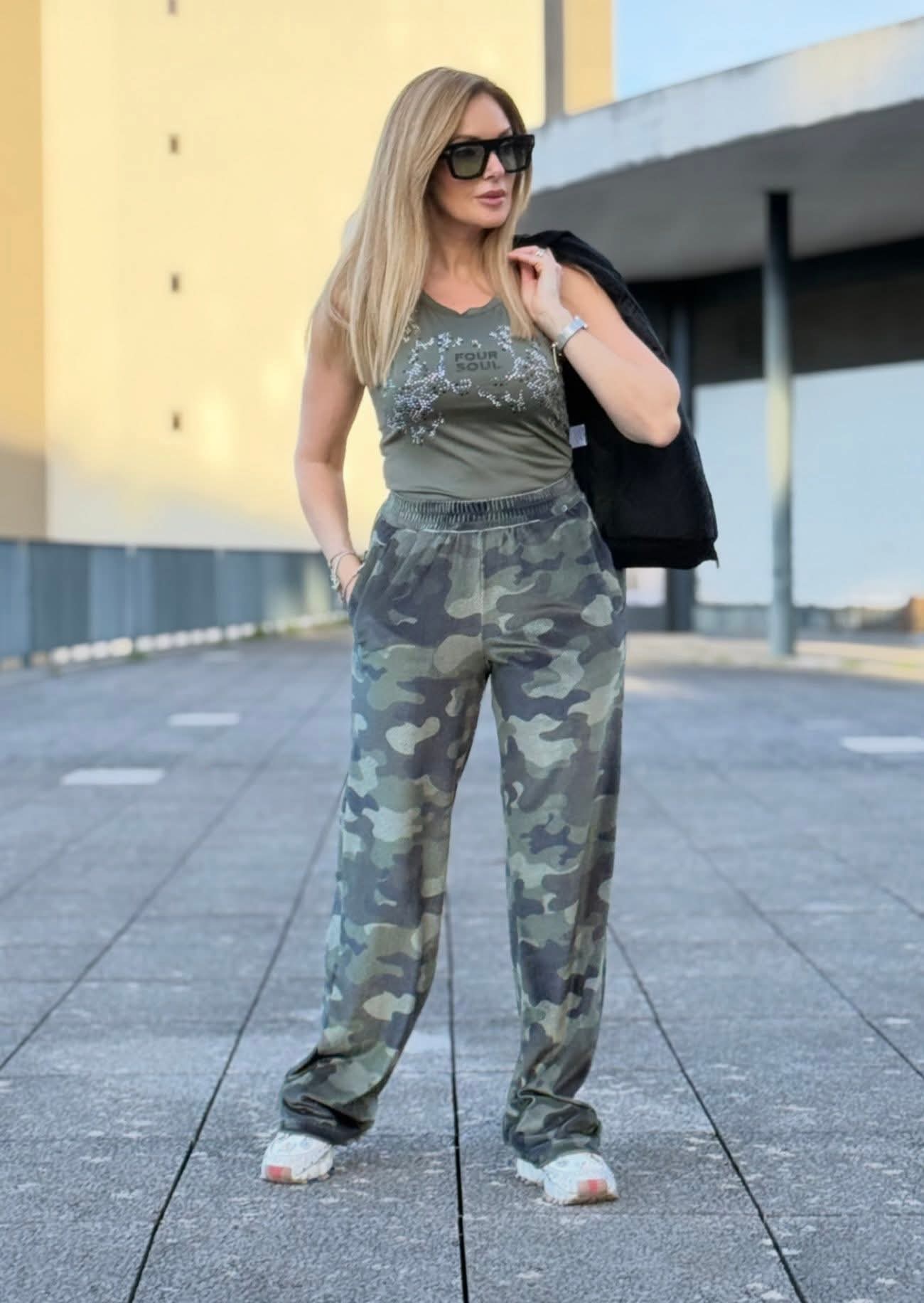 Top Foursoul em malha fria, com alças e decote redondo que oferece um visual simples e elegante. A aplicação de strass na zona do peito adiciona brilho subtil, perfeito para elevar looks casuais ou de noite. Confortável e versátil para várias ocasiões.