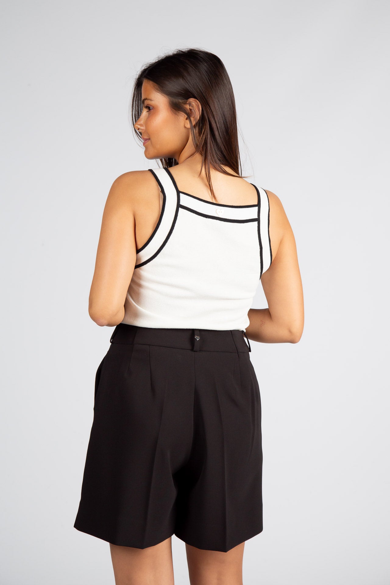 O top Silvina Campos aposta no minimalismo contemporâneo, realçado por detalhes contrastantes que lhe conferem modernidade e sofisticação. Com uma silhueta ajustada e recortes estratégicos, é uma peça que valoriza a feminilidade de forma subtil e elegante. Versátil, adapta-se facilmente a coordenados casuais ou mais requintados.