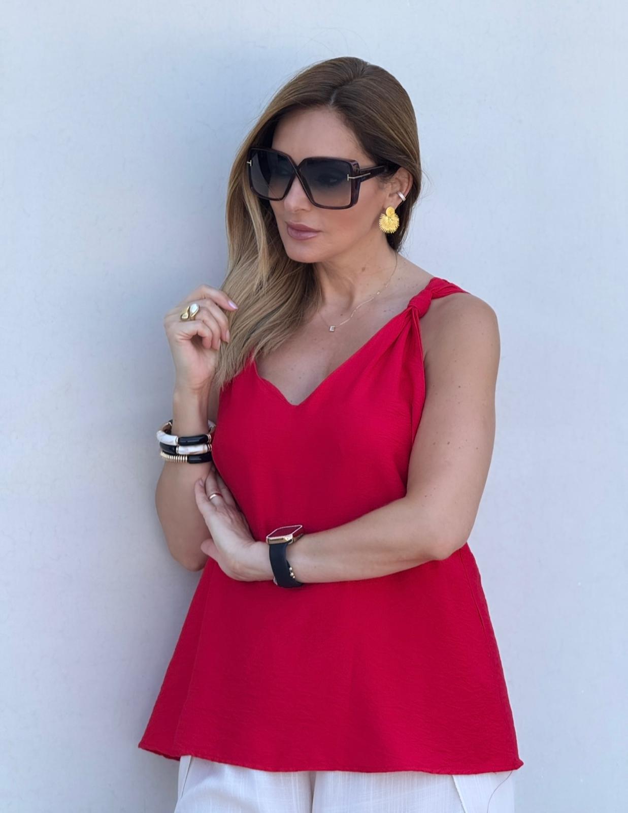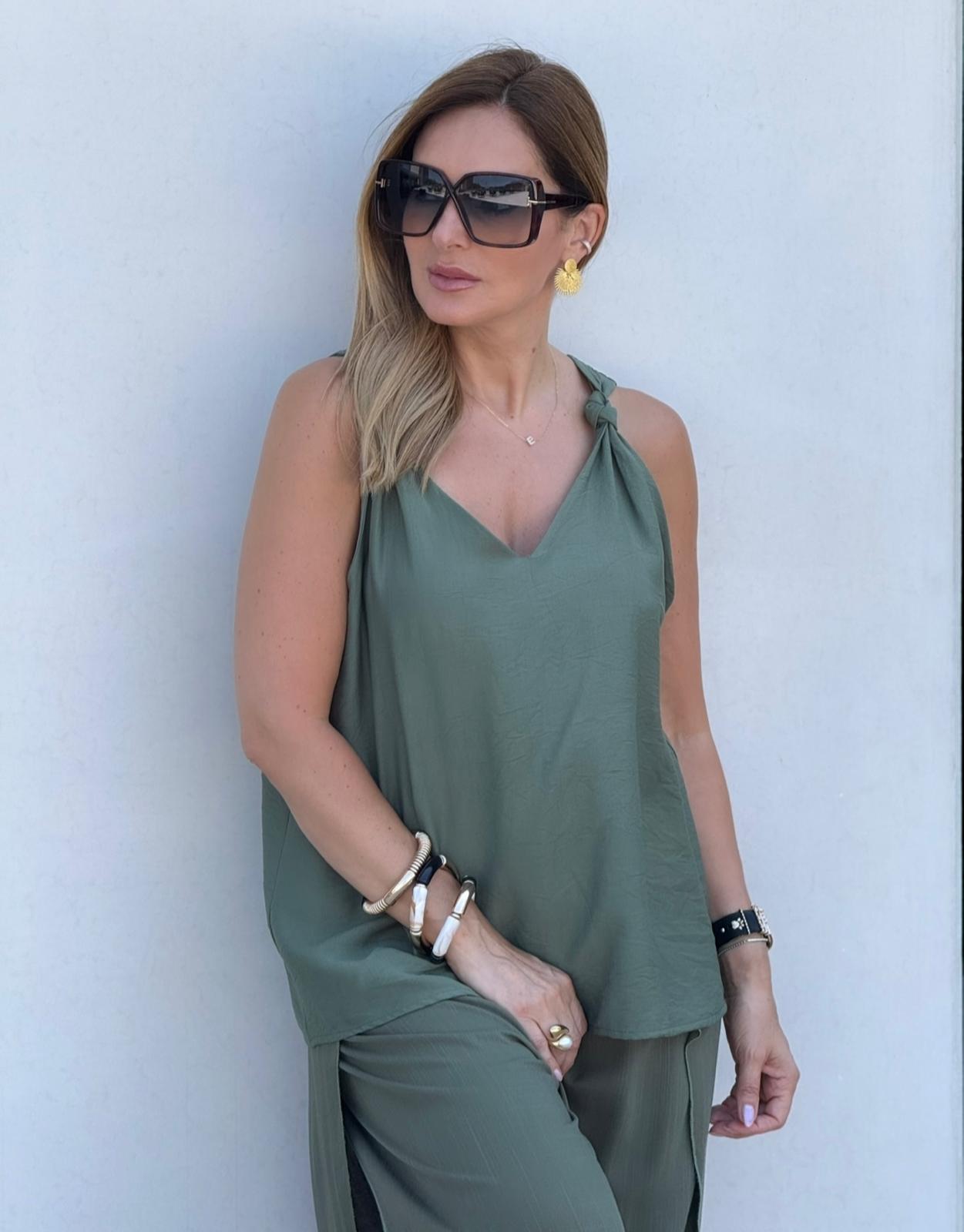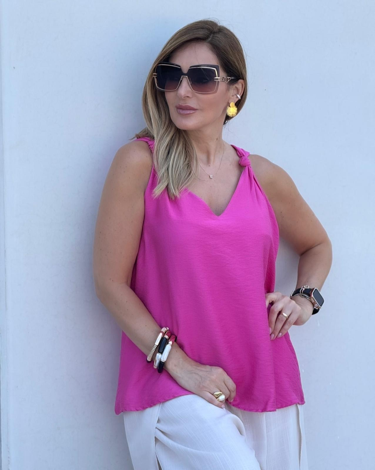 Top Velvet de design simples e elegante, com manga cava e decote em V que valoriza a silhueta. Confeccionado em tecido fluído e leve, ideal para dias quentes. O pormenor de nós nas alças acrescenta um toque delicado e feminino à peça. Versátil e confortável, é perfeito para looks casuais ou mais sofisticados, consoante a combinação.