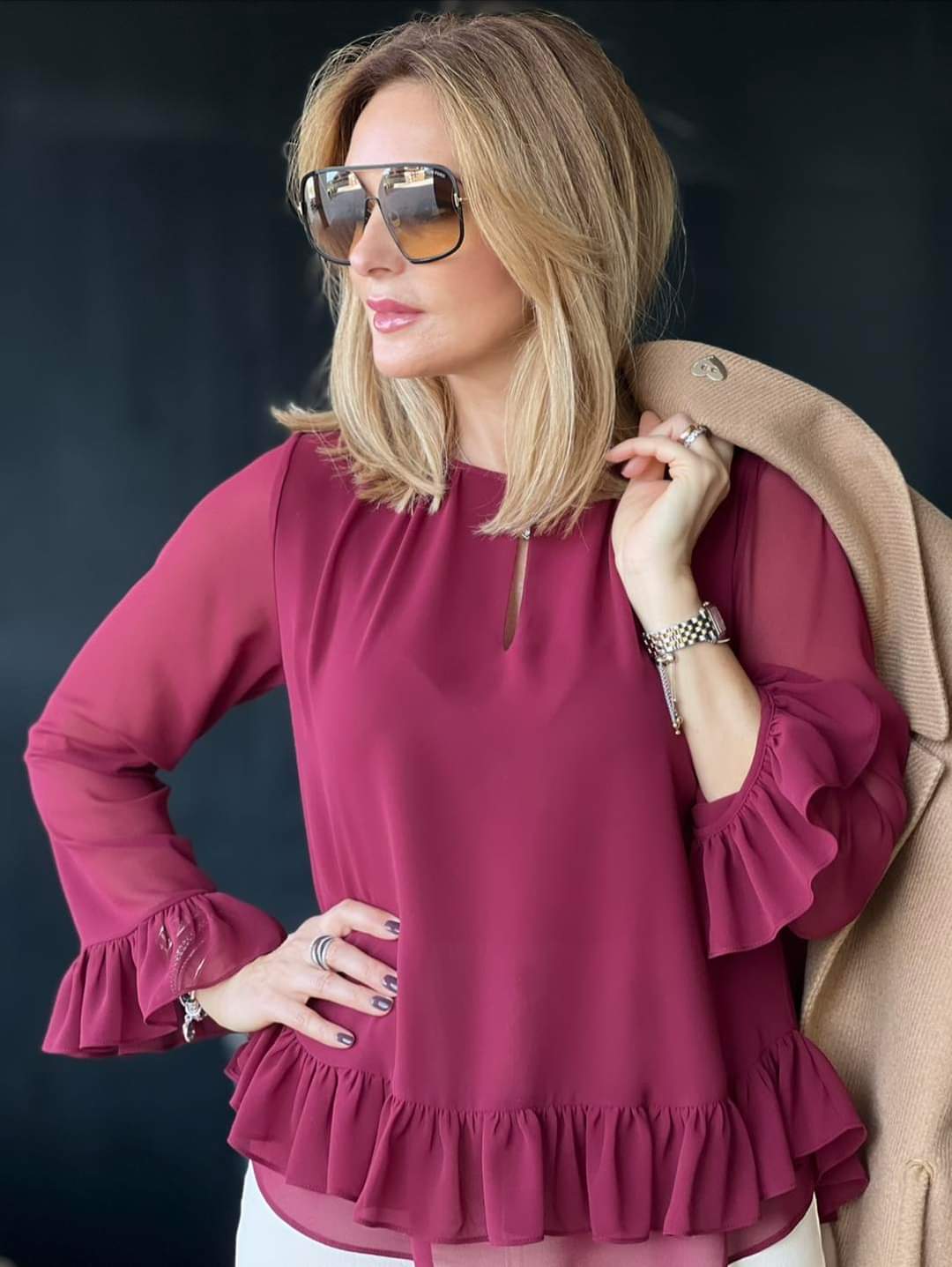 A túnica Silvina Campos com decote redondo e abertura em gota distingue-se pelos detalhes subtis que elevam a peça: acabamento grampeado no decote e folhos delicados nos punhos e na bainha. O fecho nas costas com botão e abertura em gota reforça um efeito cuidado e feminino, mantendo uma estética clean e contemporânea. Fácil de conjugar com calças de alfaiataria, denim escuro ou uma saia lisa, é uma opção versátil para o dia de trabalho e para ocasiões em que procura um look leve, mas sofisticado.