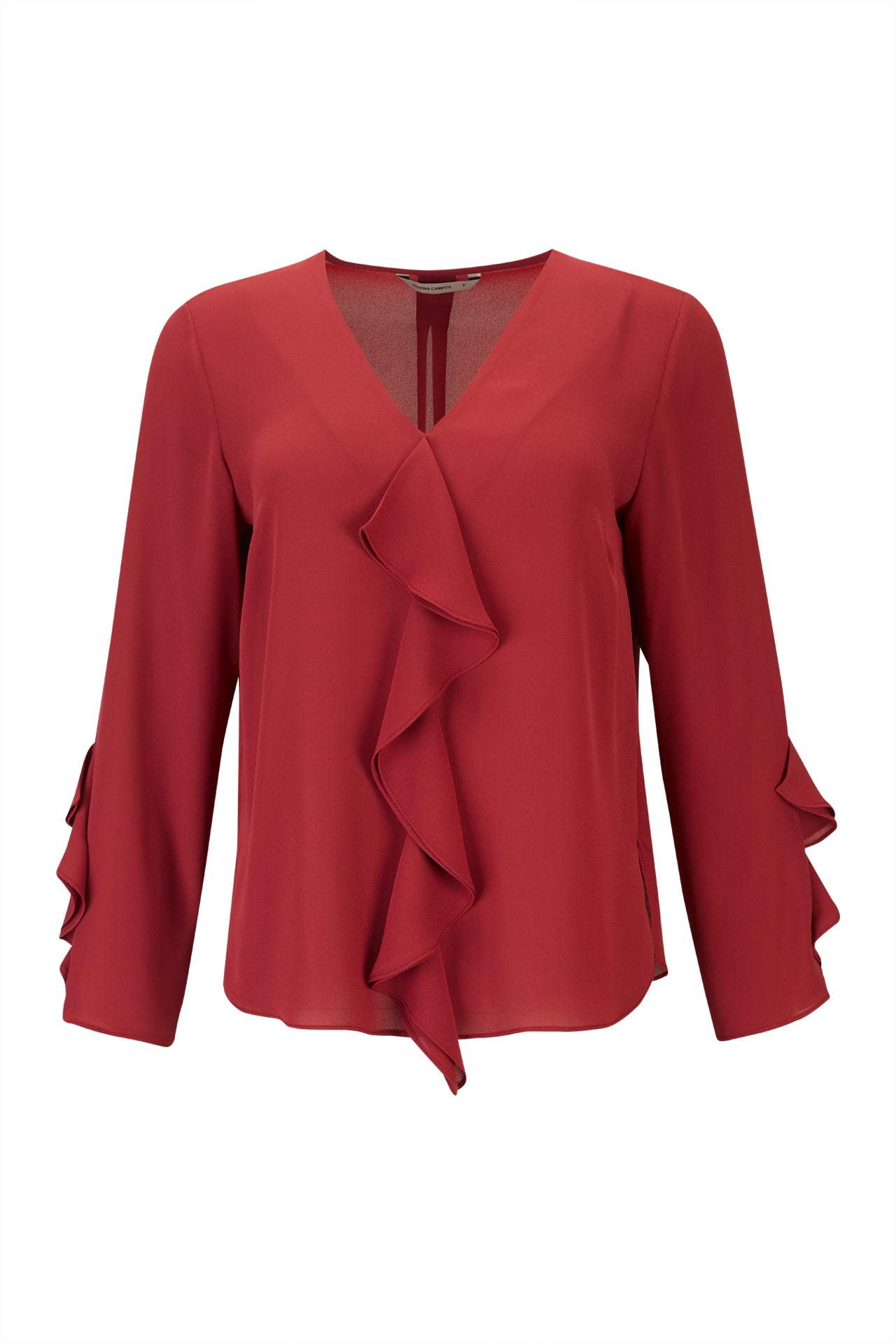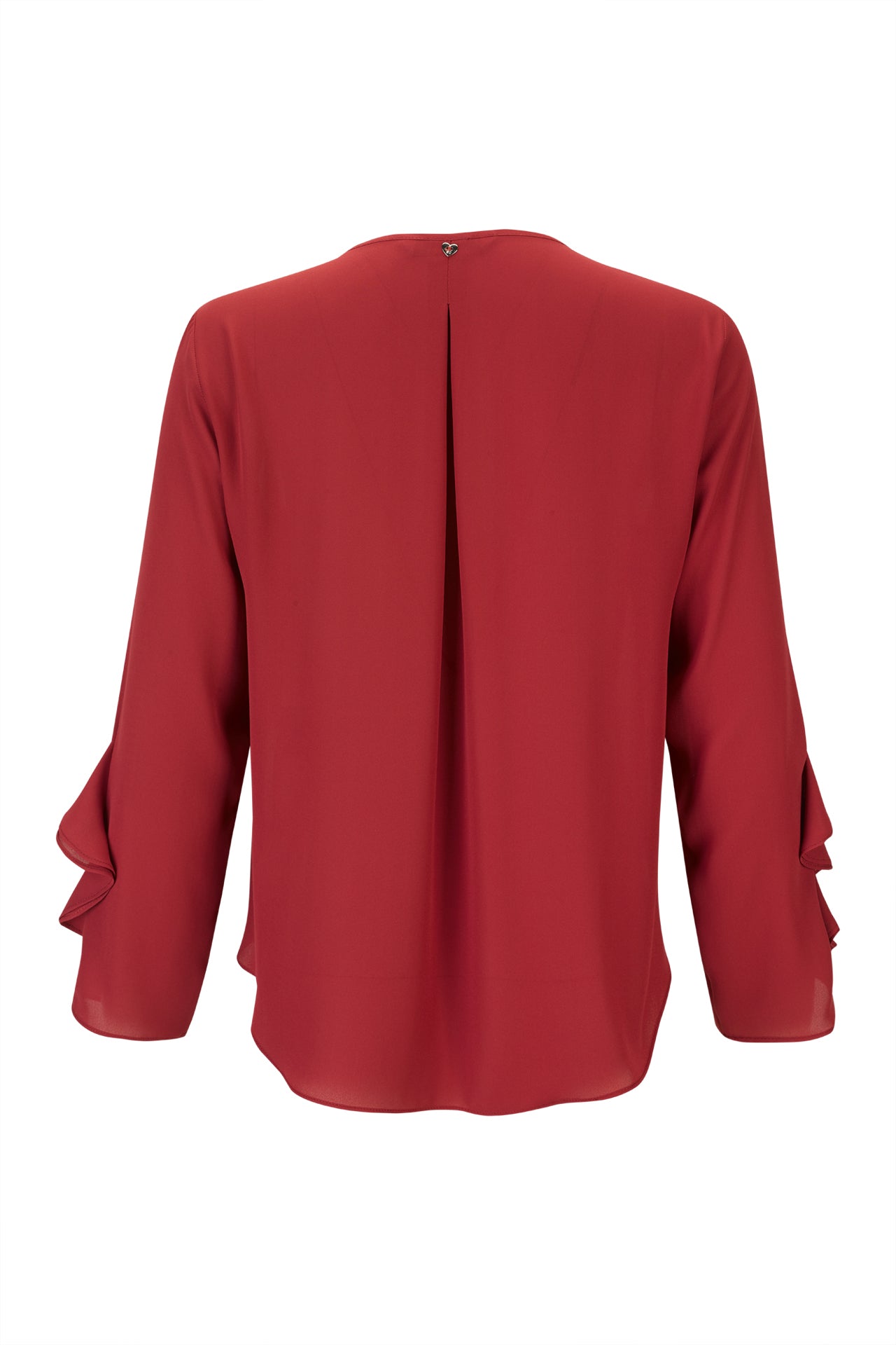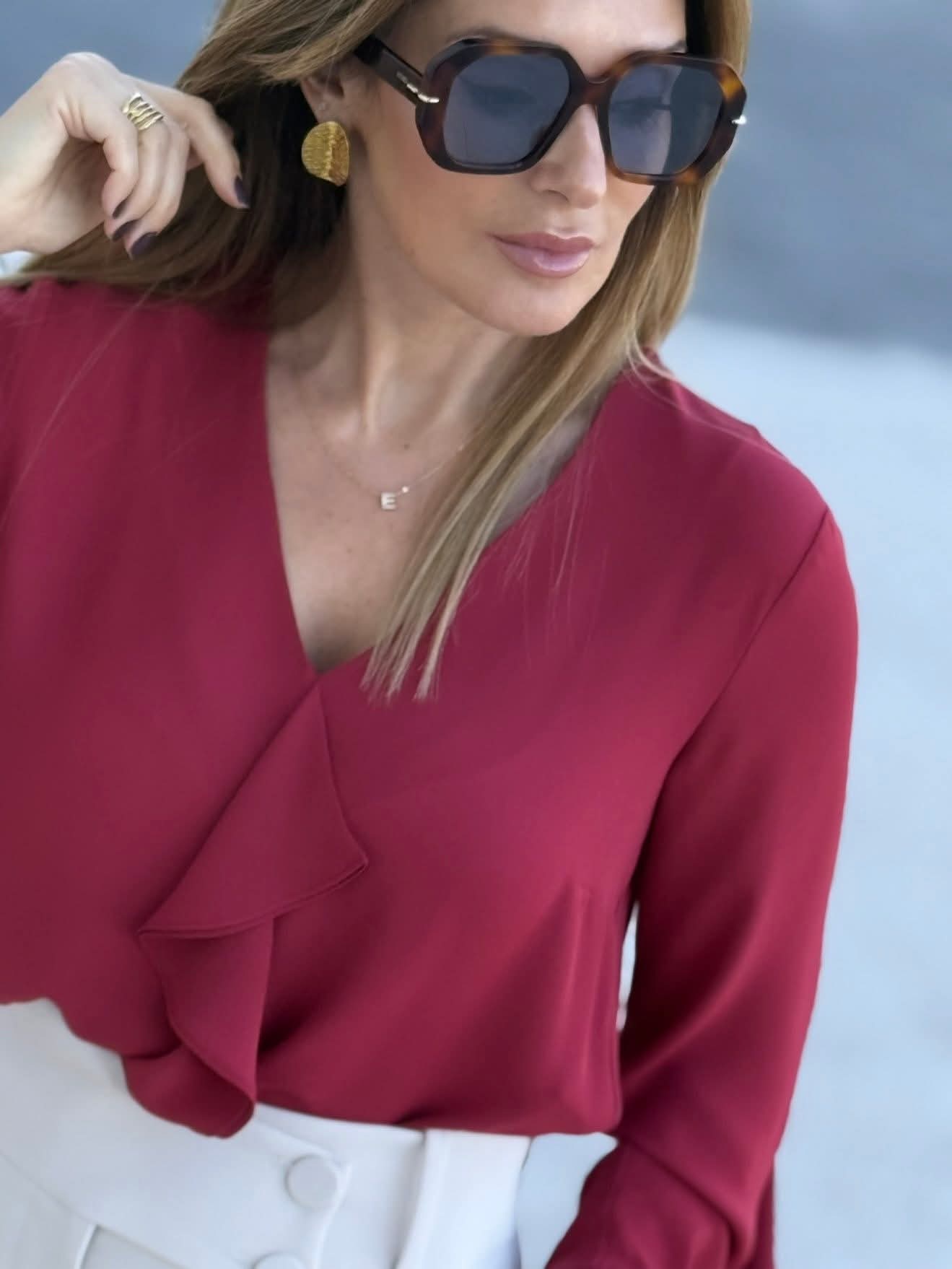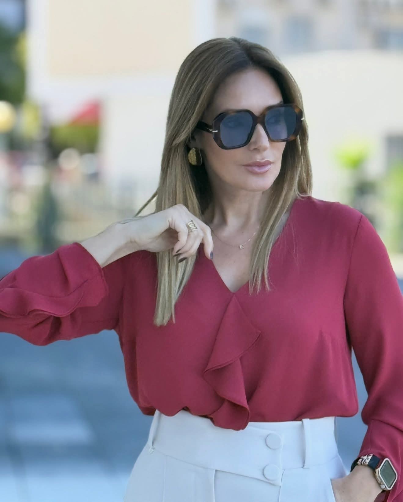 A túnica Silvina Campos destaca-se pelos detalhes femininos e sofisticados. Com decote em V, apresenta folhos aplicados na frente e nas mangas, realçados por debruados a preto que criam um contraste elegante. O detalhe de macho nas costas garante movimento e fluidez ao caimento, tornando a peça versátil para diferentes ocasiões.