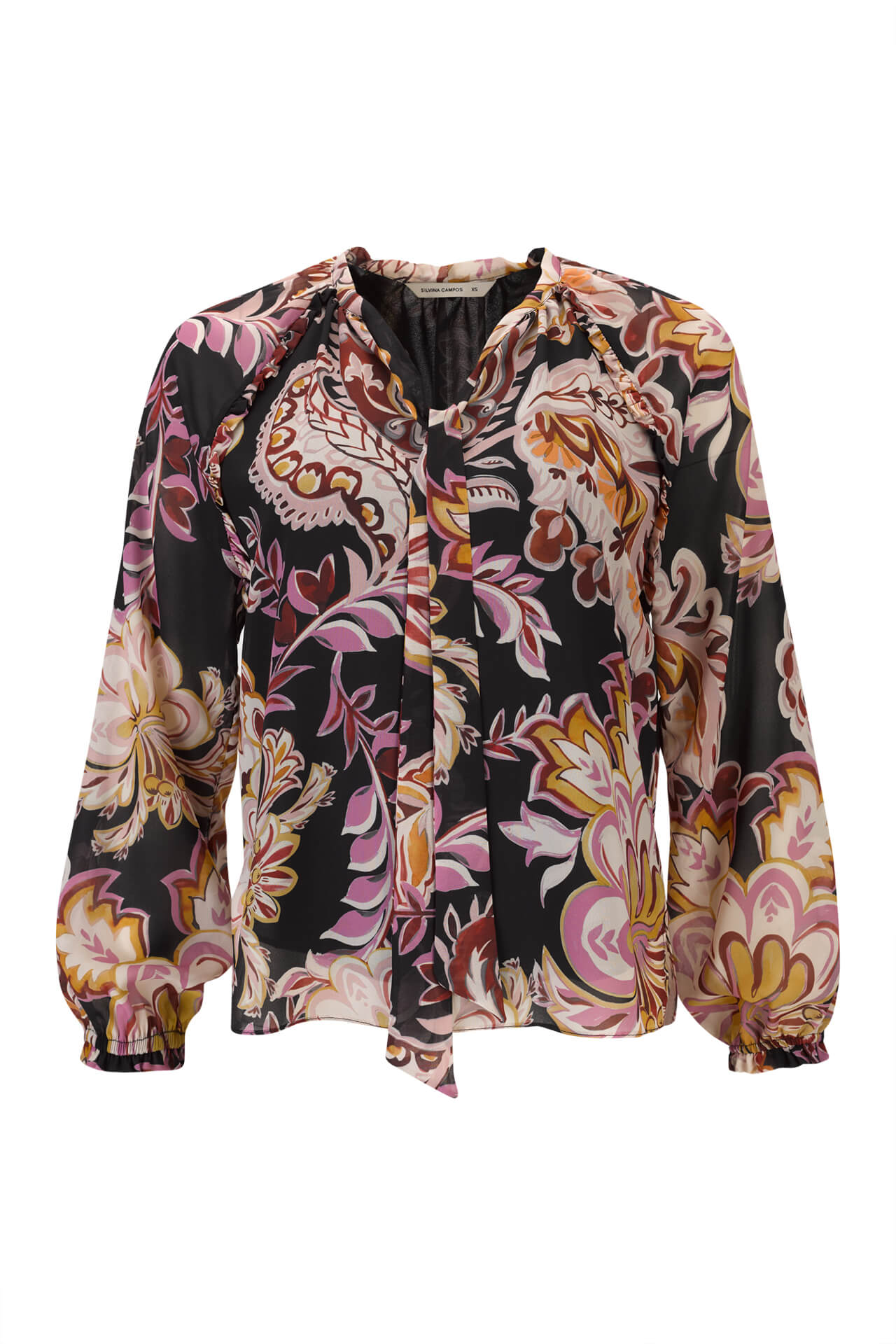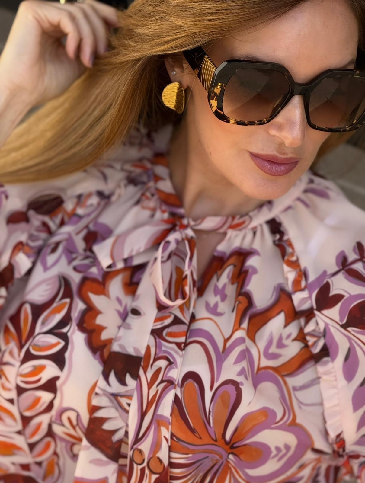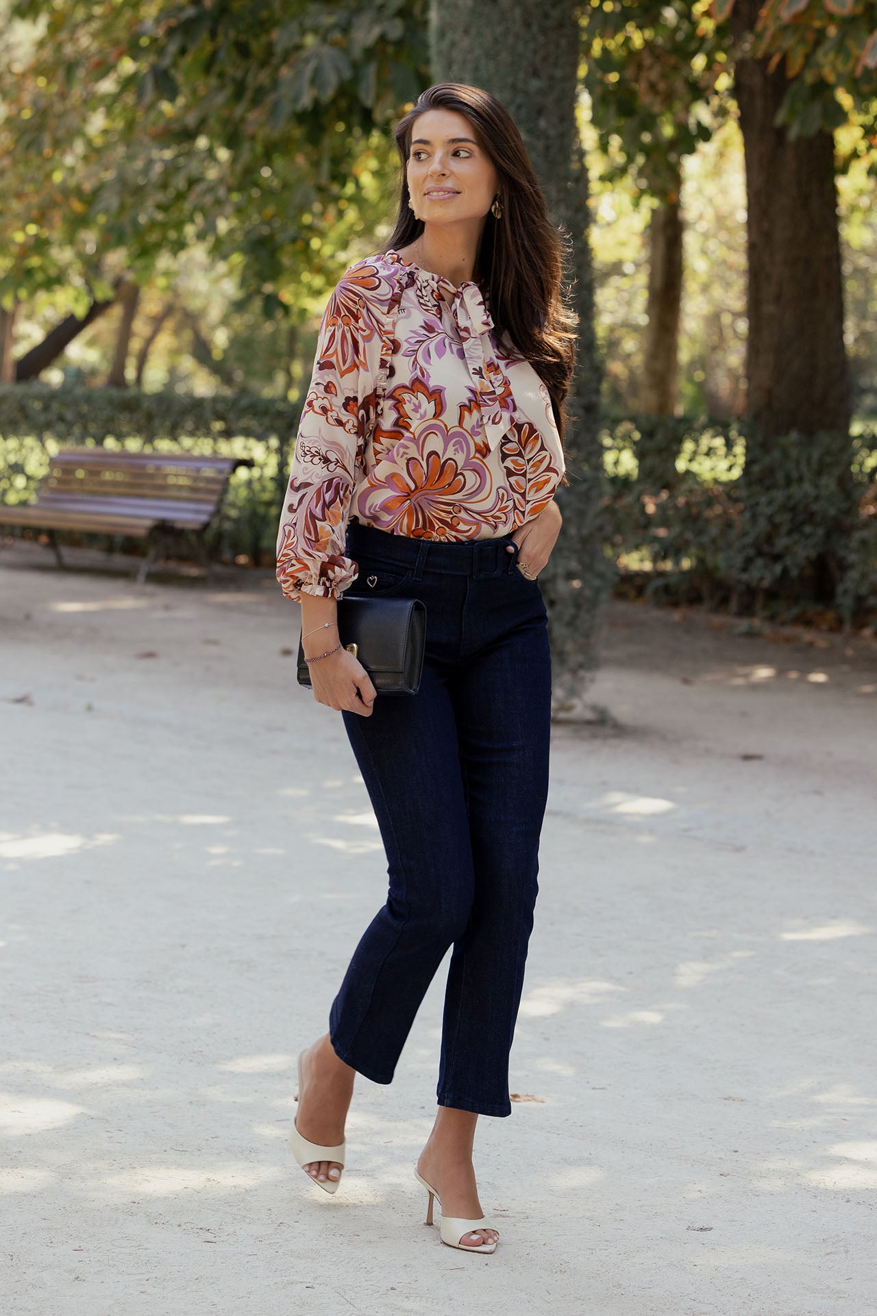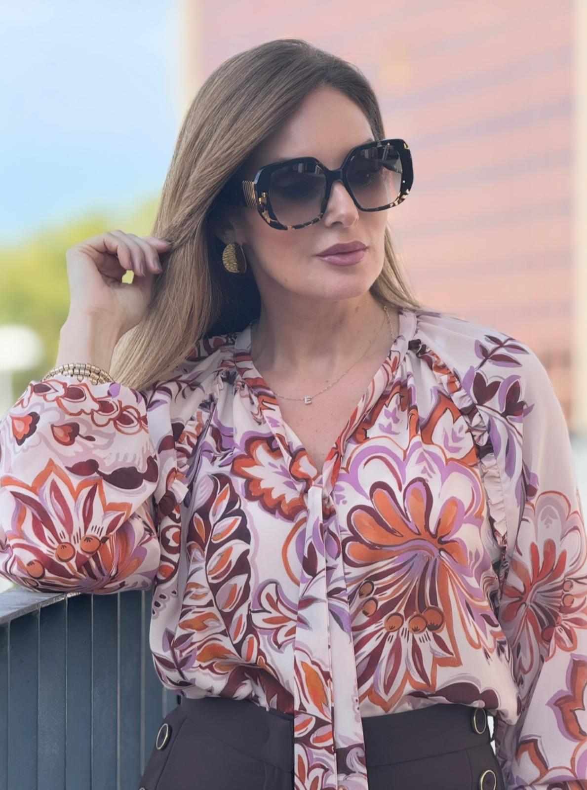 Túnica Silvina Campos com decote em V e laçada na gola, oferecendo um toque feminino e elegante. Os punhos elásticos com pequenos folhos adicionam movimento e delicadeza à peça. Ideal para criar looks casuais ou coordenados sofisticados, mantendo conforto e estilo.