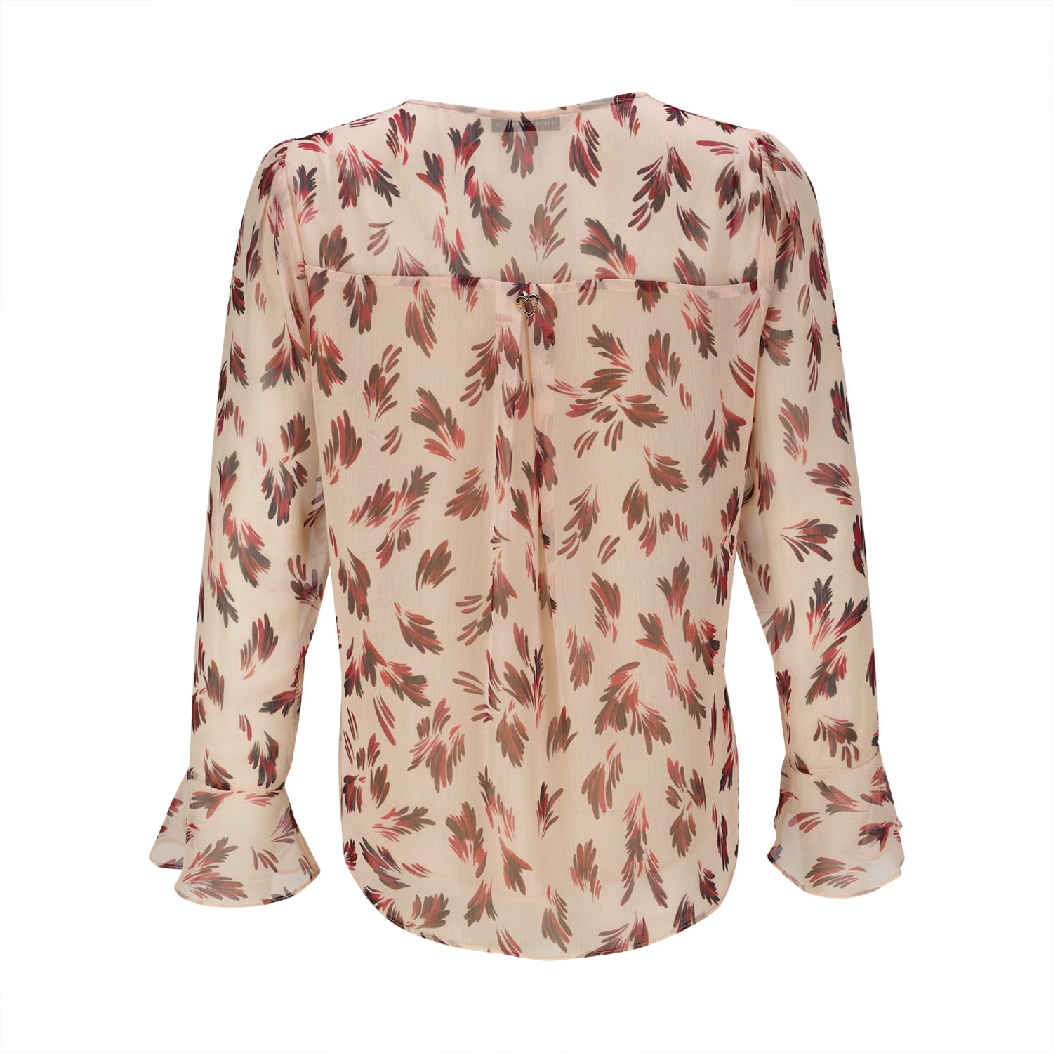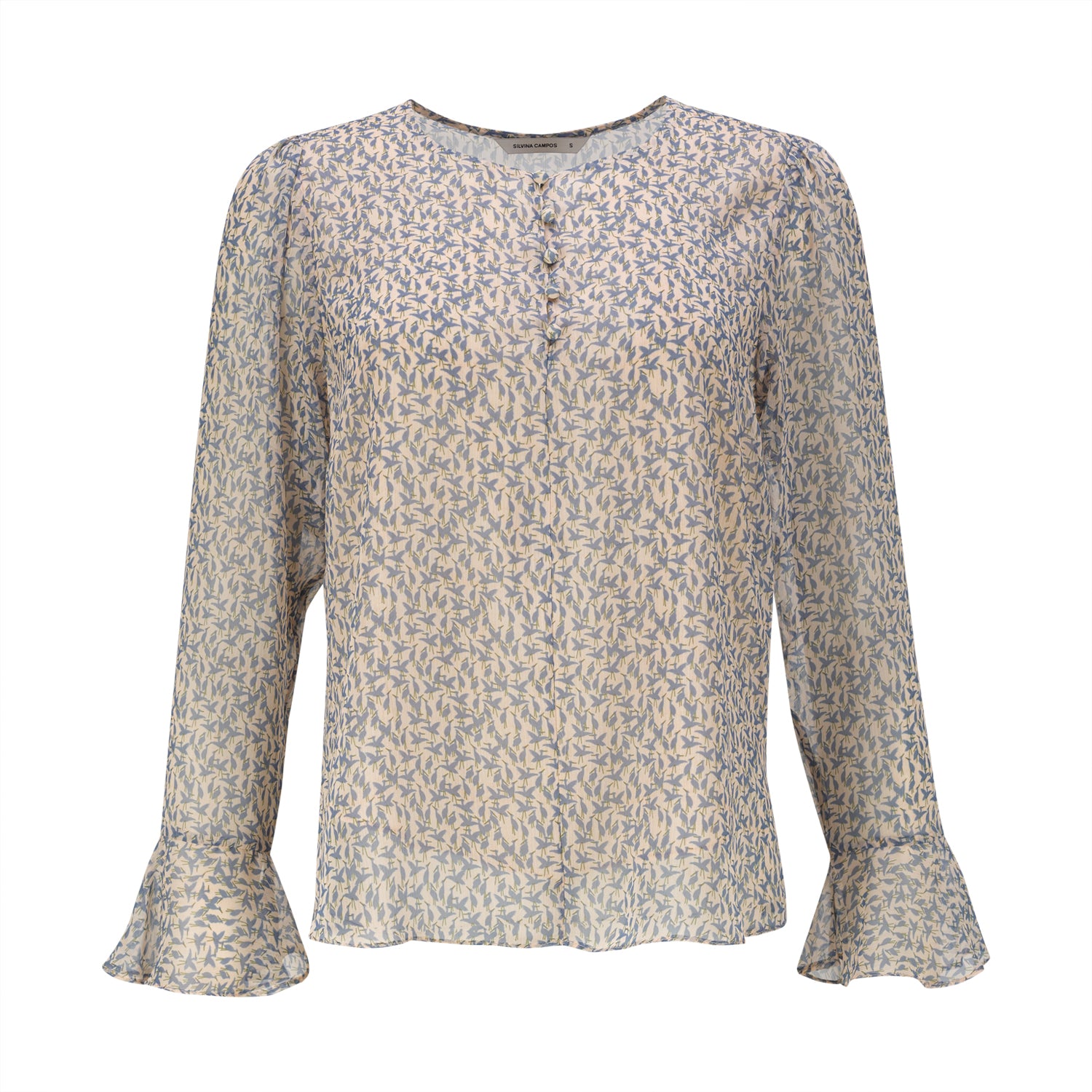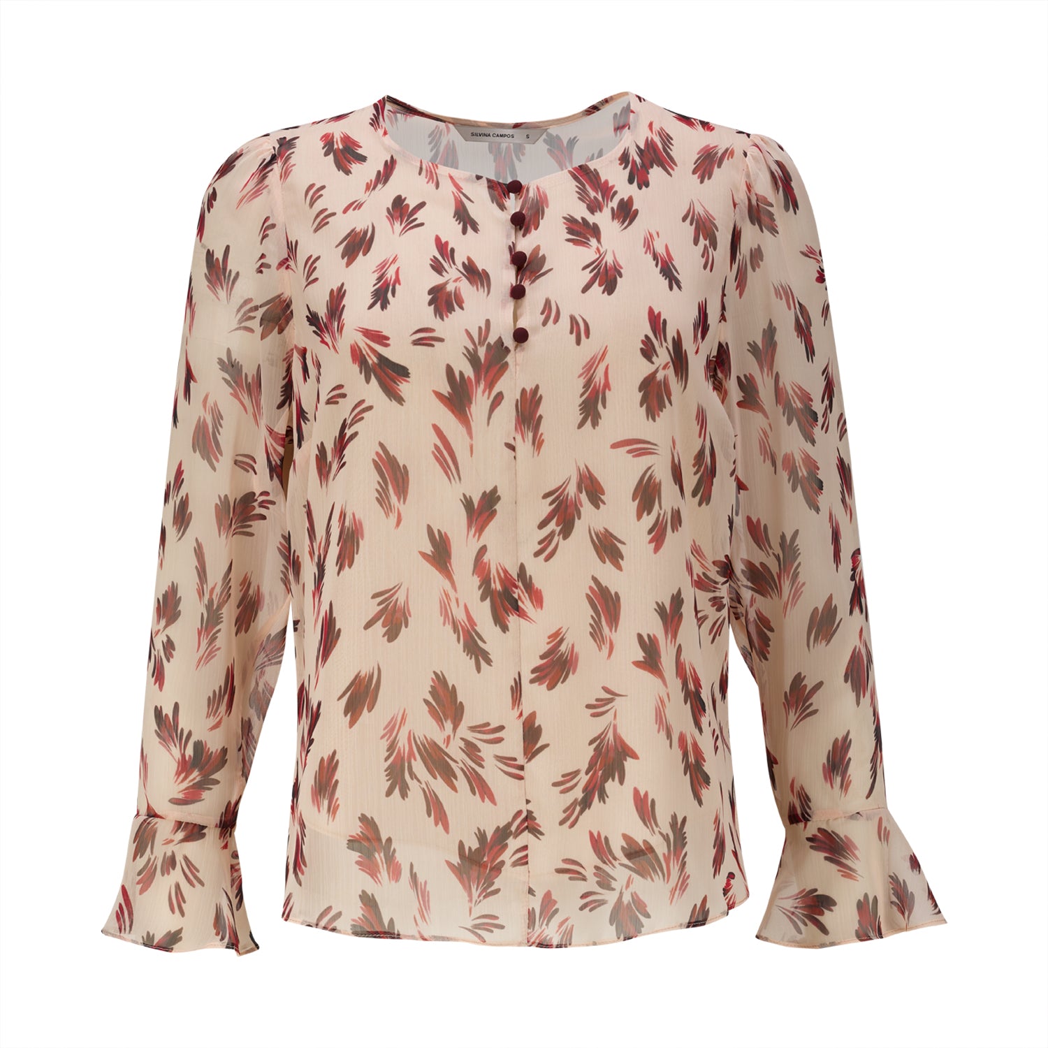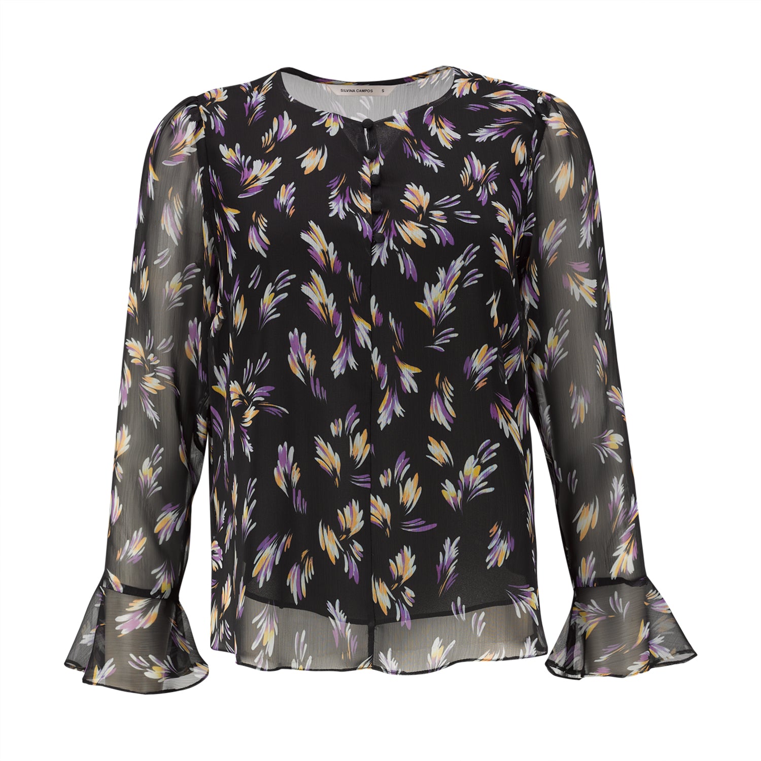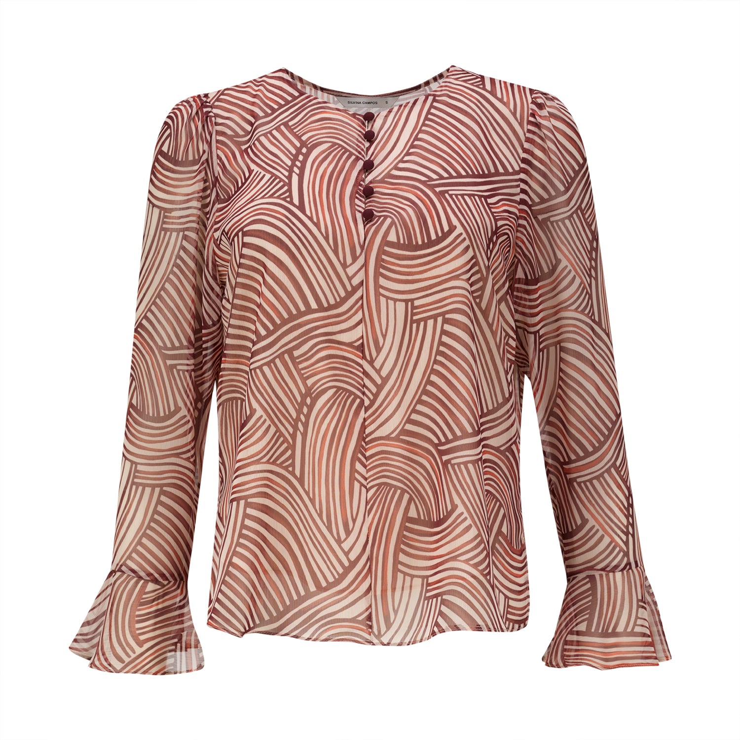 Túnica Silvina Campos em estampado abstrato, com mangas compridas e ligeira transparência que acrescenta leveza ao visual. Decote redondo elegante com cinco botões forrados, conferindo um acabamento delicado e sofisticado. Uma peça versátil e feminina para looks do dia a dia ou ocasiões especiais.