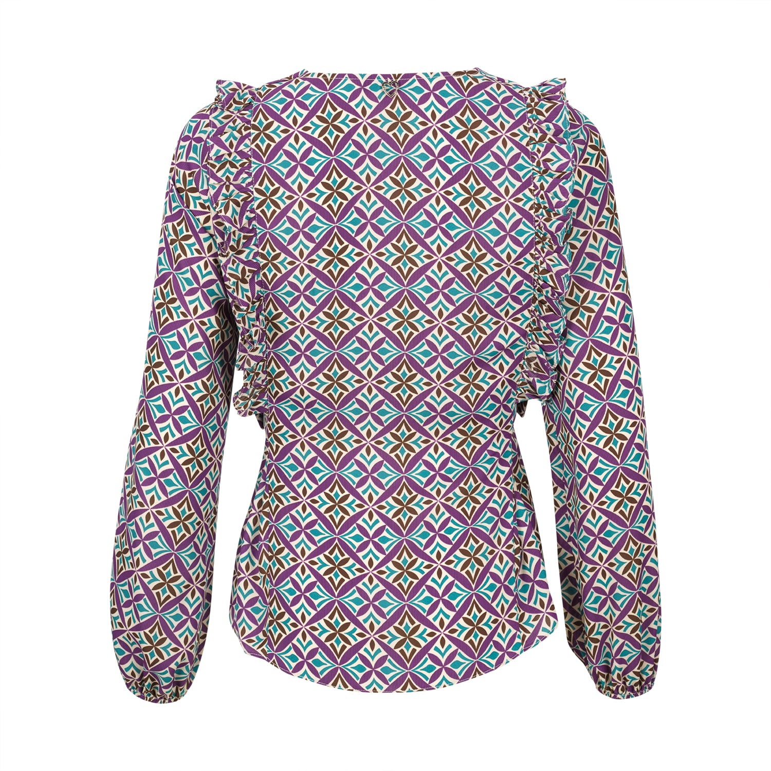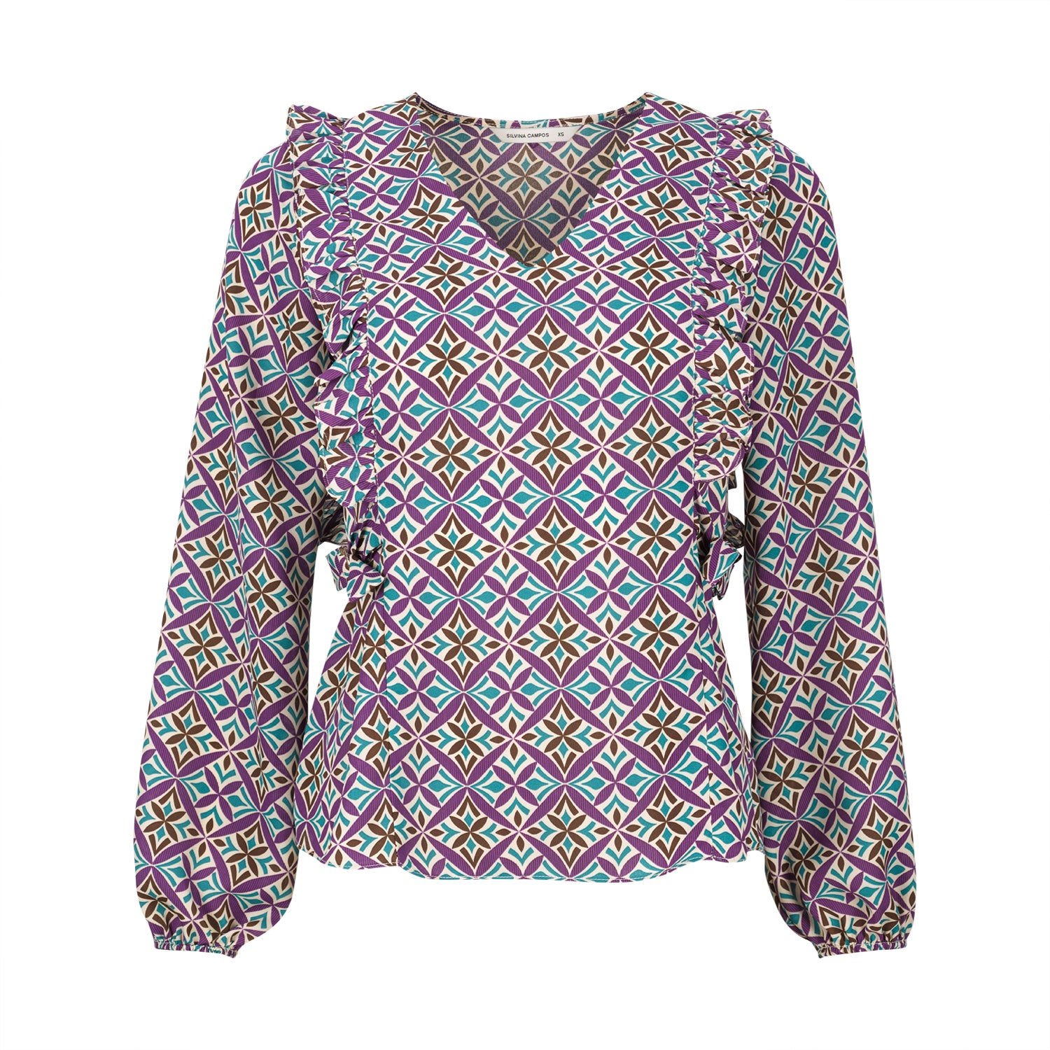 Túnica Silvina Campos com estampado geométrico, decote em V e manga comprida, pensada para dar expressão ao look sem perder elegância. Os folhos introduzem movimento e leveza, enquanto as fivelas laterais permitem ajustar a cintura de forma subtil, adaptando a silhueta e o conforto ao longo do dia. Uma peça versátil para coordenar com calças lisas ou denim escuro, ideal para contexto profissional ou ocasiões em que procura um visual cuidado com um toque contemporâneo.
