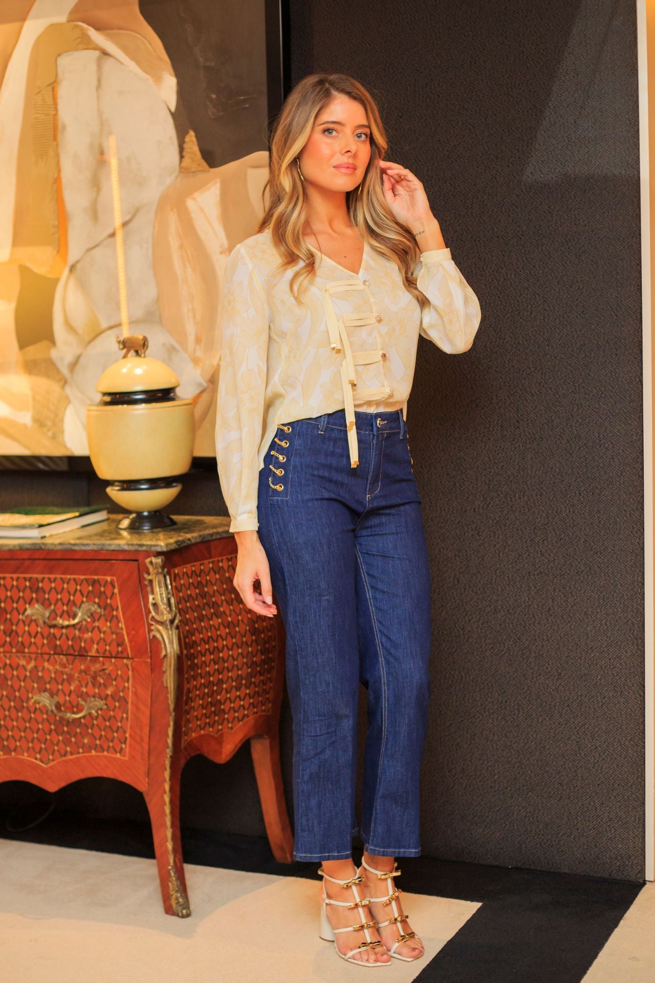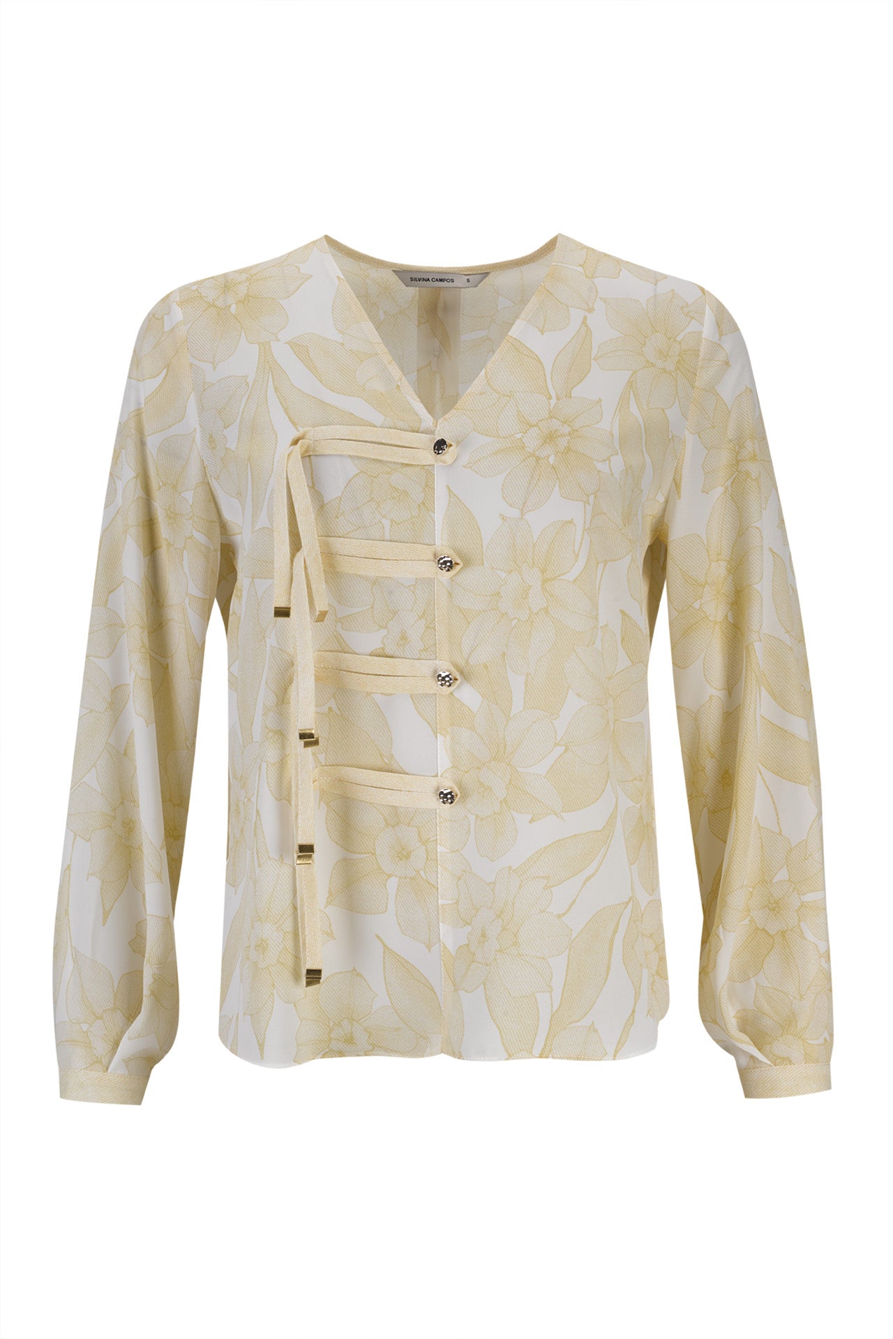 A túnica Silvina Campos com estampado floral e decote em bico é uma peça versátil, pensada para trazer cor e sofisticação de forma equilibrada. As quatro divisas frontais com botões dourados acrescentam um detalhe distintivo e refinado, criando estrutura visual sem comprometer a leveza do padrão. As mangas compridas tornam-na uma escolha segura para transições de estação e para coordenados mais compostos, do escritório a momentos sociais. Combine-a com calças de alfaiataria ou denim escuro para um conjunto contemporâneo, com um acabamento cuidado e intencional.