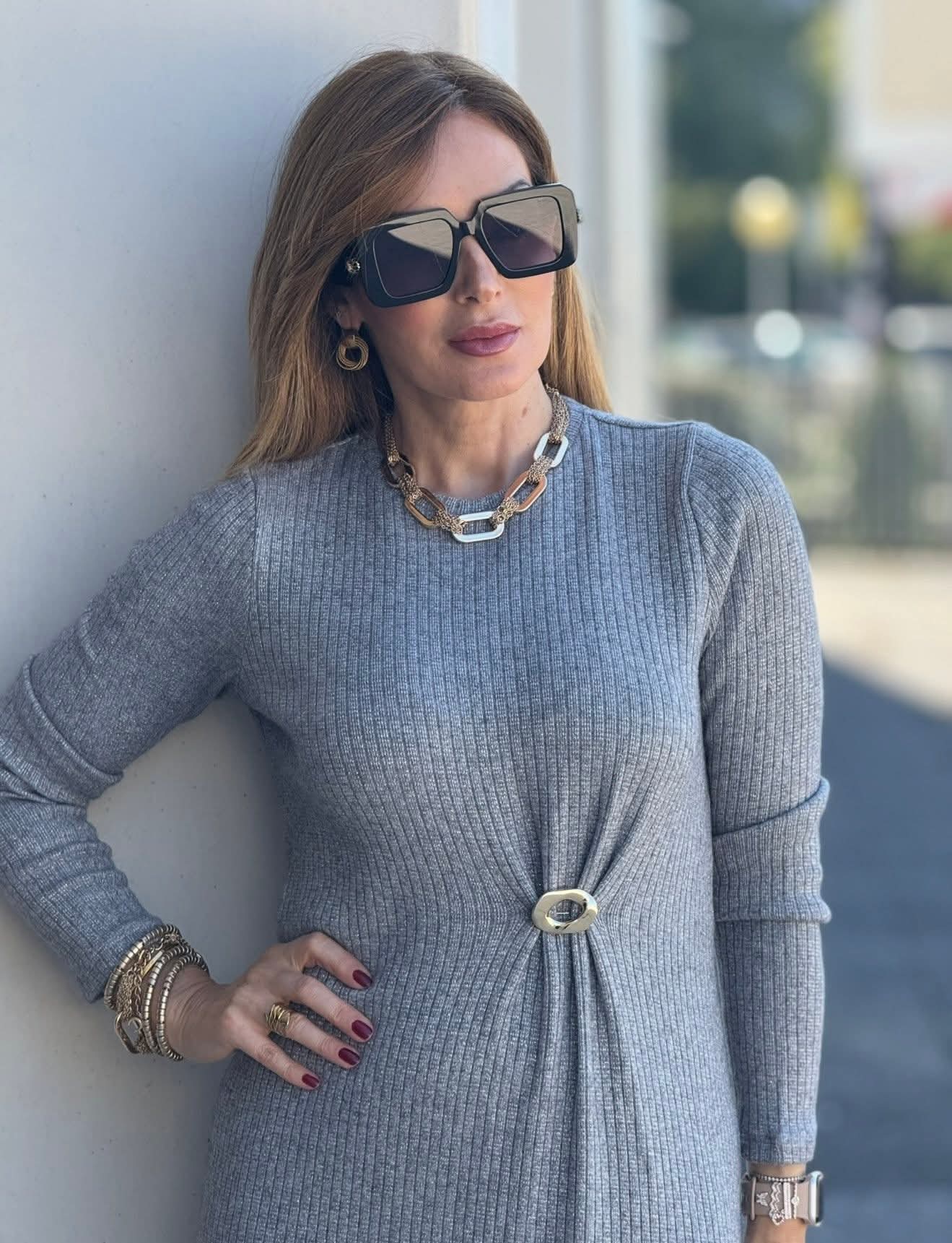 Vestido de malha Fé midi, com manga comprida e decote redondo clássico. Apresenta detalhe dourado com grampeado no centro, que adiciona sofisticação e um toque de brilho discreto à peça. Ideal para looks elegantes e confortáveis em diferentes ocasiões.