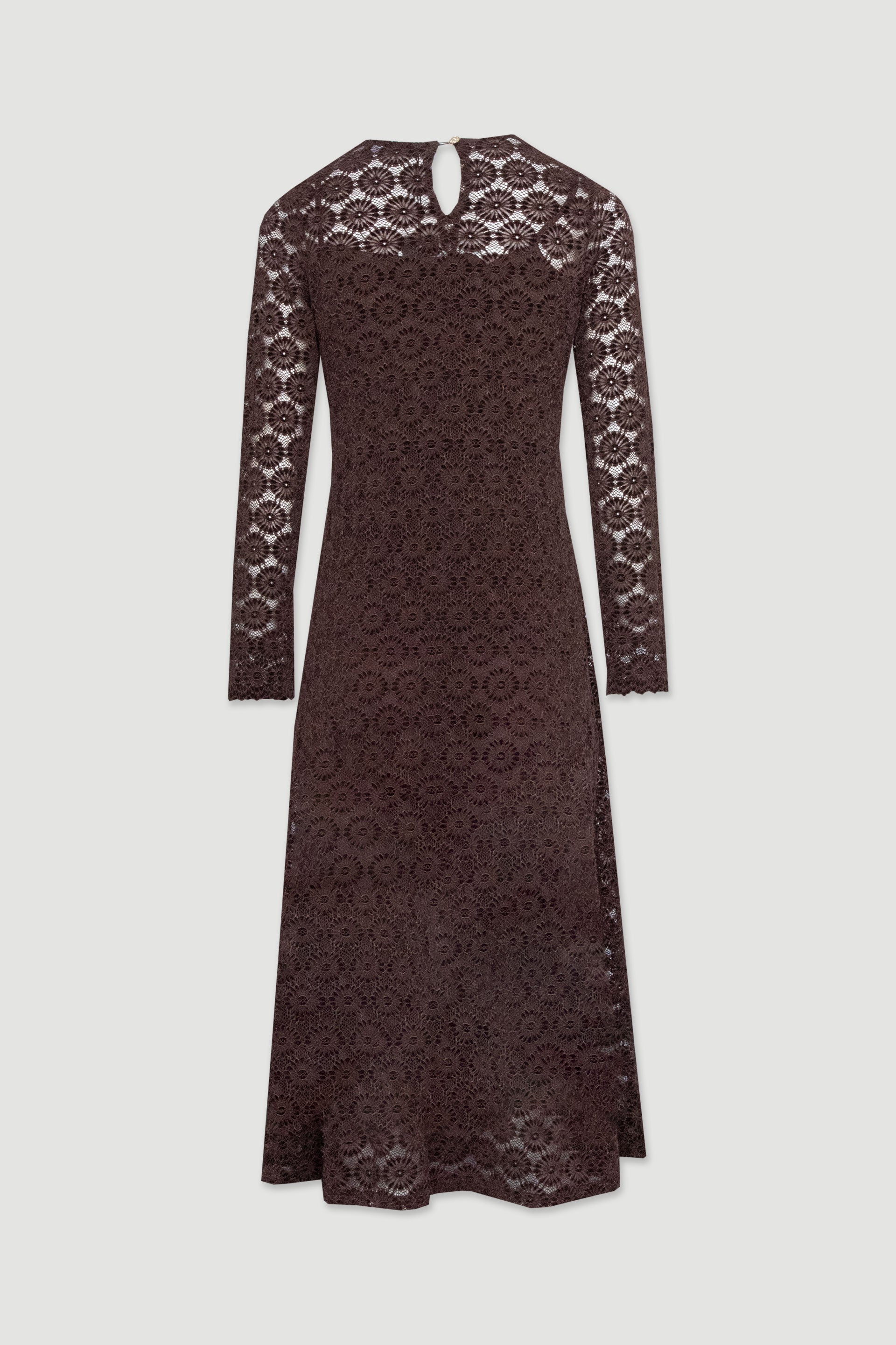 Vestido midi Ferrache em renda com motivo de flores circulares, destacado pelas mangas compridas e pelo corte evasé que oferece movimento elegante. Apresenta decote redondo e forro interior curto, criando um subtil contraste de transparências que valoriza a renda. Nas costas, o fecho com pequena abertura e botão acrescenta um toque delicado ao design.