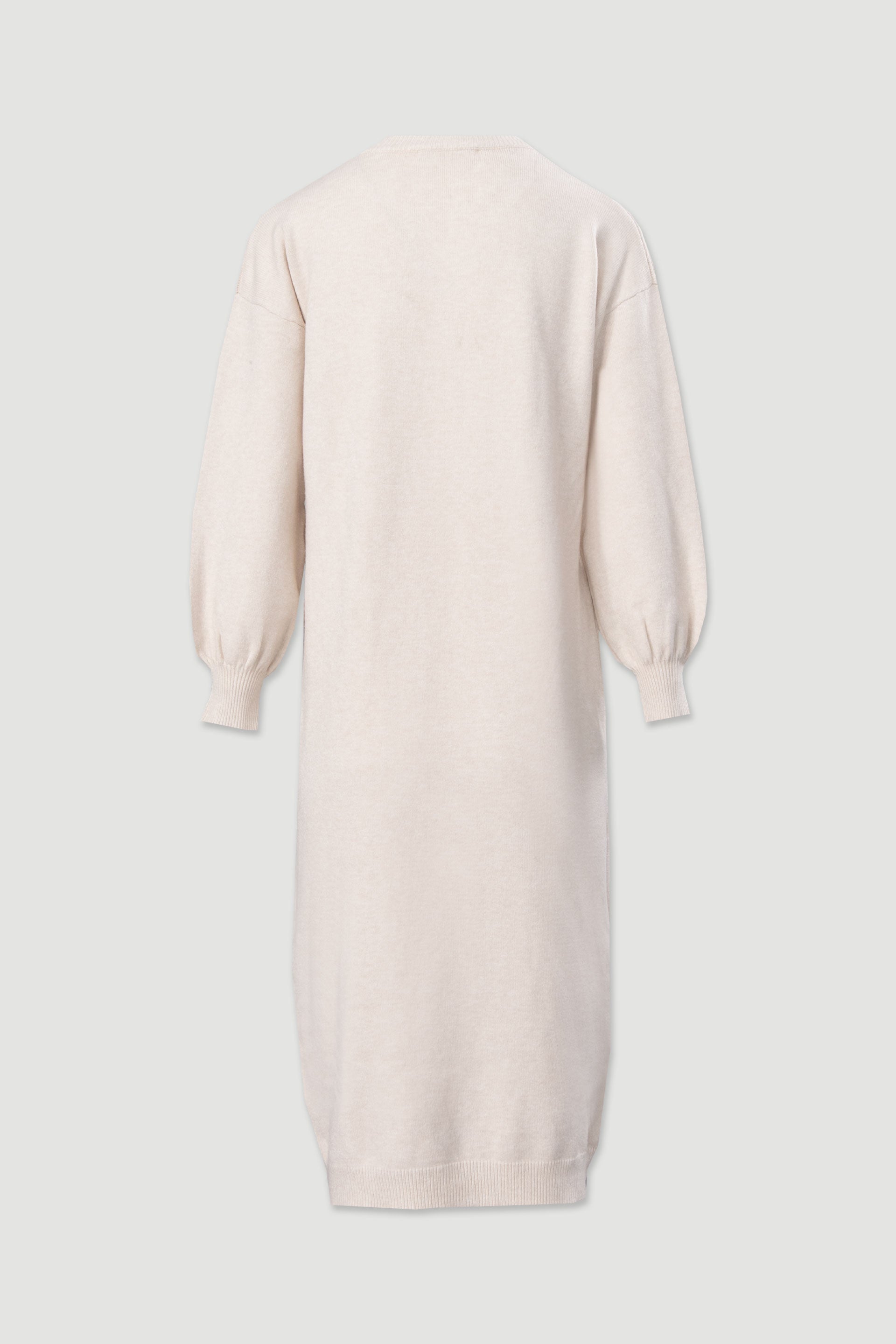Vestido midi Ferrache em malha com corte direito, perfeito para um look elegante e confortável. Apresenta decote redondo, mangas compridas com efeito abalonado e punhos canelados, além de detalhe trabalhado nos ombros que adiciona sofisticação à peça. Ideal para ocasiões casuais ou mais formais.