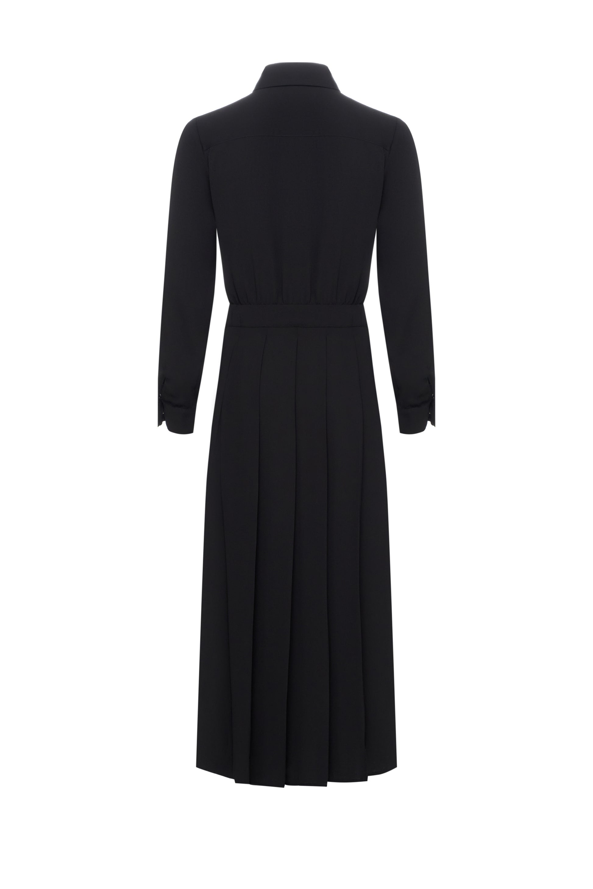 Vestido Liu Jo em tecido crepe com design elegante e fluido. Apresenta colarinho clássico e carcela que oculta os botões frontais, mangas compridas com punhos abotoados e cinto no mesmo tecido com fivela metálica com o logotipo da marca. As abas tipo bolso no peito e a saia comprida plissada completam o visual sofisticado e feminino.